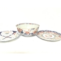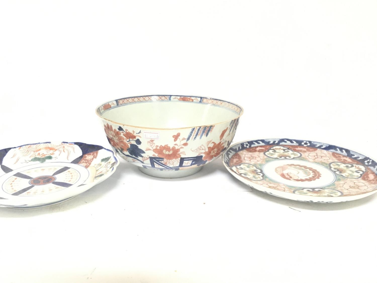 A Chinese 18th export porcelain century bowl and two Imari plate. Restoration and damage.