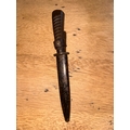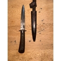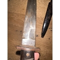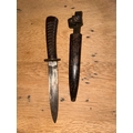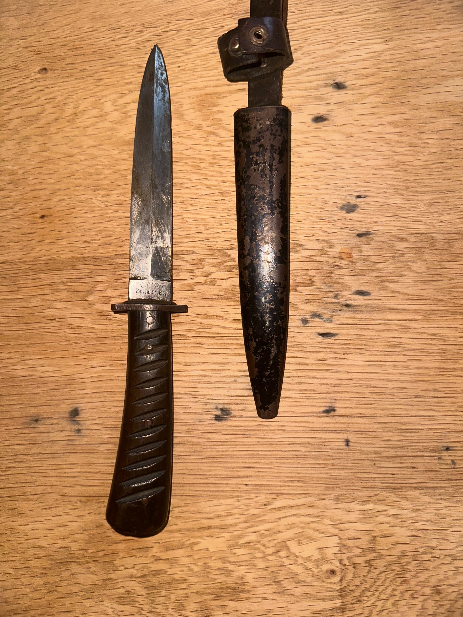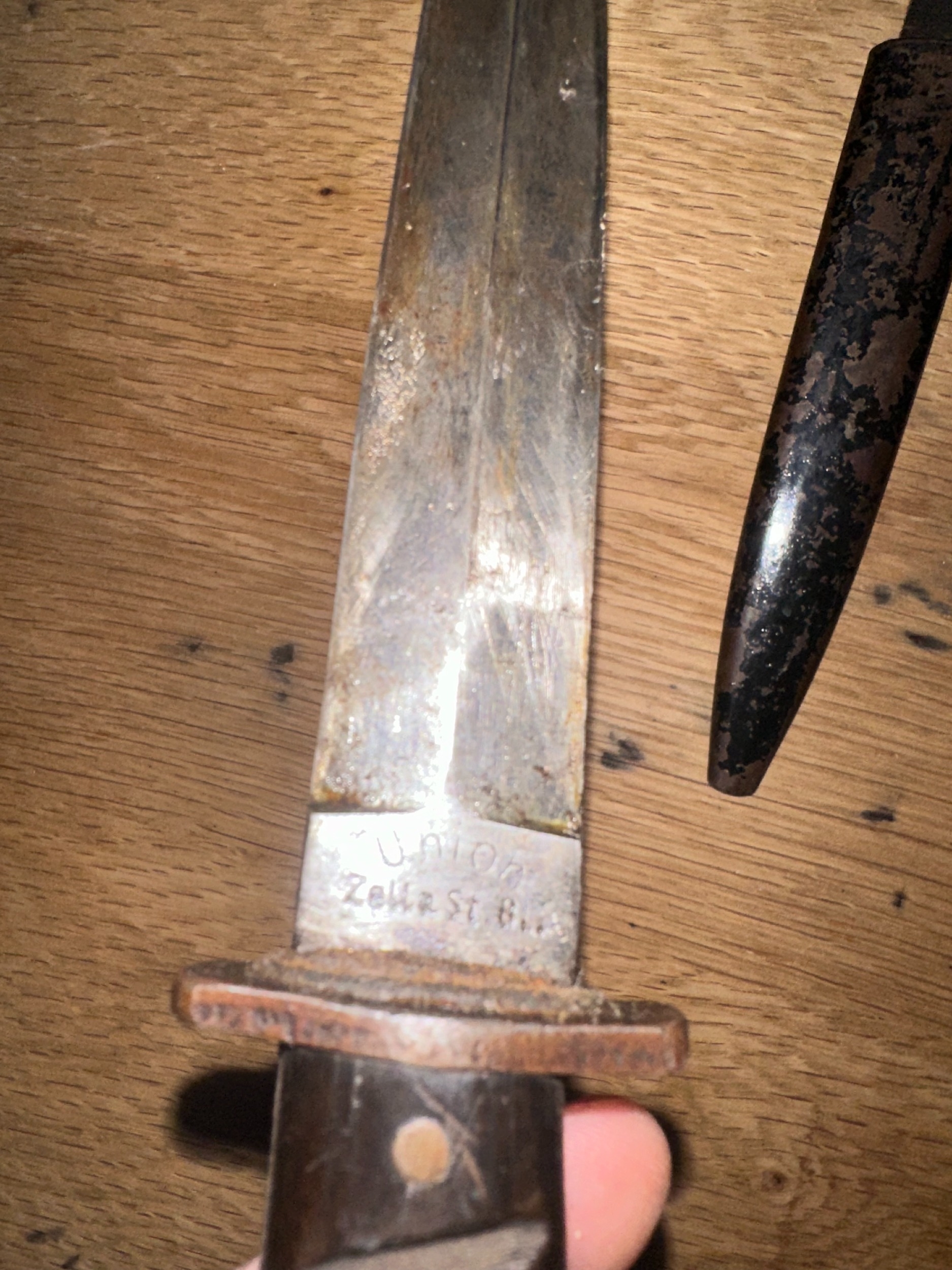 This lot consists of a fixed-blade military fighting knife, identified through consensus as a World War I Imperial German Army Nahkampfmesser (trench knife), and its associated metal scabbard. The knife features a heavily worn steel blade and a simple metal crossguard. The handle is dark, likely wood or composite material, characterized by pronounced horizontal ribbing designed for an ergonomic grip. The ricasso is stamped with the manufacturer's marking: UNION over Zella St. Bl. (referencing Zella-St. Blasii, Germany). The accompanying metal scabbard retains a dark, heavily chipped finish and is fitted with an integrated leather belt loop and retaining strap secured by a metal stud.