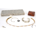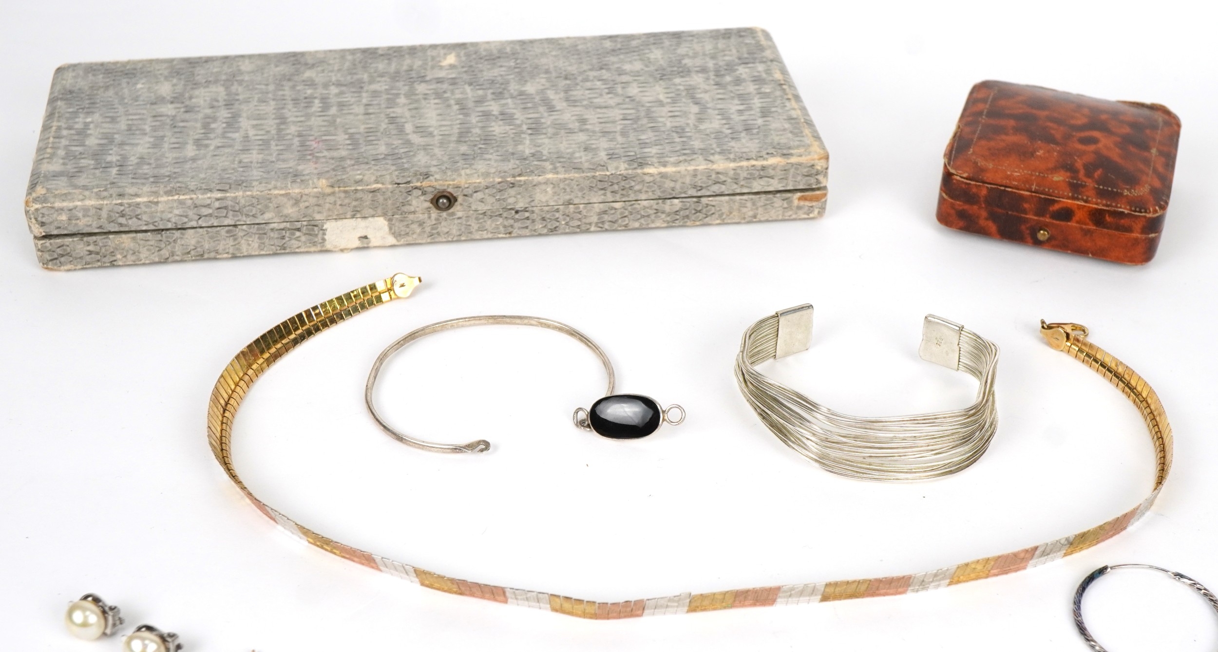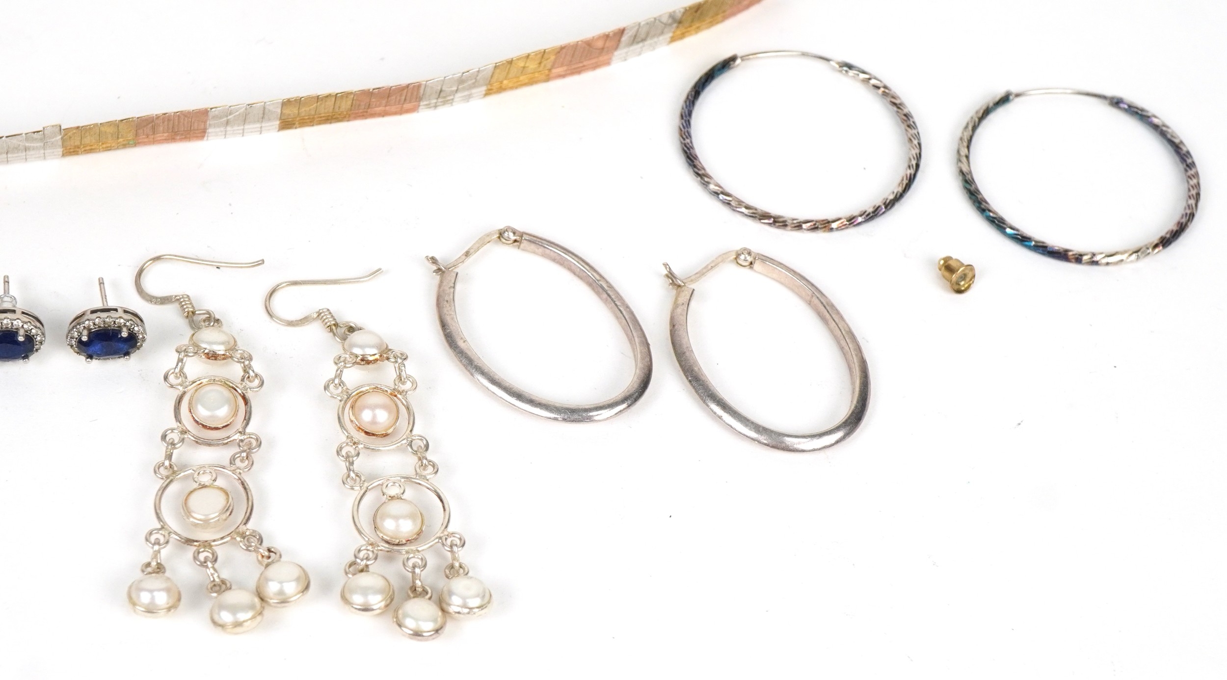 Silver and white metal jewellery including stud earrings, a silver gilt three tone necklace, hoop earrings and bangles, total weight 89.0g.