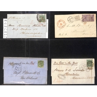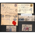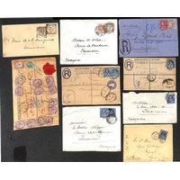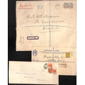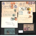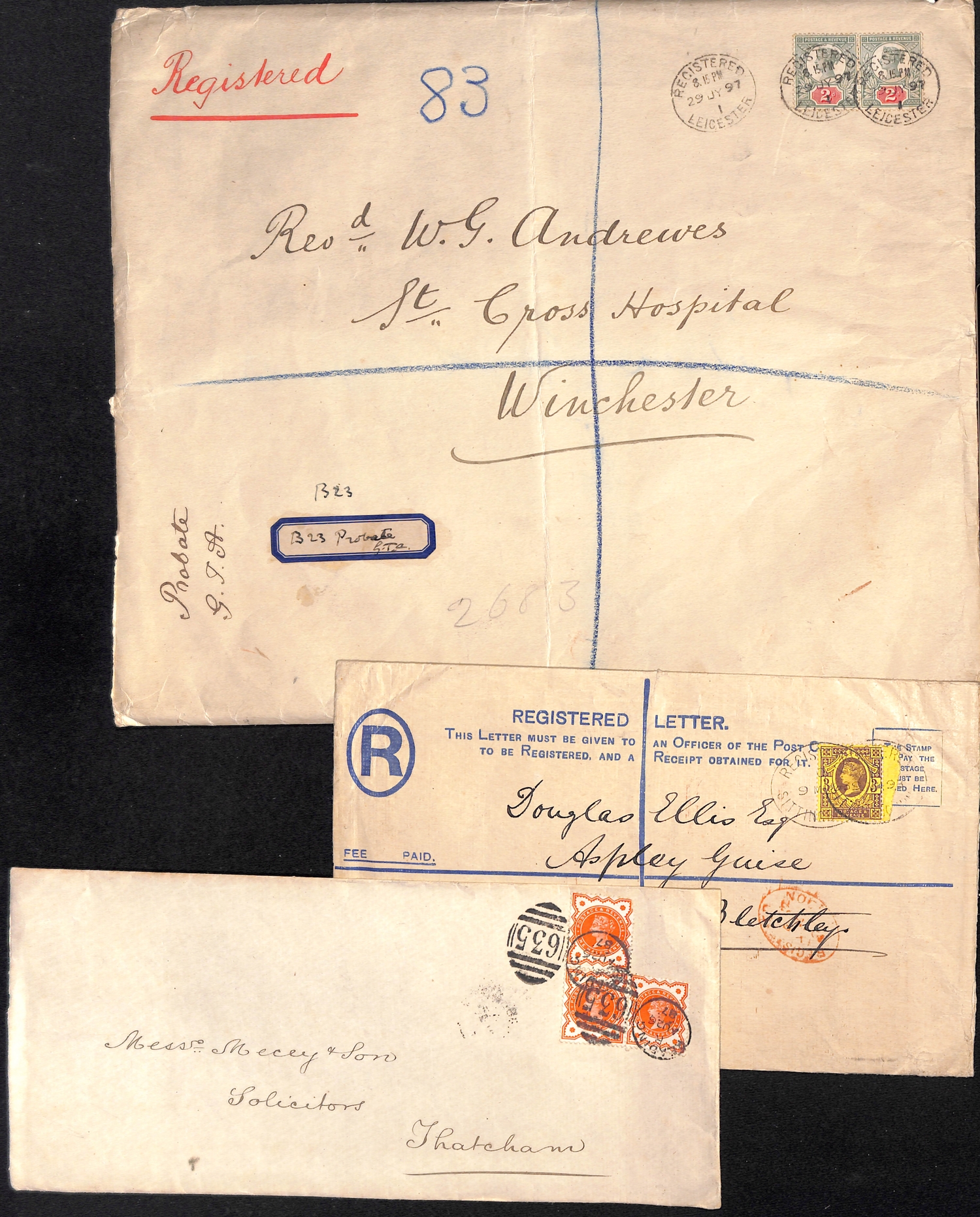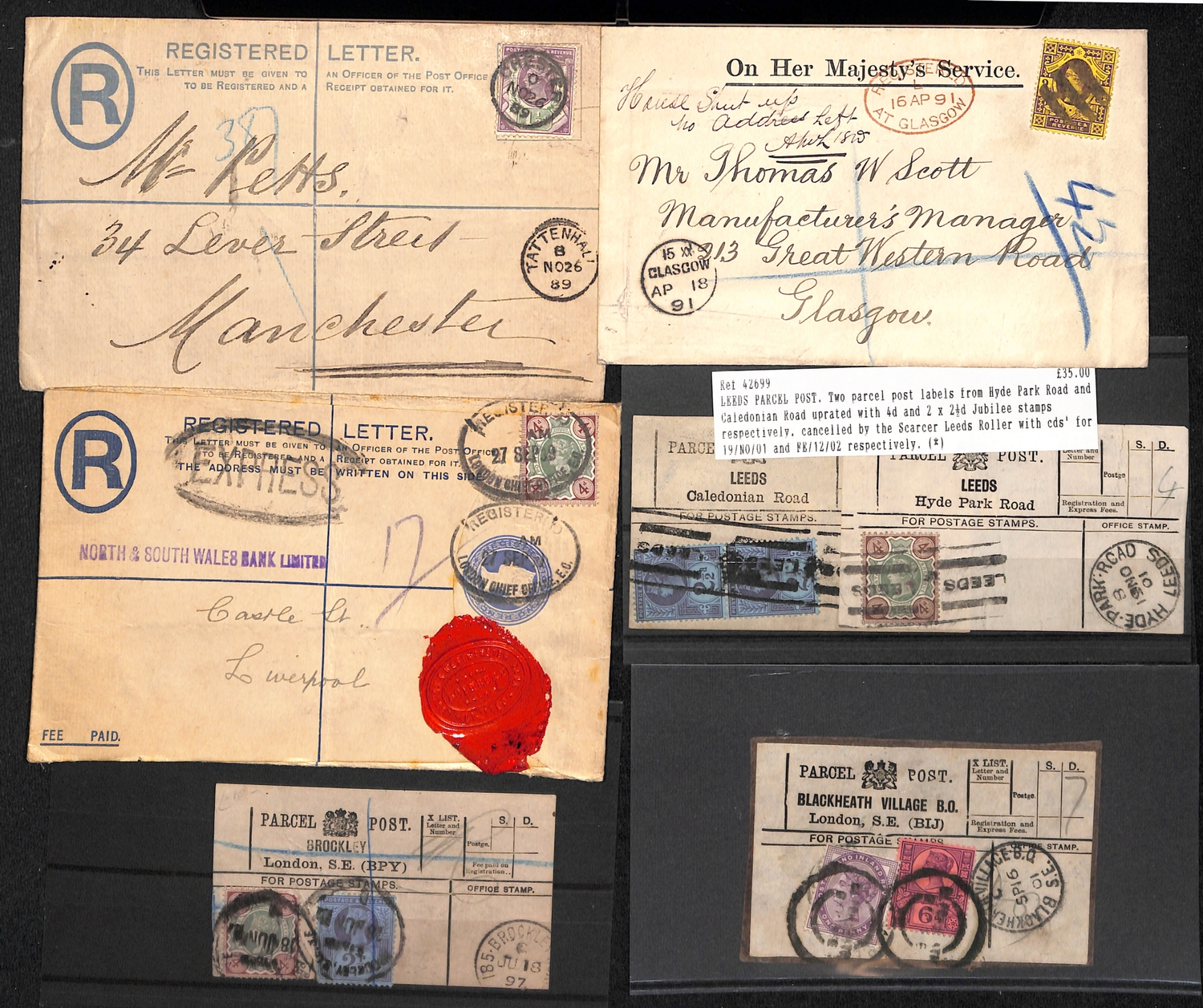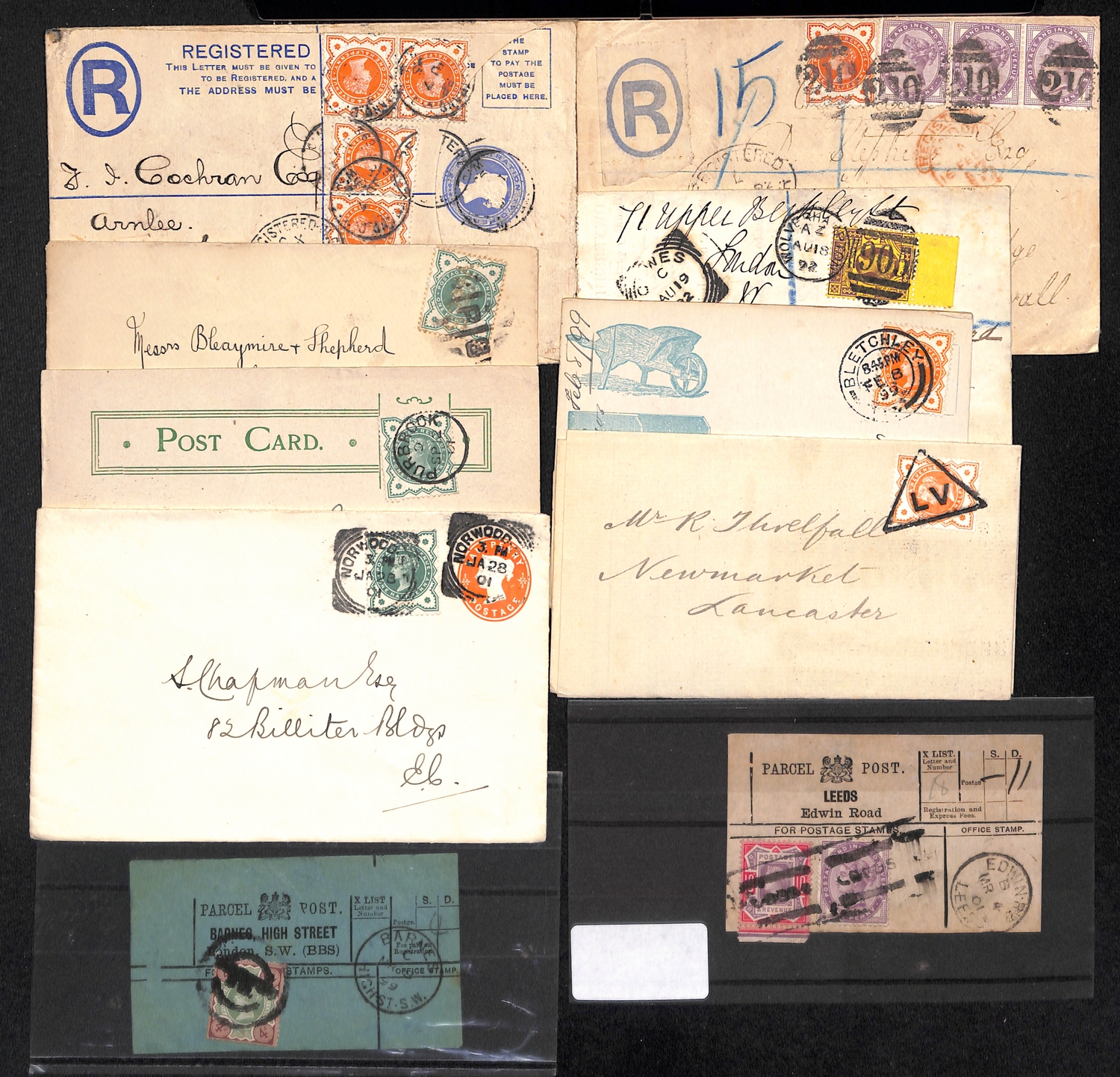 1887 Jubilee Issue. 1887-1901 Covers and entire letters (12), postcards (2) and Parcel Post labels (6), various inland rates including 2d registration envelope franked 4d with oval "EXPRESS" handstamp, 3d Notice of Objection rate, registered covers sent at 3d, 3½d, 4d or 5d rates, Parcel Post labels franked 4d, 5d, 6½d, 7d or 11d, etc. (20).