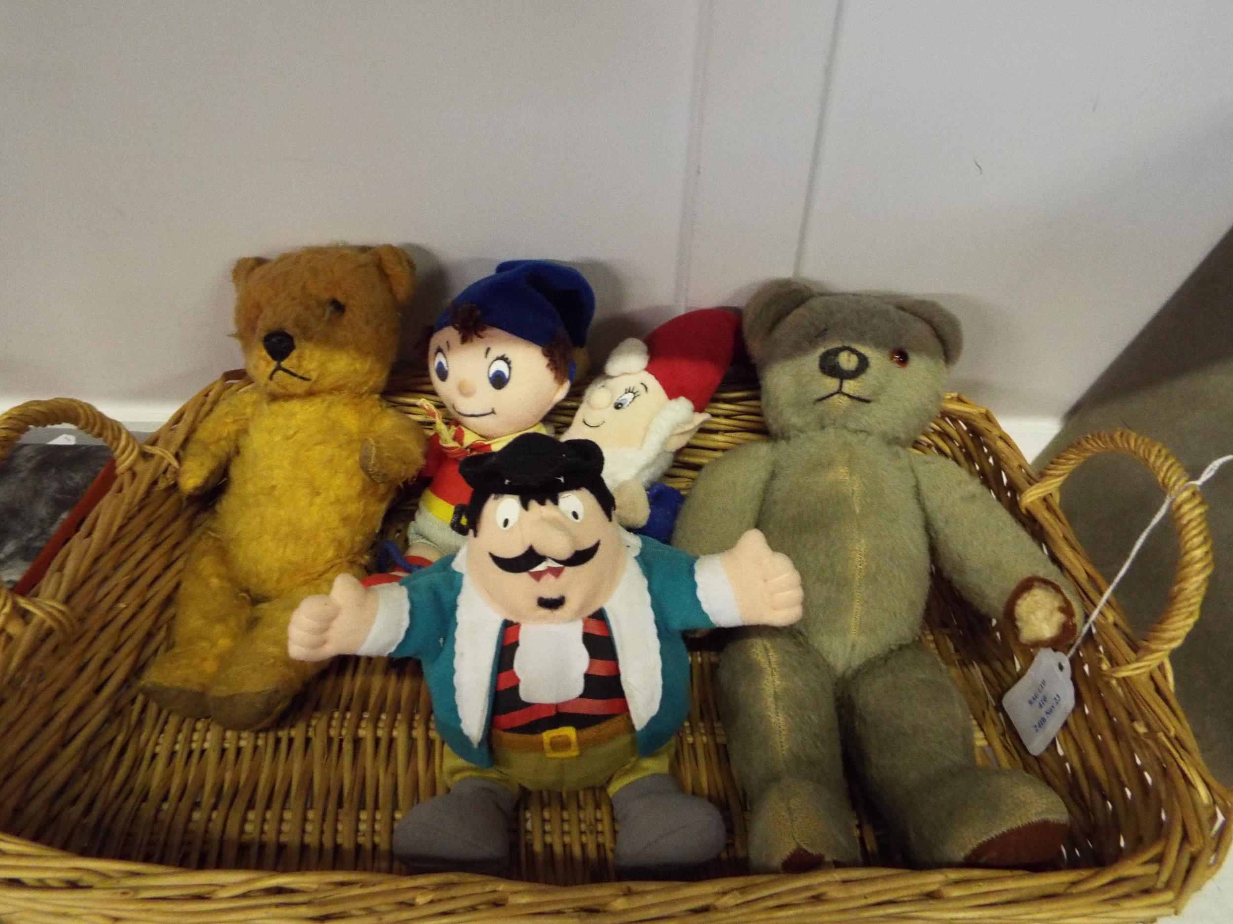 An old Chad Valley blue teddy bear and another together with three soft fabric toys, Captain Pugwash, Noddy and Big Ears