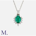 An Emerald and Diamond Pendant Necklace in 18K white gold, set with a pear-cut emerald (accompanied by a verbal gemological report from GCS stating it is of Columbian origin and minor oil treatment). With baguette, round and pear-cut diamonds in surround.