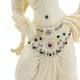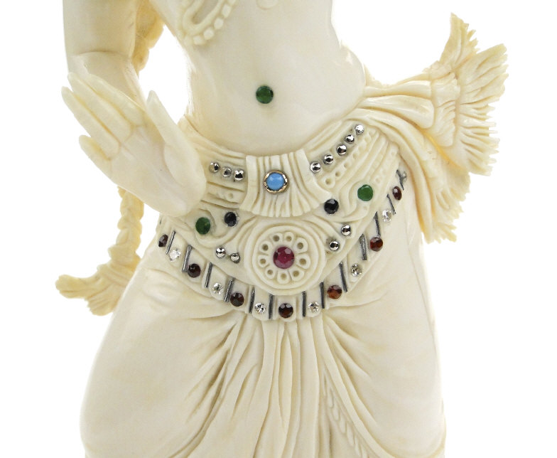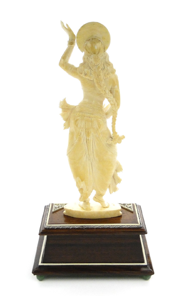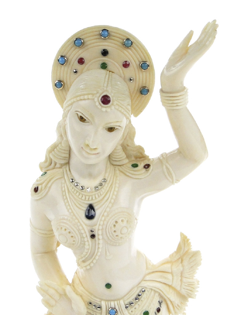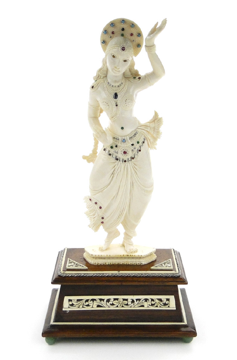 Carved ivory figure of a dancing Indian female with diamond, emerald, ruby and turquoise settings, raised on a hardwood plinth base with bone and ivory mounts, 28cm high
