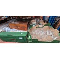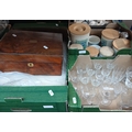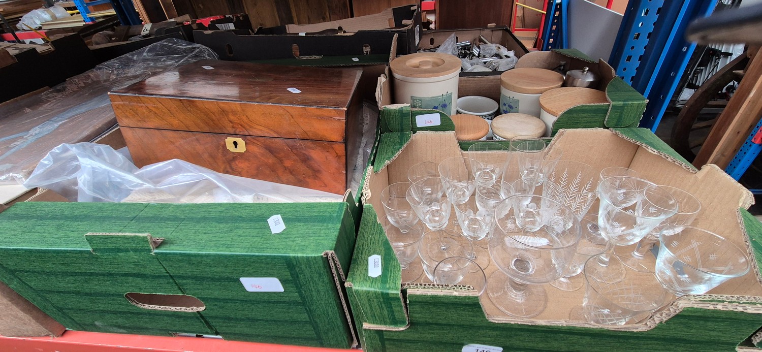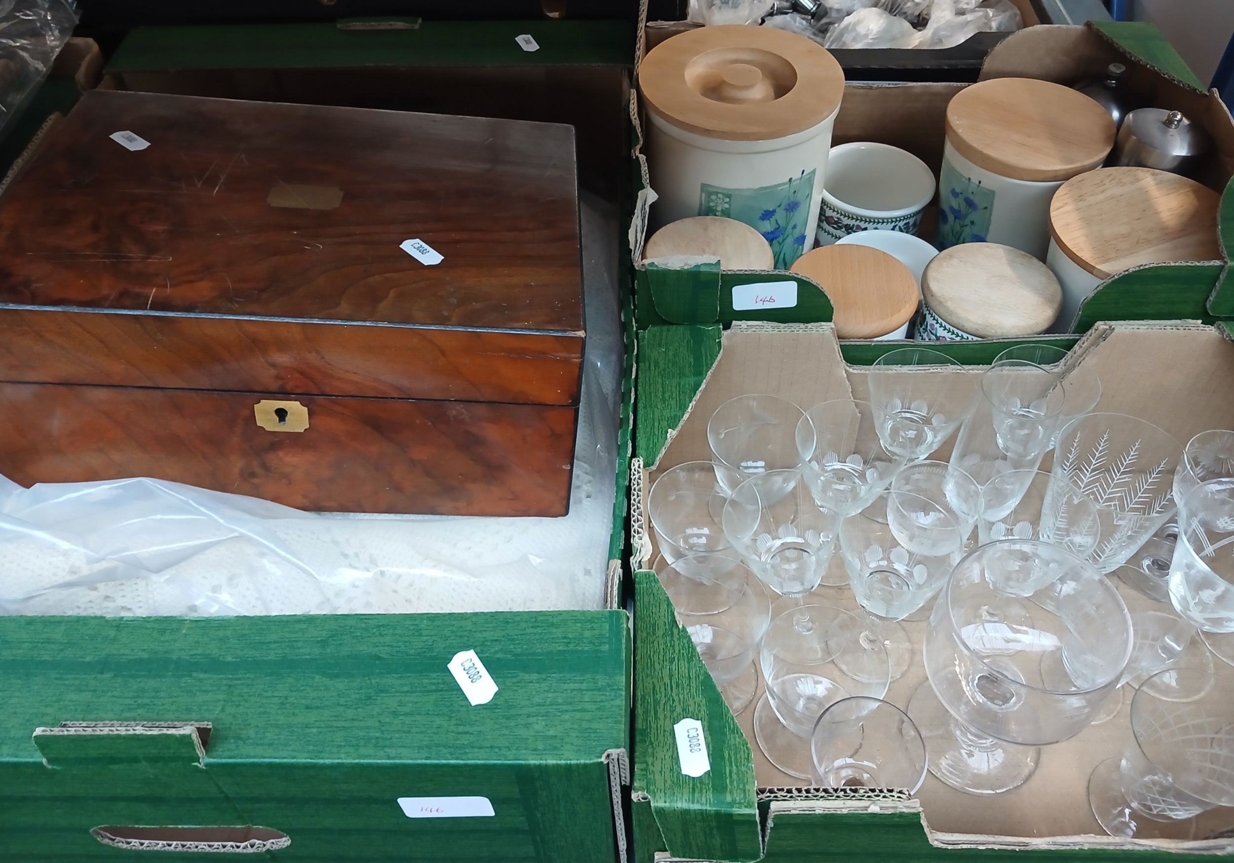 A mixed lot to include glass ware, ceramics including Portmeirion, crocheted bedspread, storage jars and a wooden box
