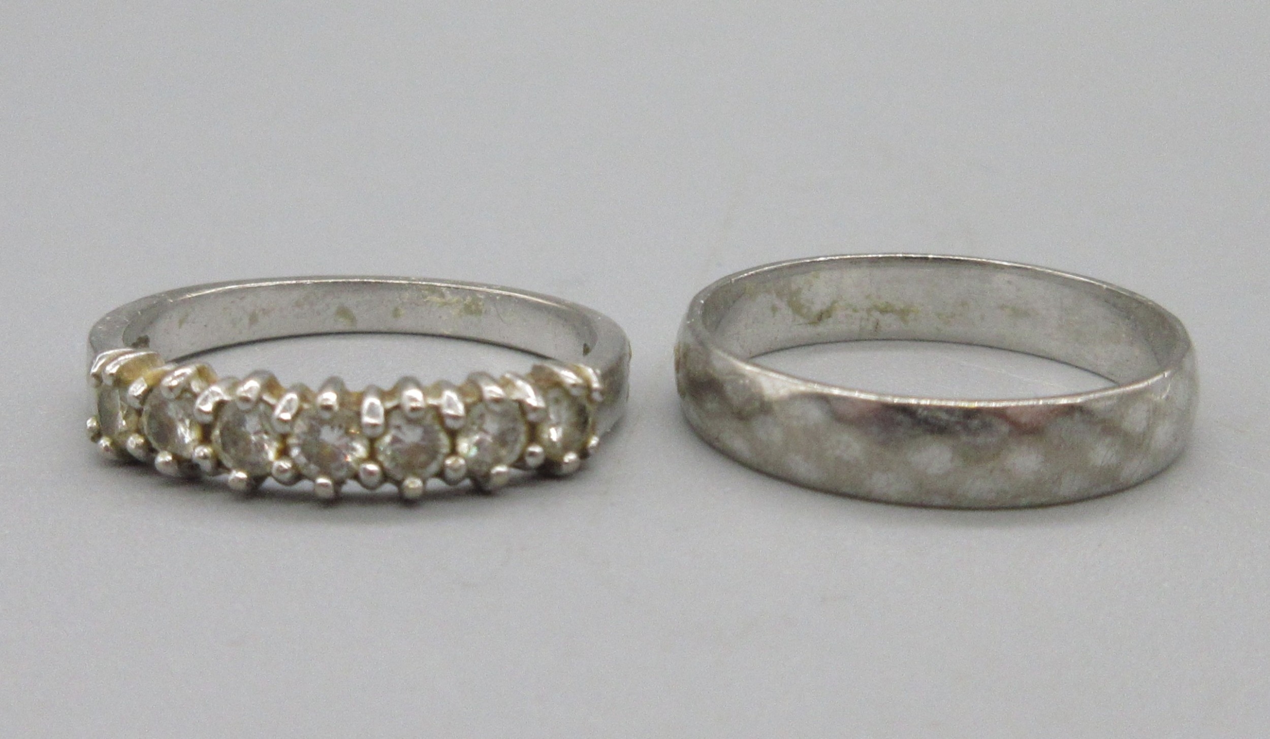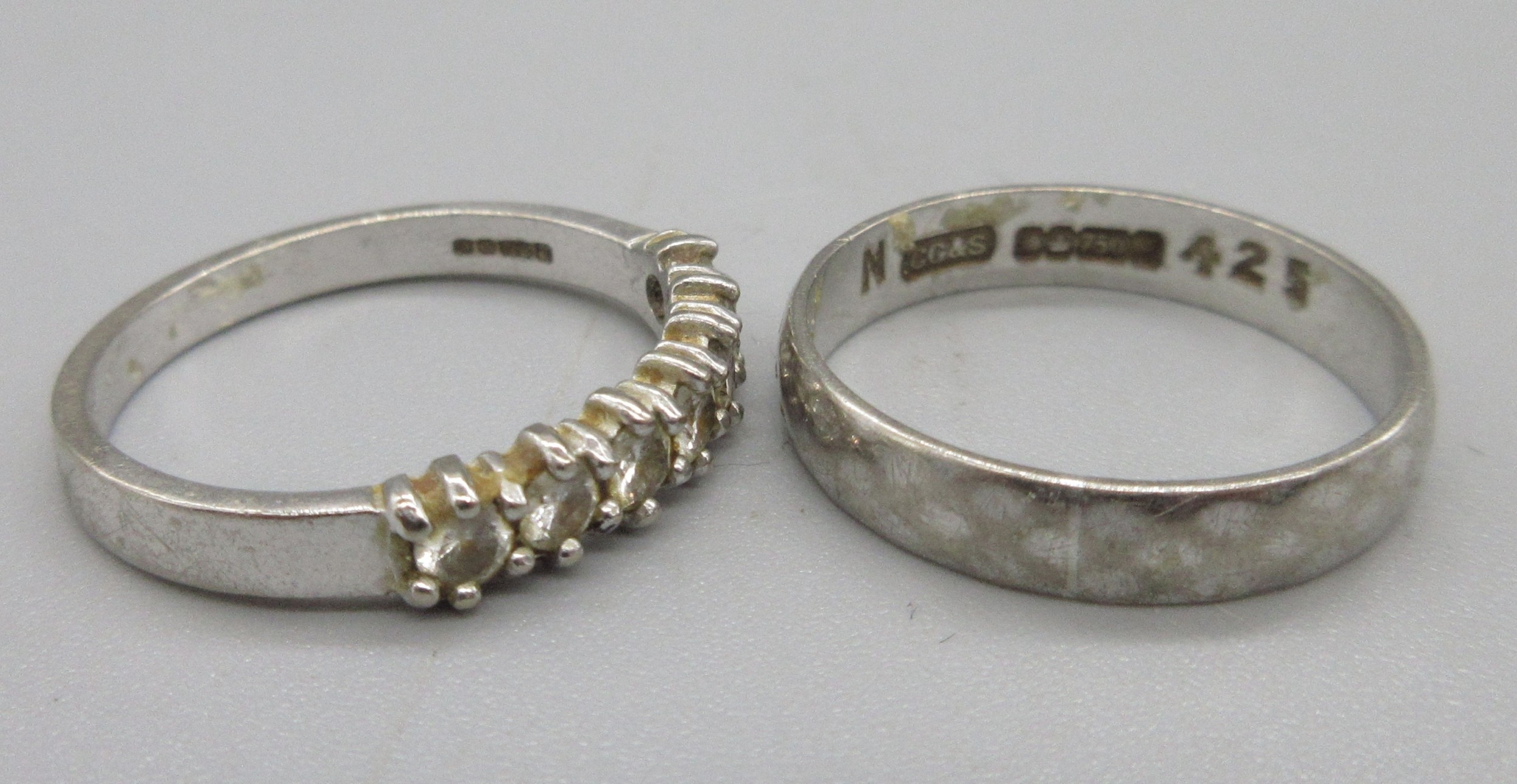 18ct white gold seven stone diamond eternity ring, stamped 750, size M, 18ct white gold band, stamped 750, size N, 5.7g