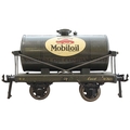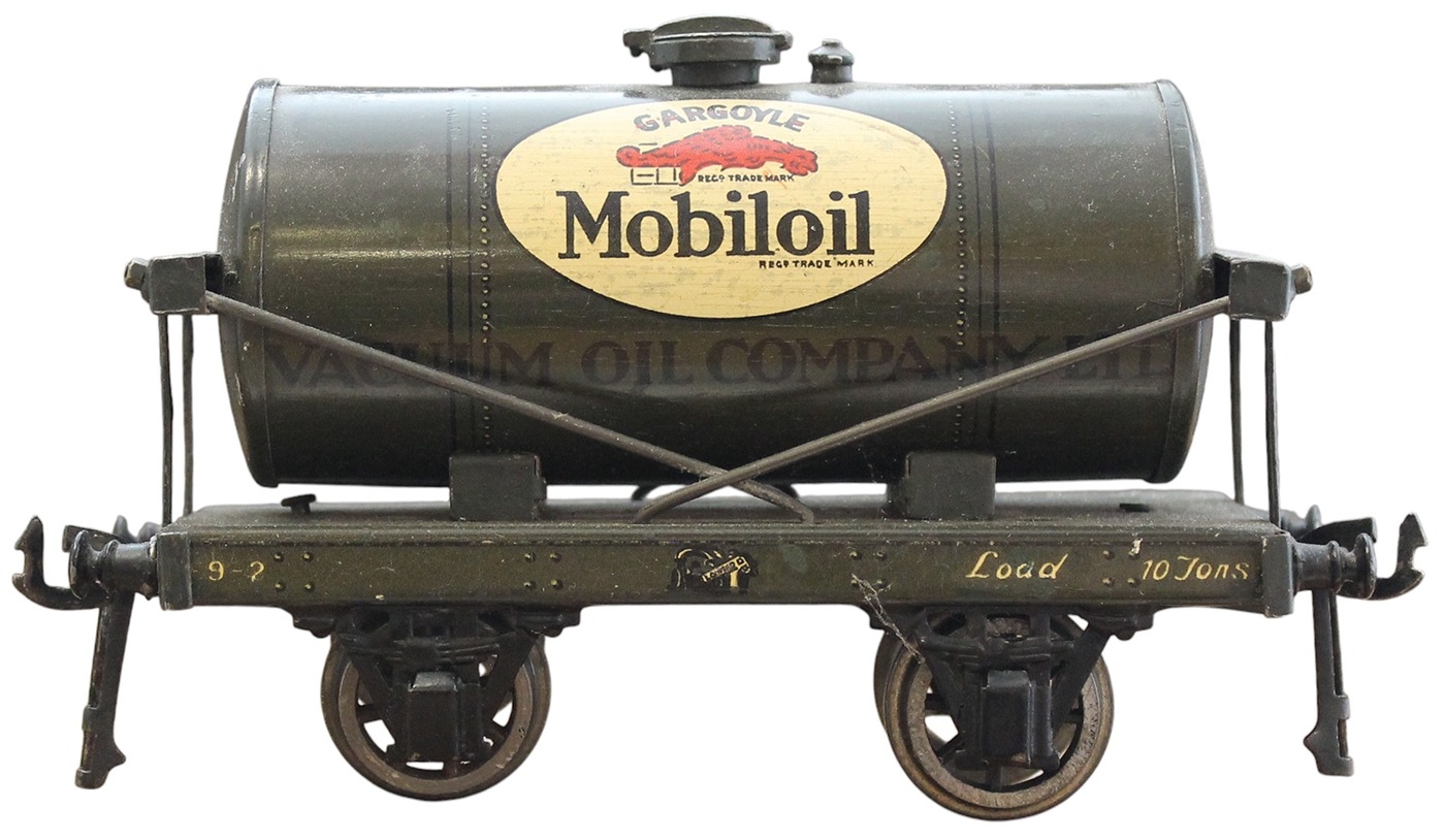 Bassett-Lowke. Unboxed O gauge Tinplate Standard Wagon 'Mobiloil Vacuum Oil' dark green-grey tanker, very good with missing wheel arch. (Ramsay W4) (T)