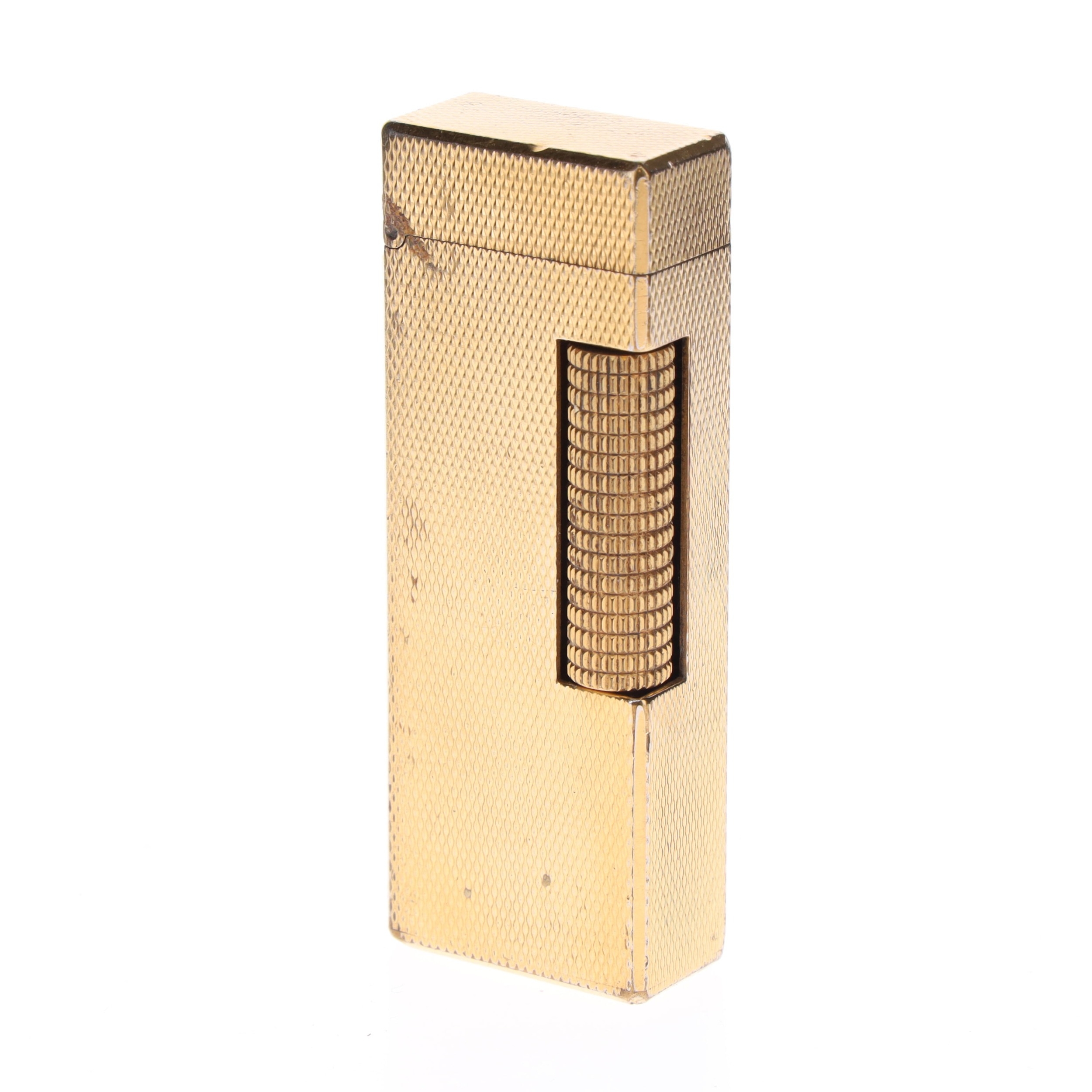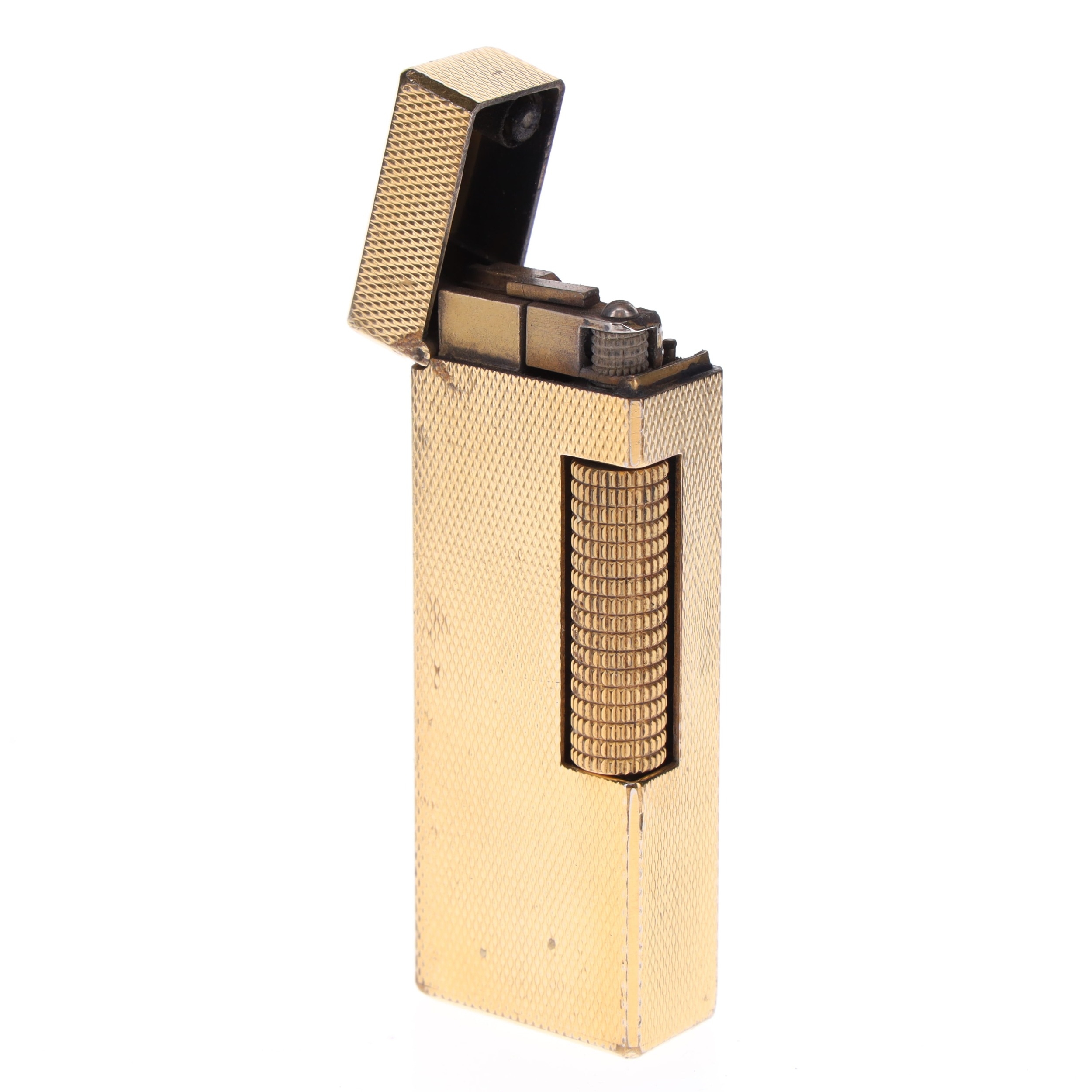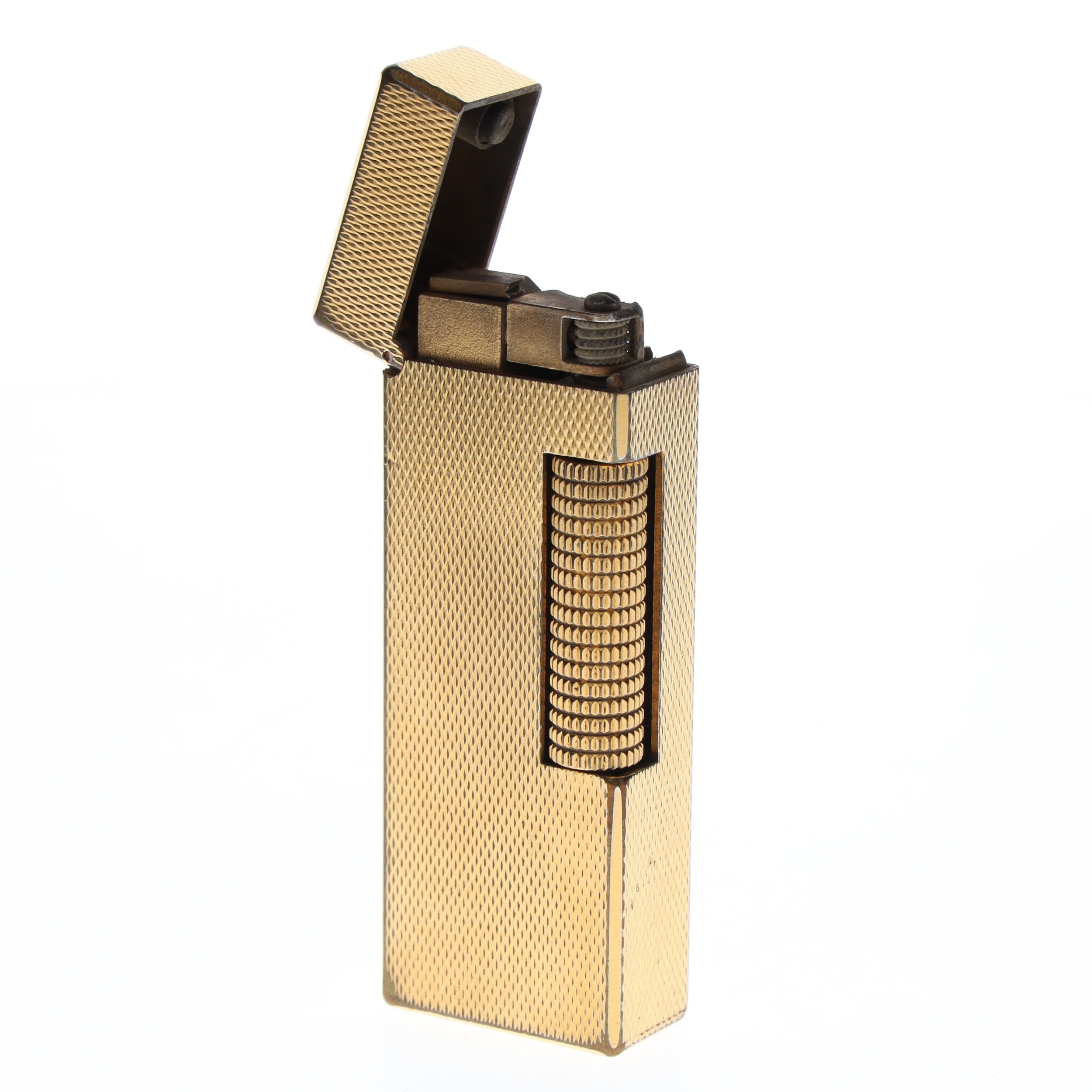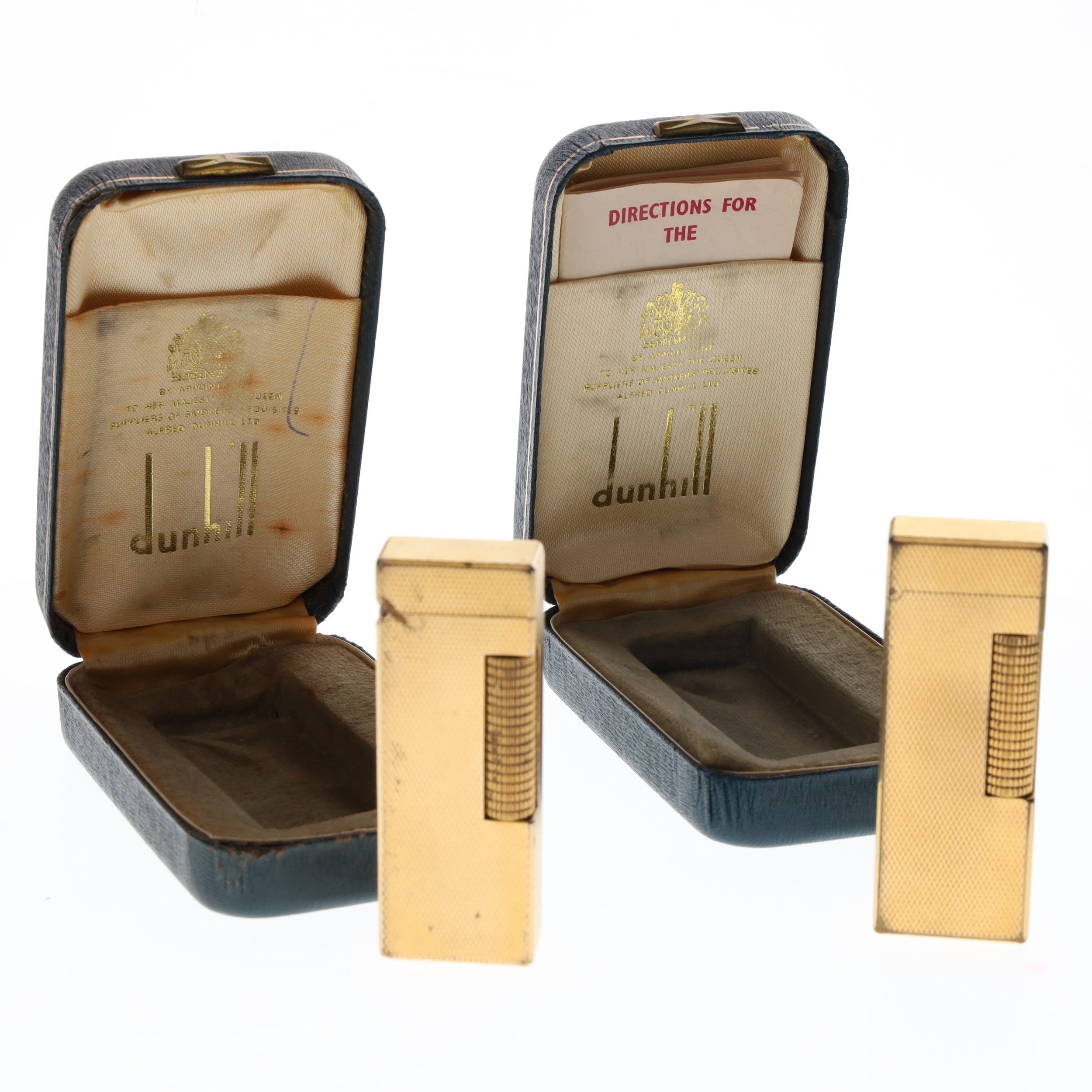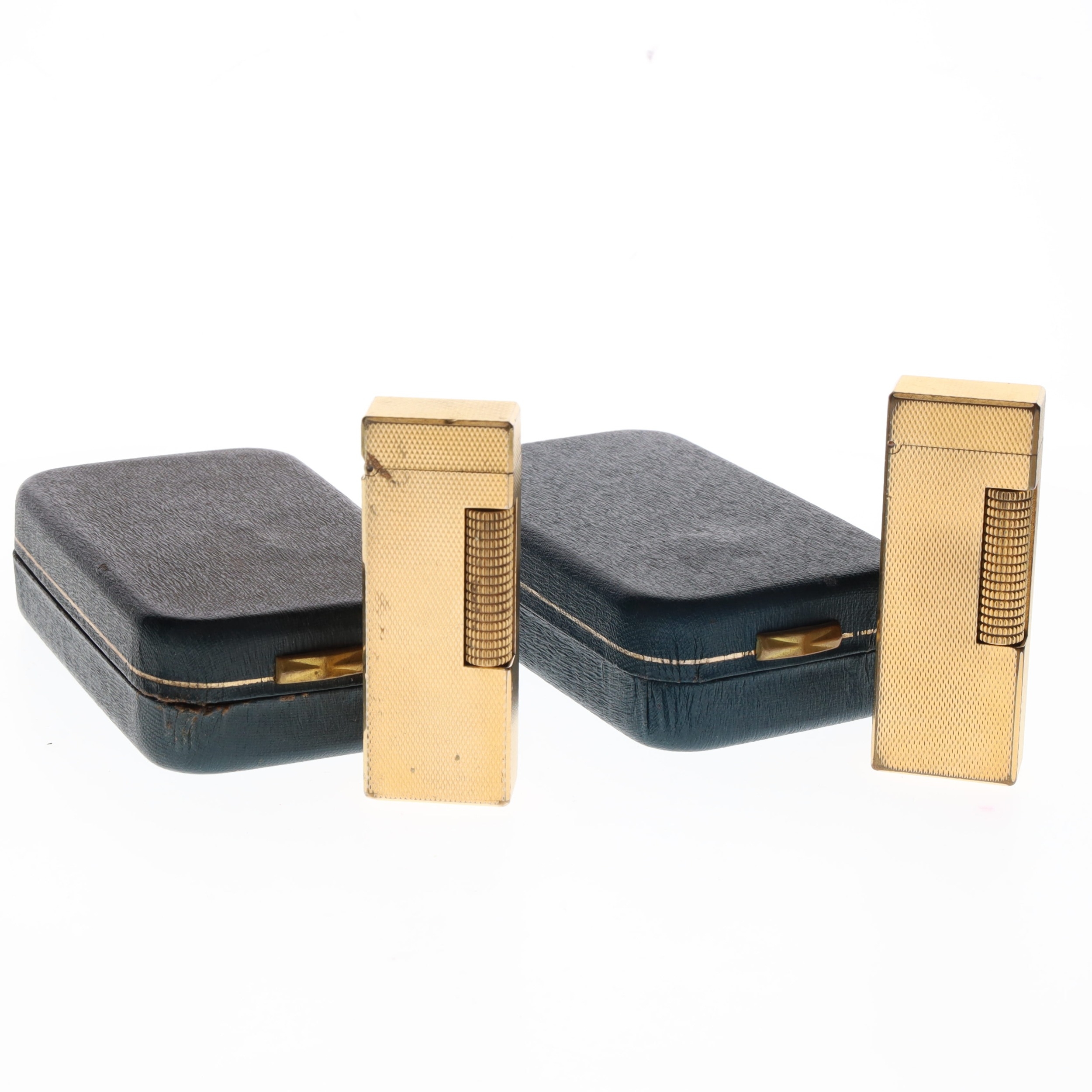 Dunhill - Rollagas Gold Plated Pocket Lighters Pair, Boxed. These lighters are in working order and both come complete with fitted cases. These items have moderate to heavy signs of wear and scratches to the gold plating particularly on the edges and underside. Both items may require general cleaning, restoration and maintenance.