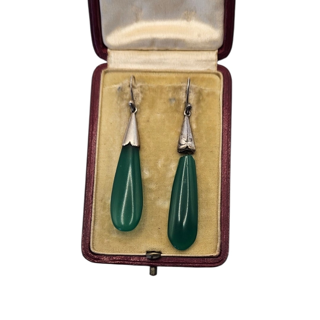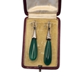 A PAIR OF EARLY 20TH CENTURY WHITE METAL AND JADE DROP EARRINGS