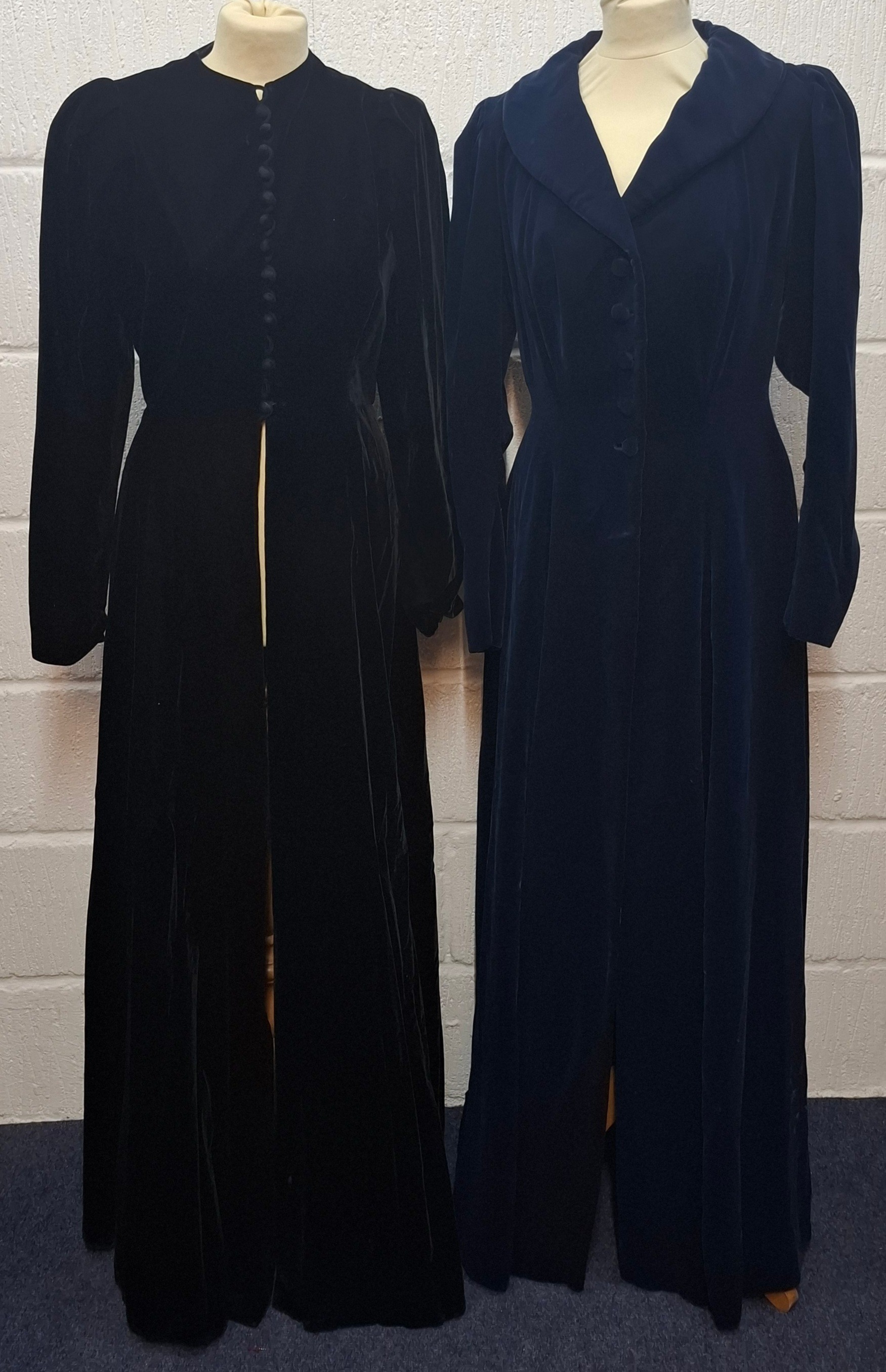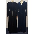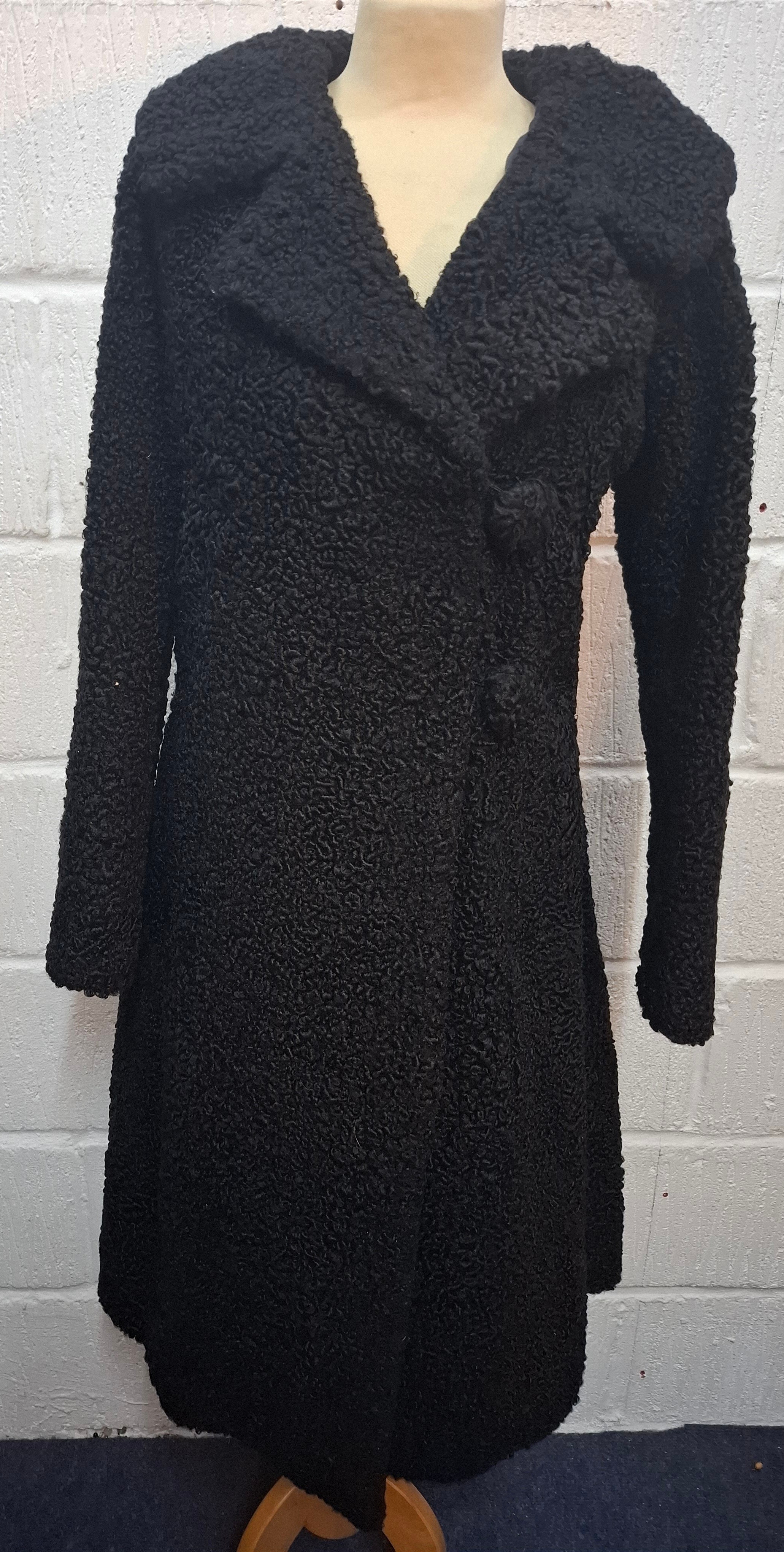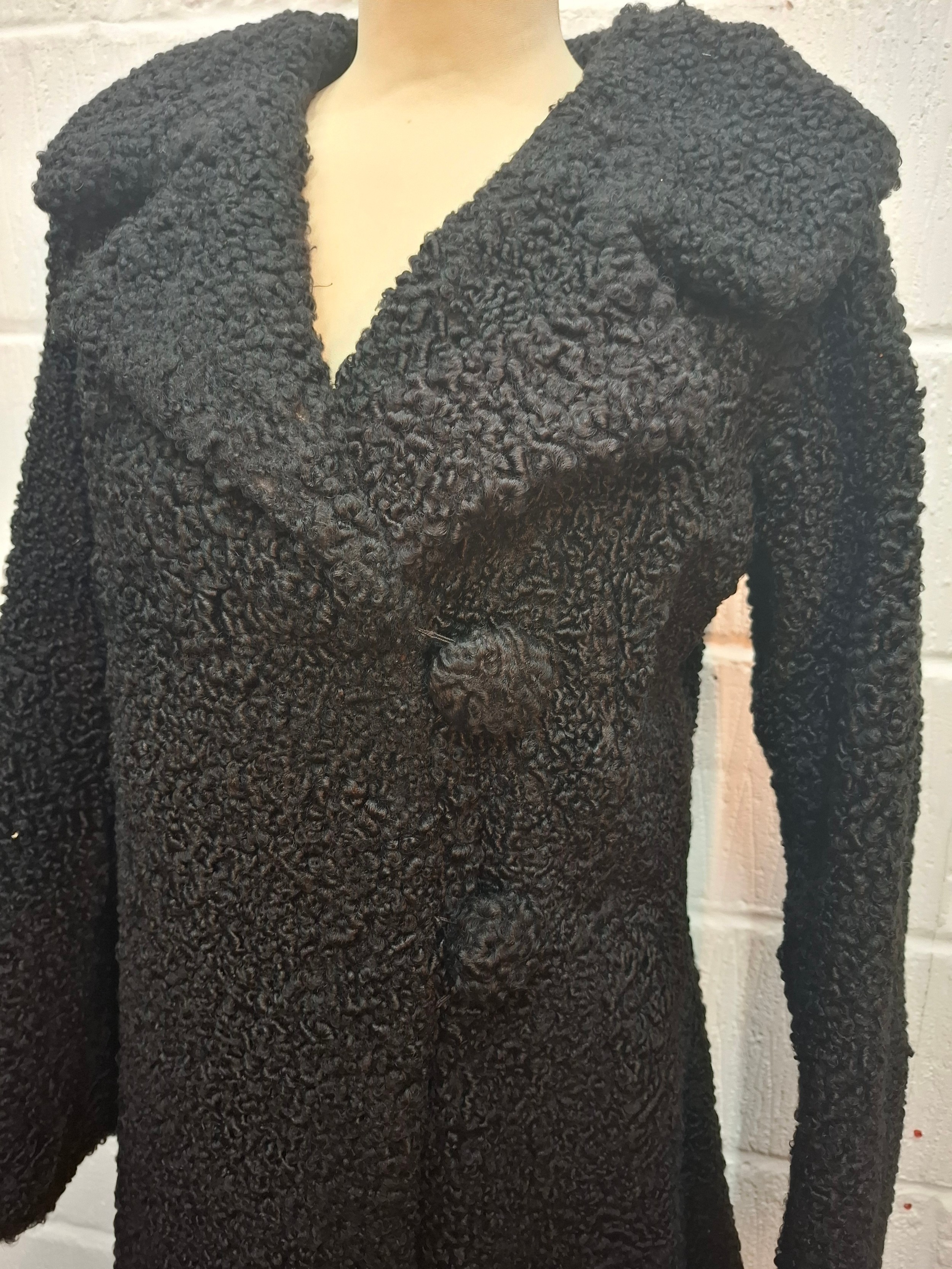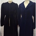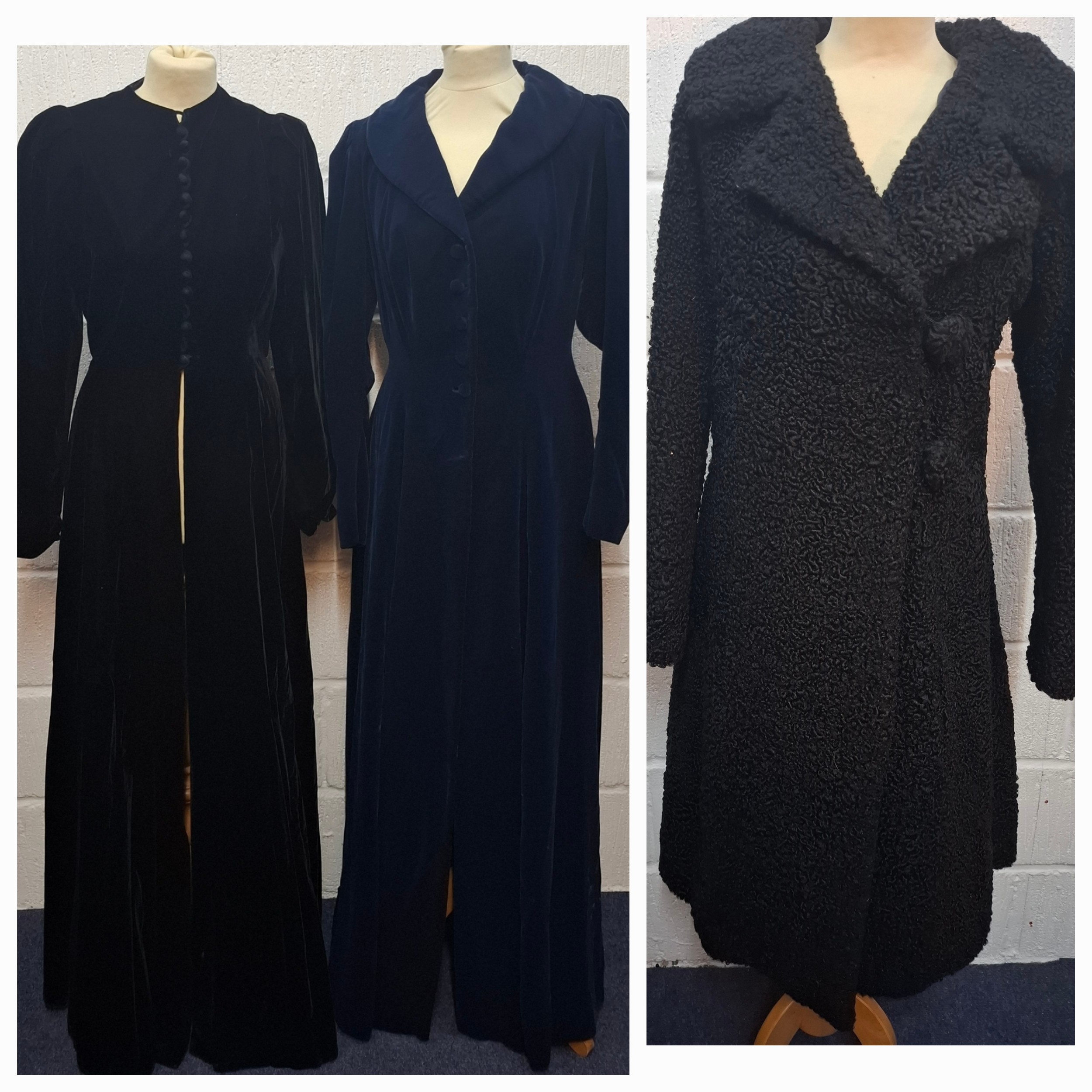 A mid 20th Century black astrakhan swing coat with tapered waistline approx 36" chest, an Edwardian navy velvet evening coat approx 34" chest and a black velvet example (3 buttons missing)