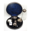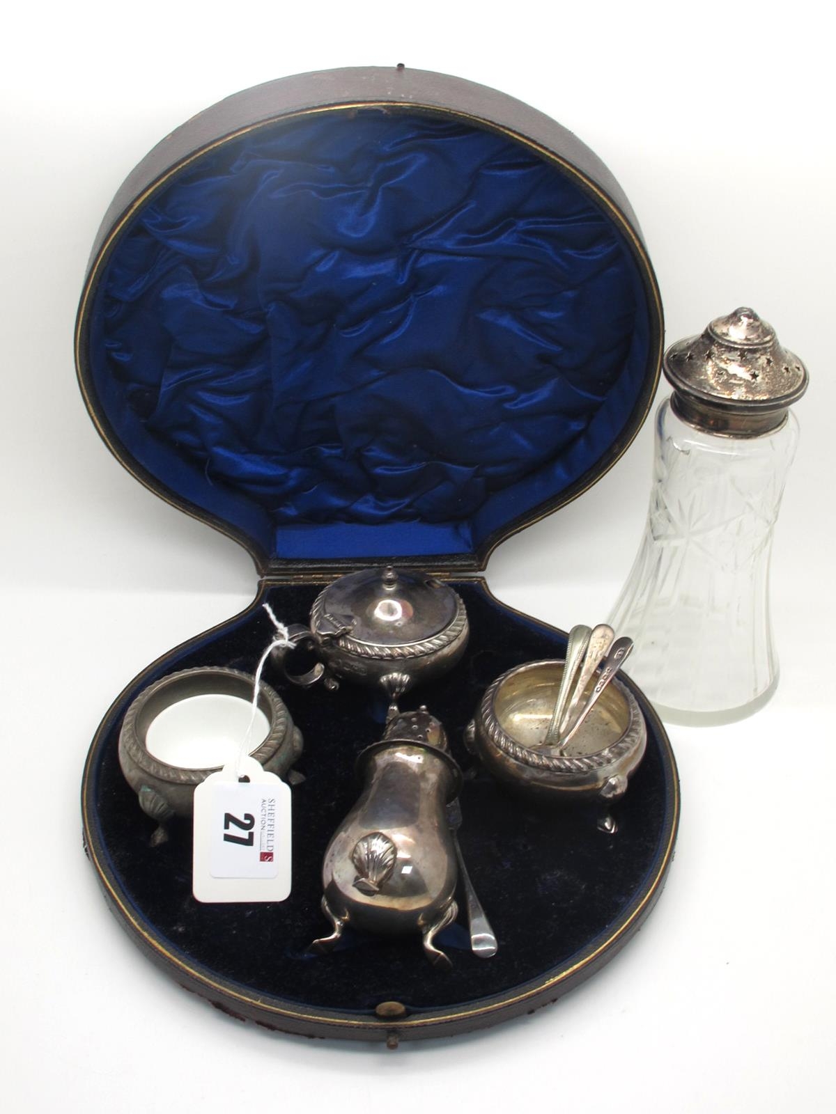A Matched Hallmarked Silver Four Piece Cruet Set, Messrs Hutton, Sheffield 1904, 1930, (damage) with associated spoons and associated fitted case; Together with A Hallmarked Silver Topped Glass Sugar Shaker, (damages) and a Masonic hallmarked silver butter knife.