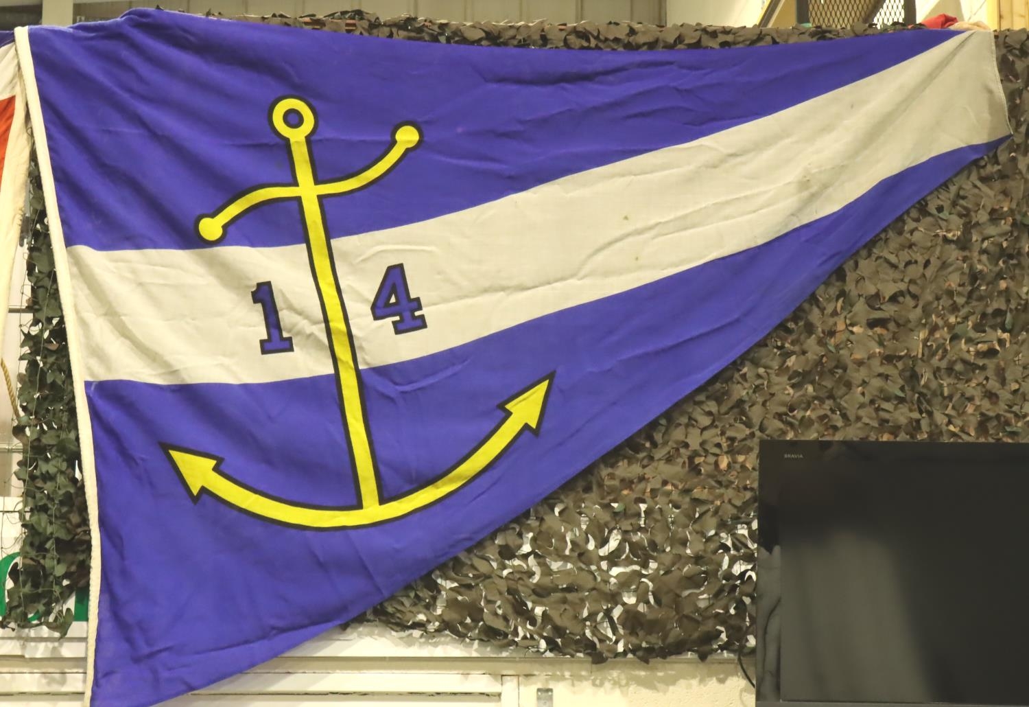 German flagship pennant, large scale in blue and white, printed with fouled anchor and numbered 14, L: 220 cm. P&P Group 2 (£18+VAT for the first lot and £3+VAT for subsequent lots)