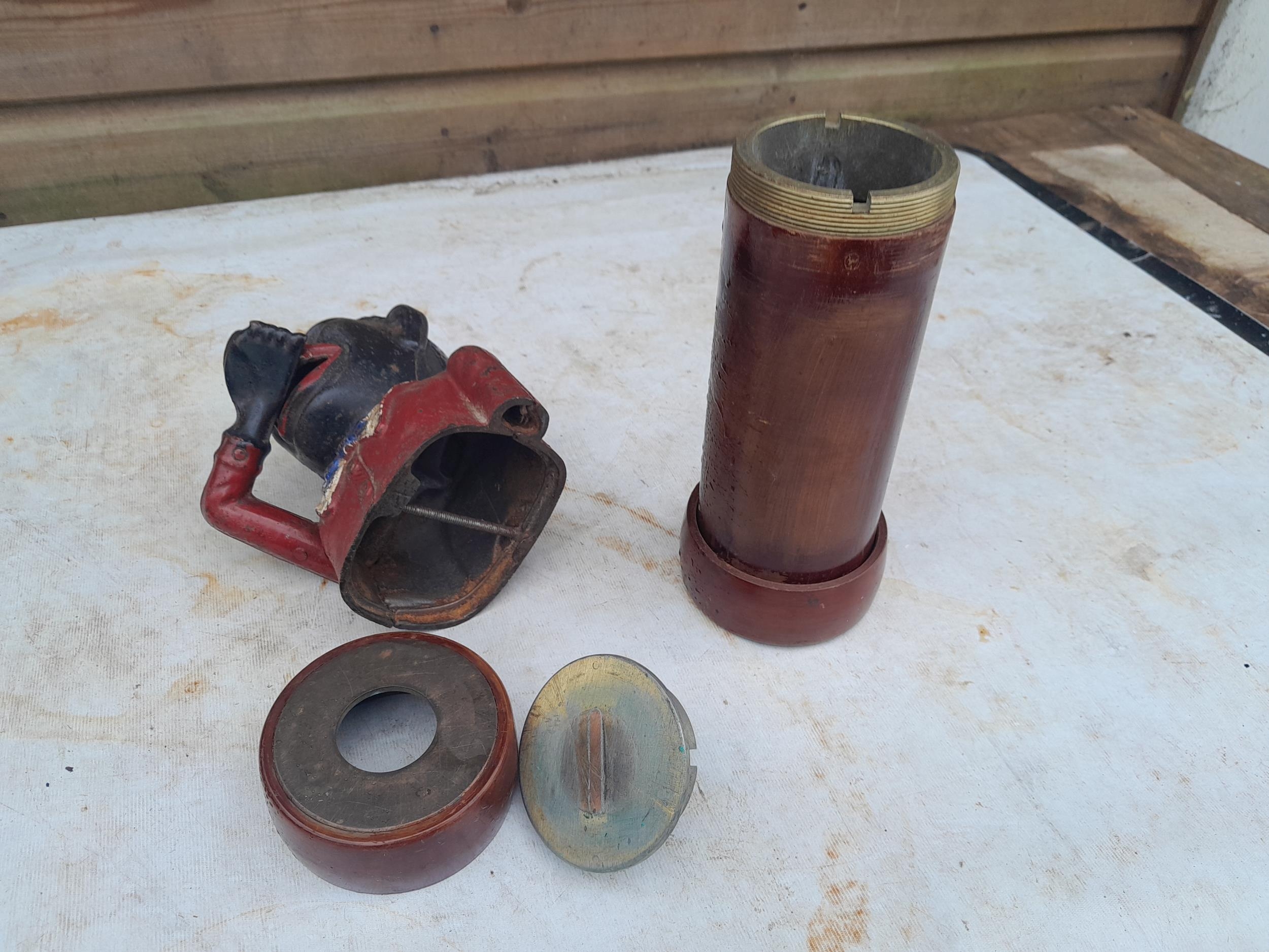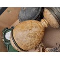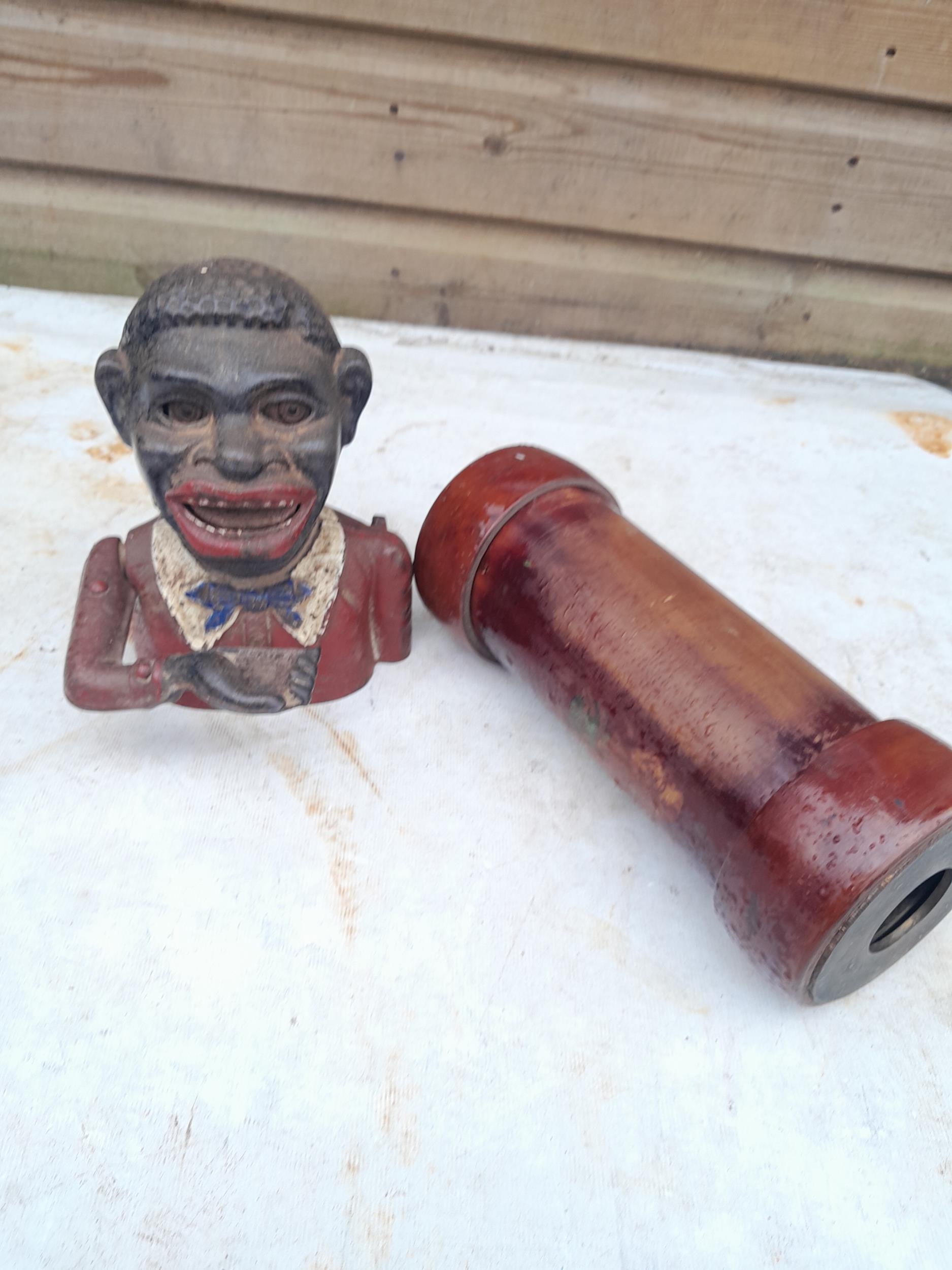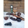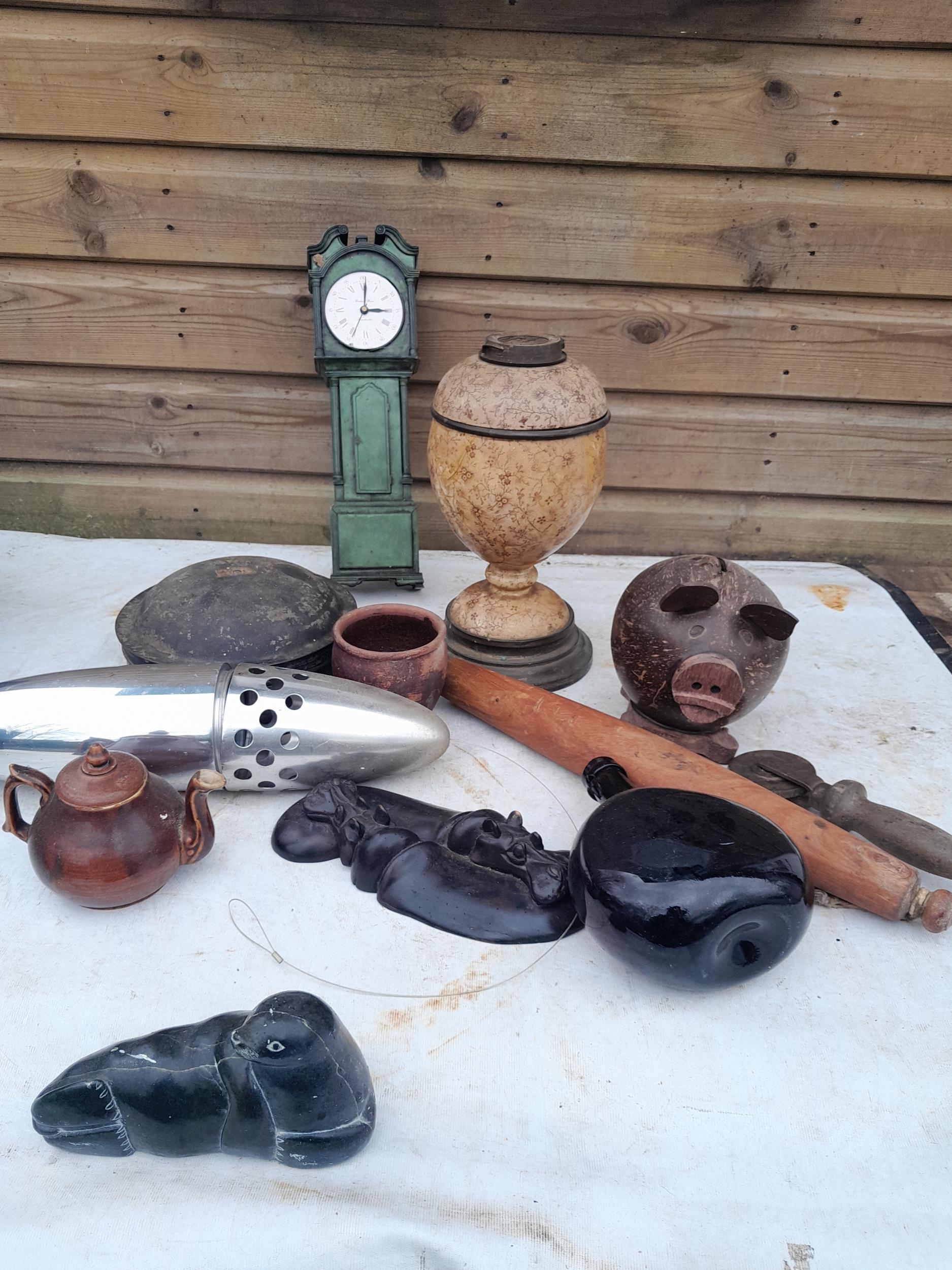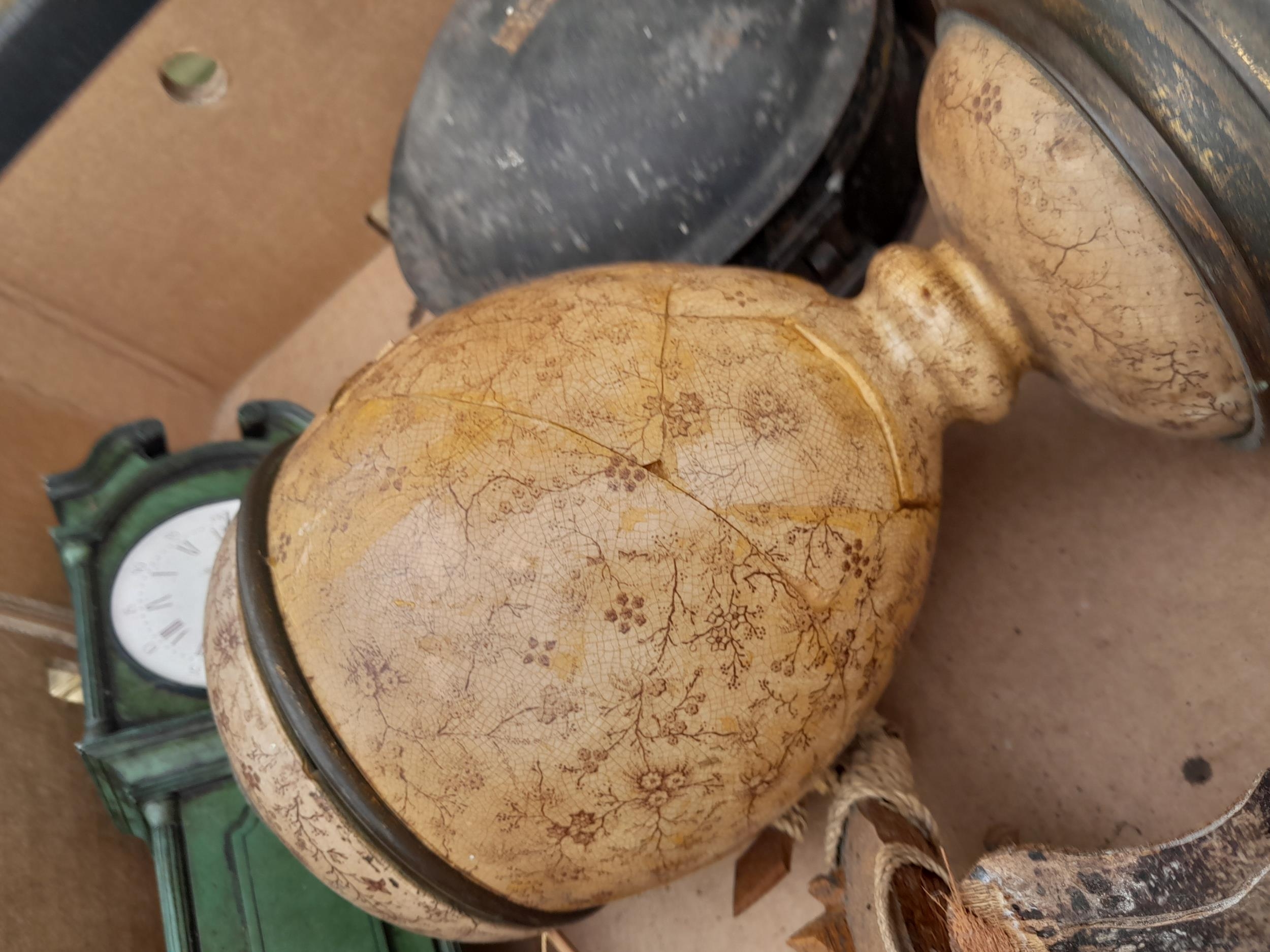 Box of oddments : wooden ware, resin longcase clock ornaments, 20th century Jolly Money Box, damaged paraffin lamp base etc.