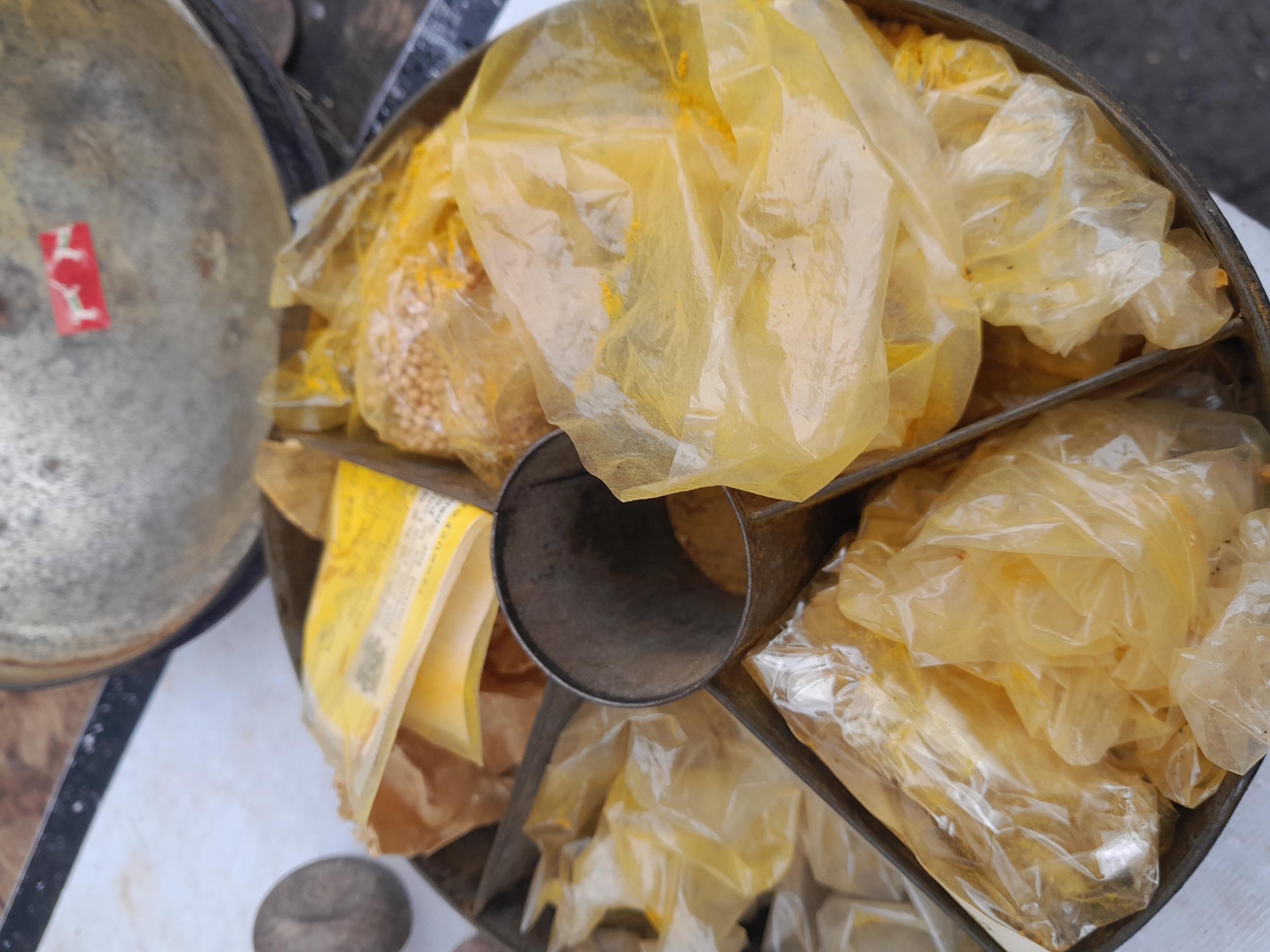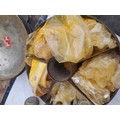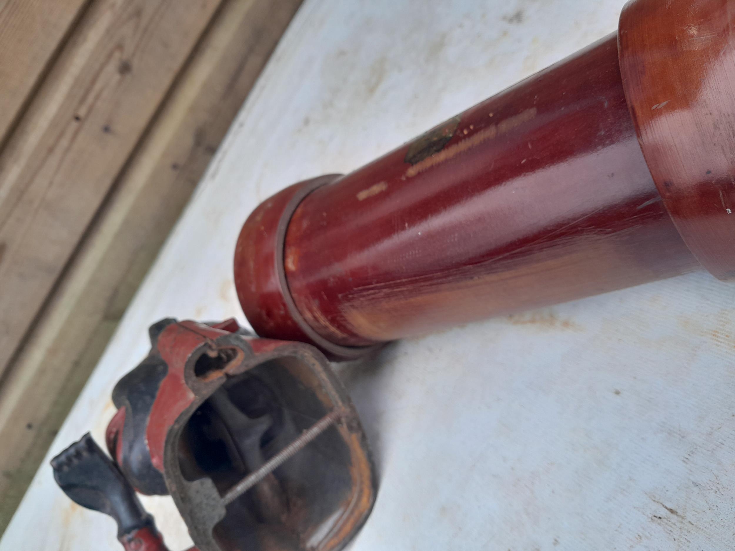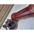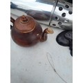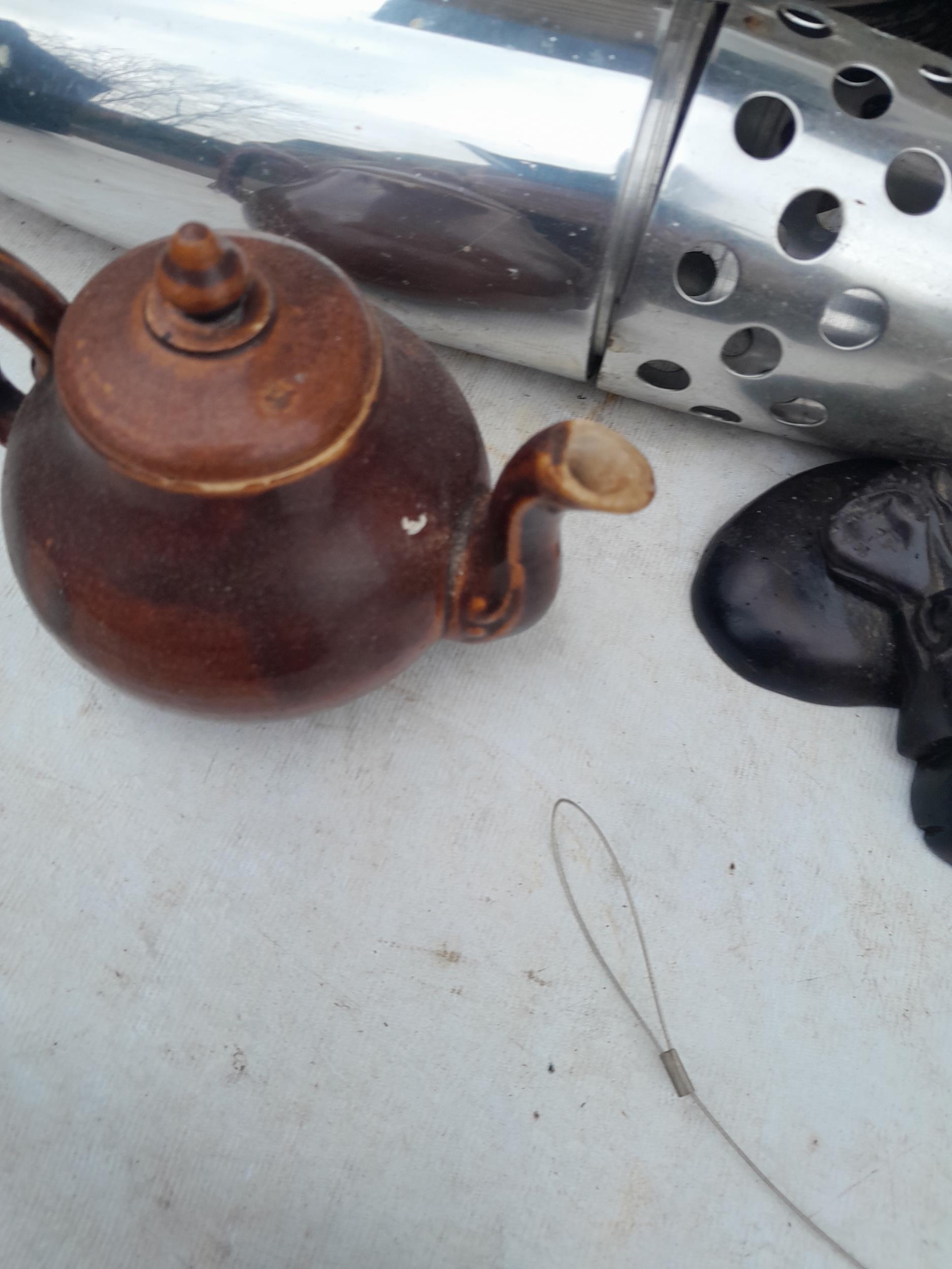 Box of oddments : wooden ware, resin longcase clock ornaments, 20th century Jolly Money Box, damaged paraffin lamp base etc.
