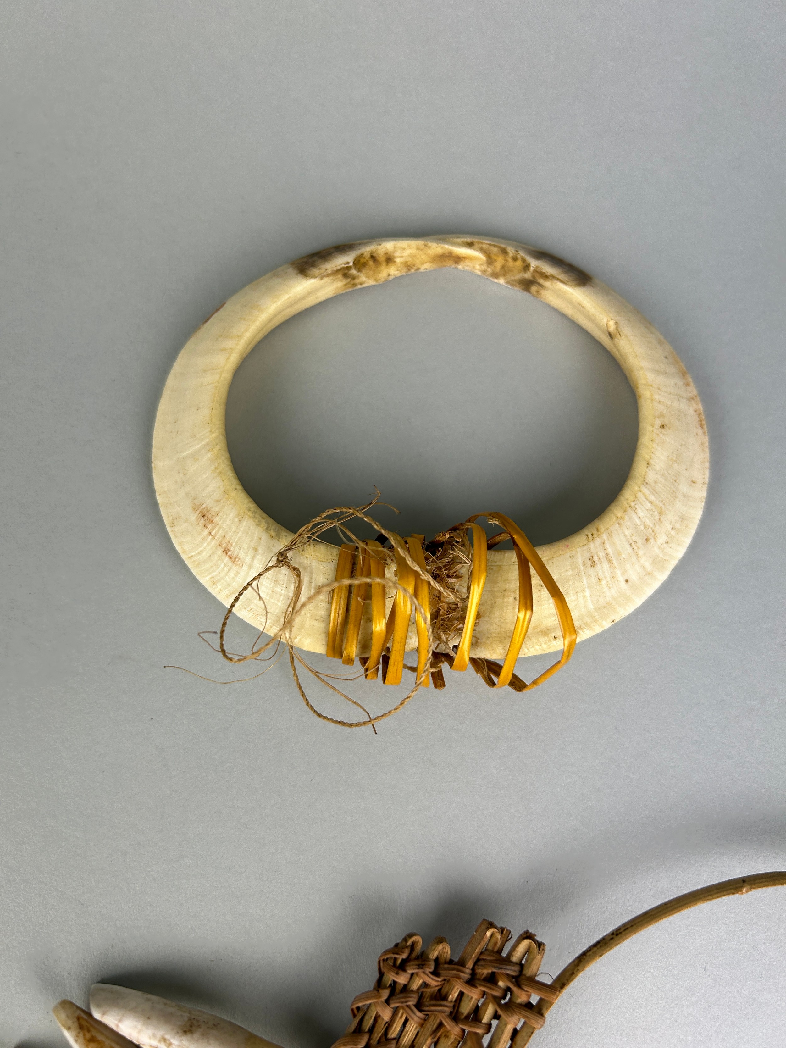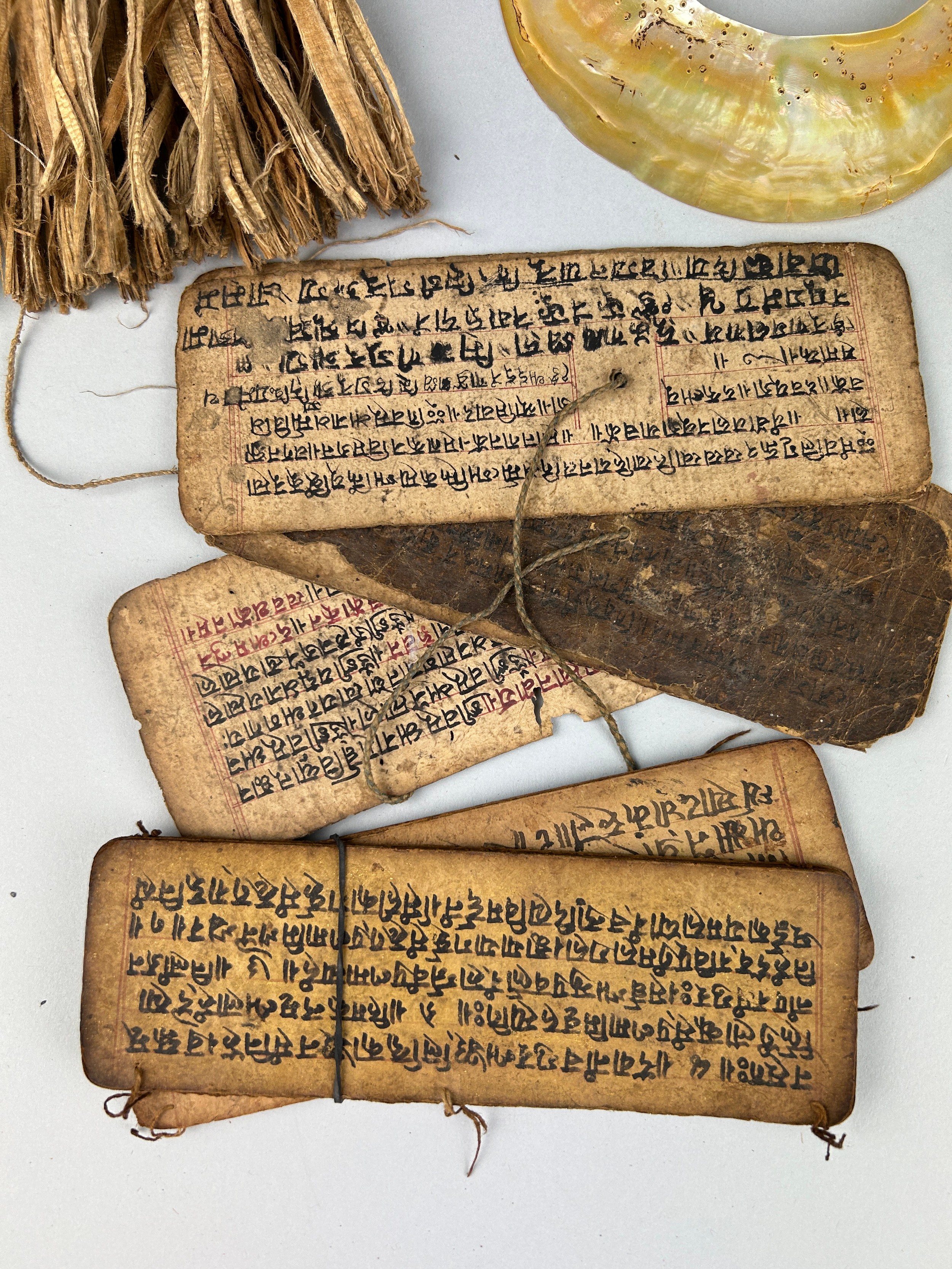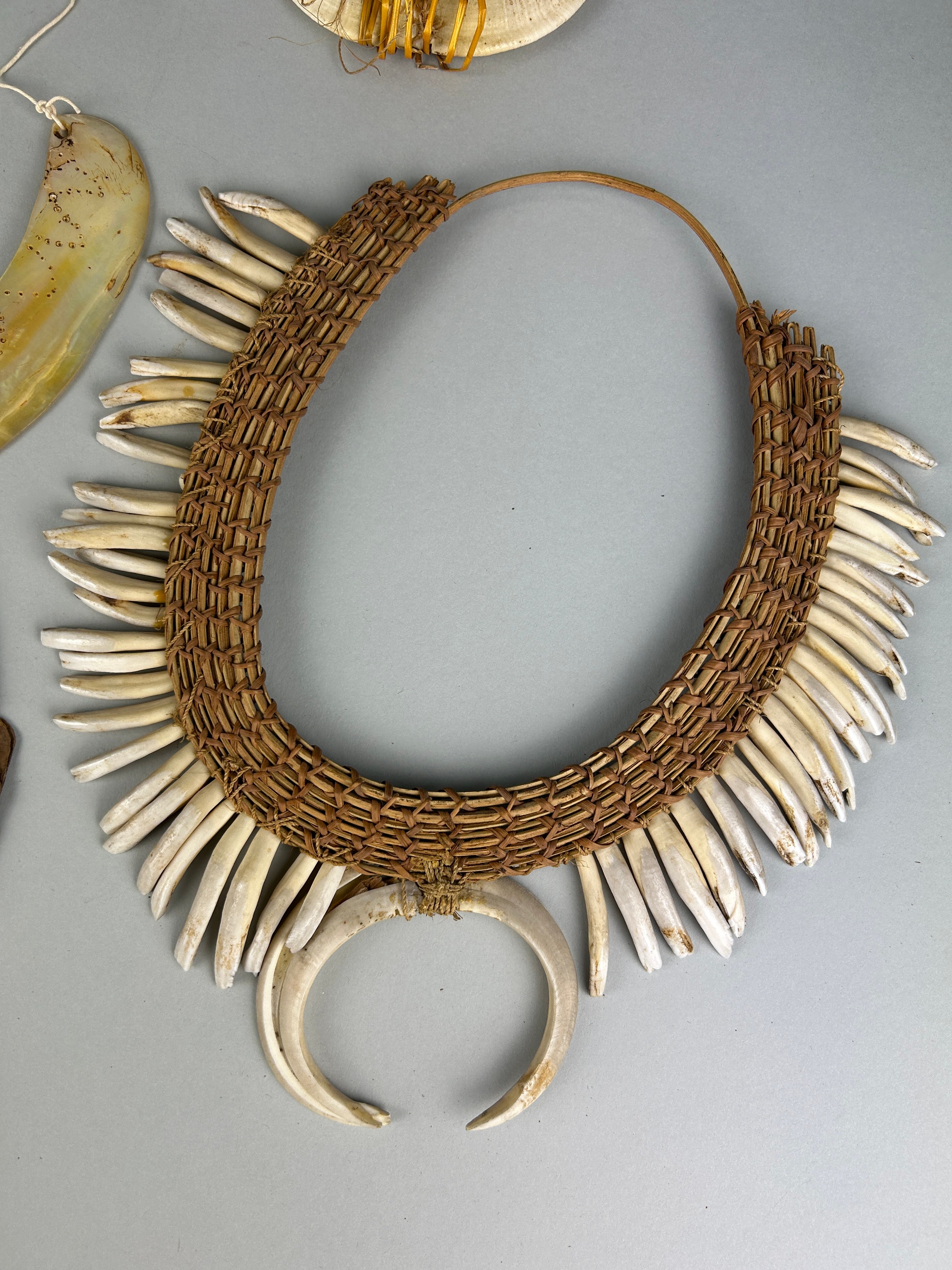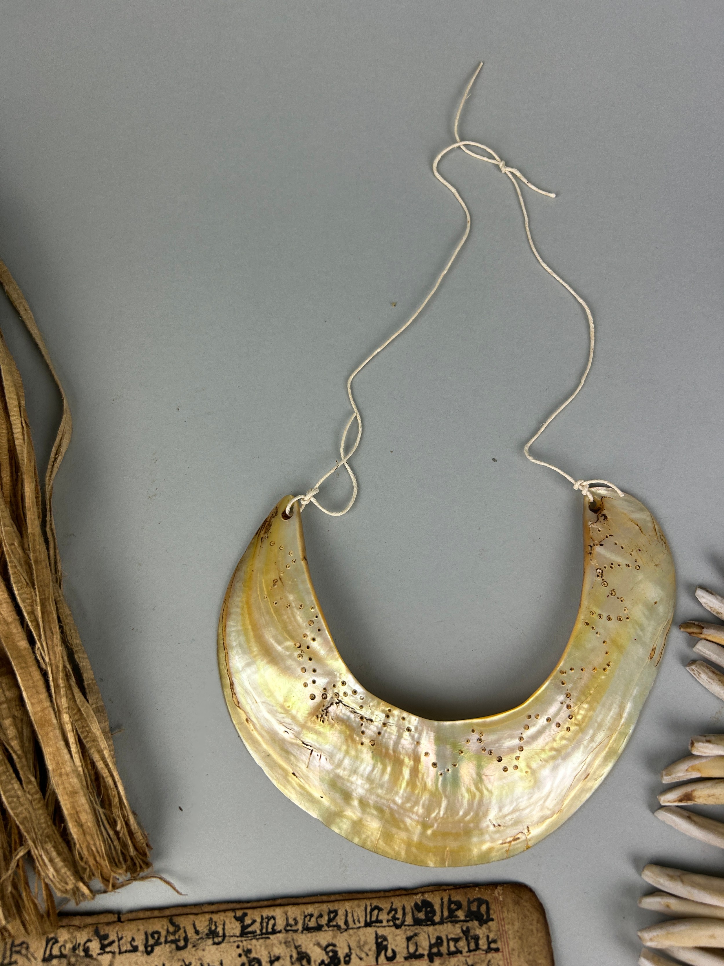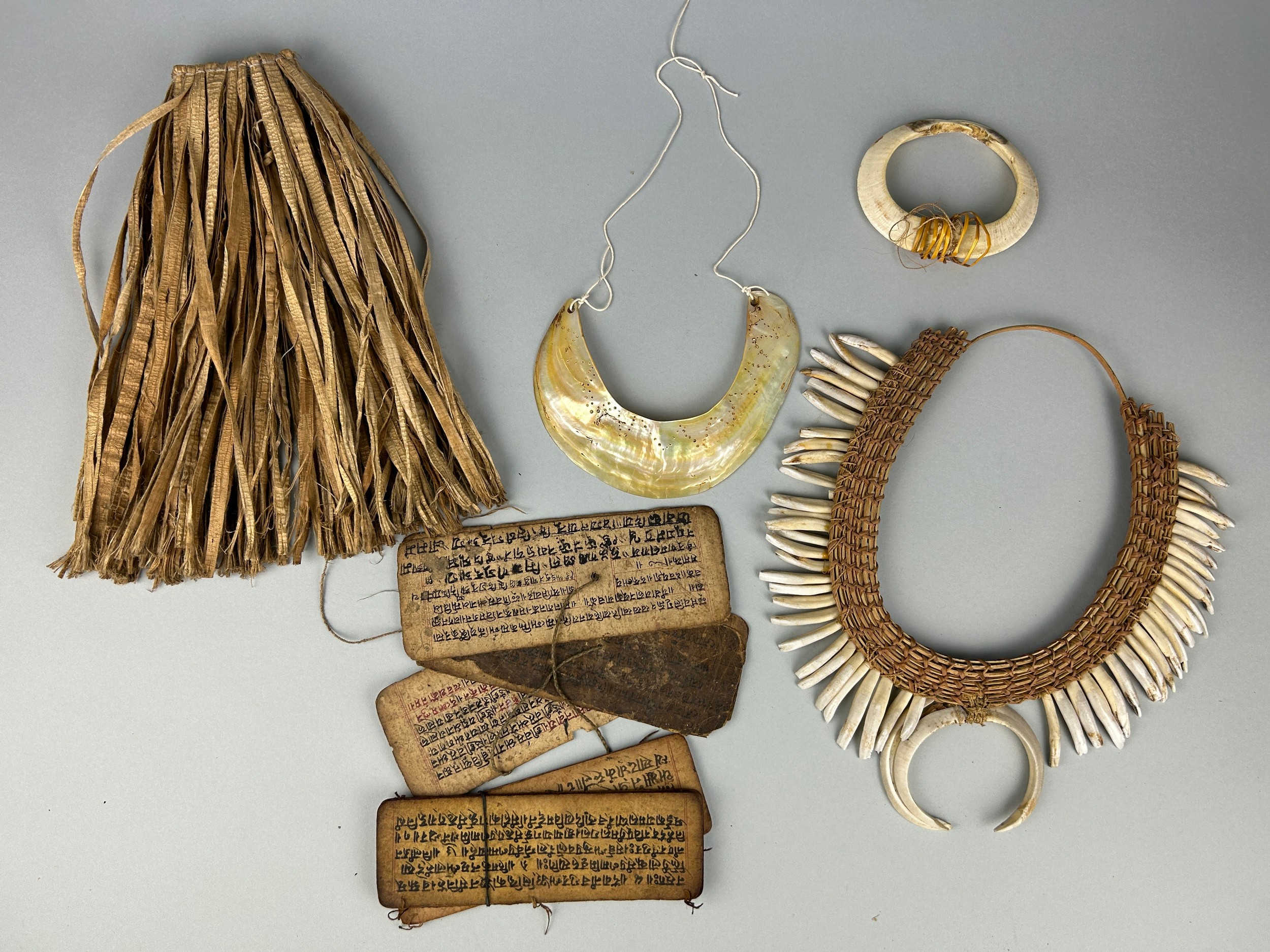A COLLECTION OF TRIBAL ARTEFACTS MADE FROM SHELL, BONE AND TOOTH FROM PAPUA NEW GUINEA AND PRAYER BOOKS TIBETAN AND DEVANAGIRI SCRIPT