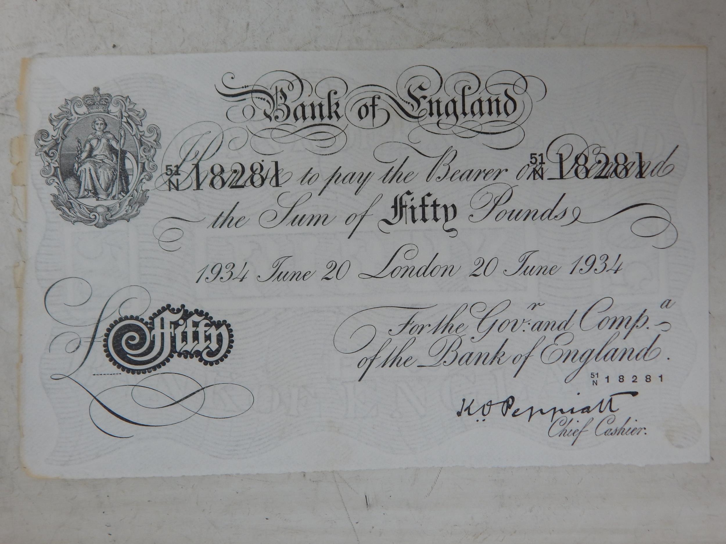 Bank of England white Fifty Pound note 20 June 1934 cashier Peppiatt