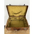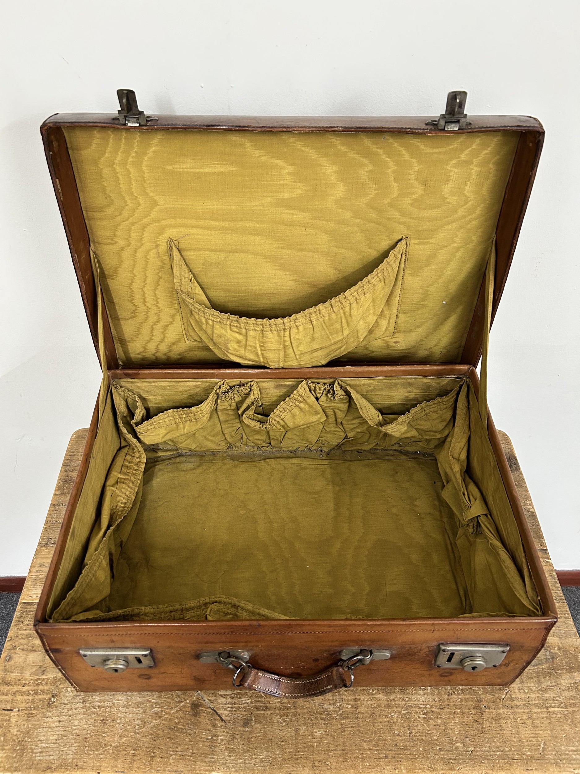A vintage leather suitcase with working catches and monogrammed top together with a leather satchel, a small leather bag and a cased artist brush set