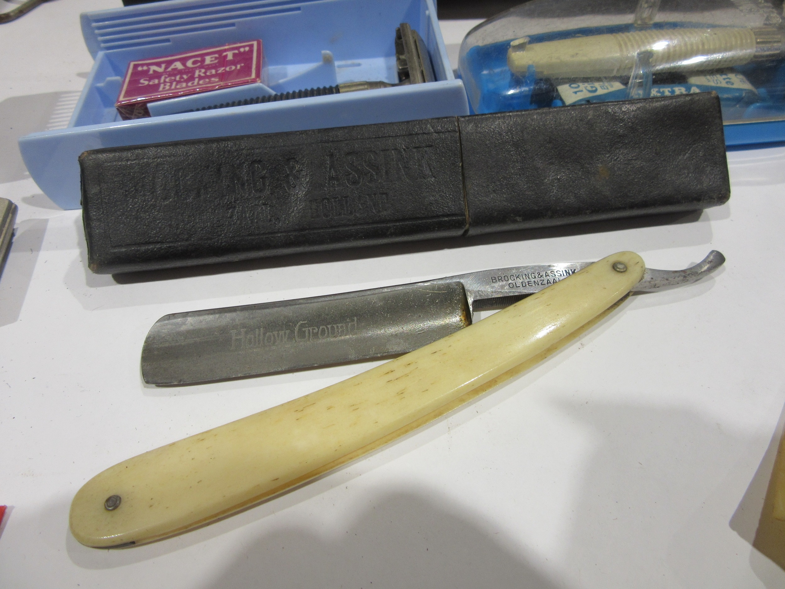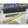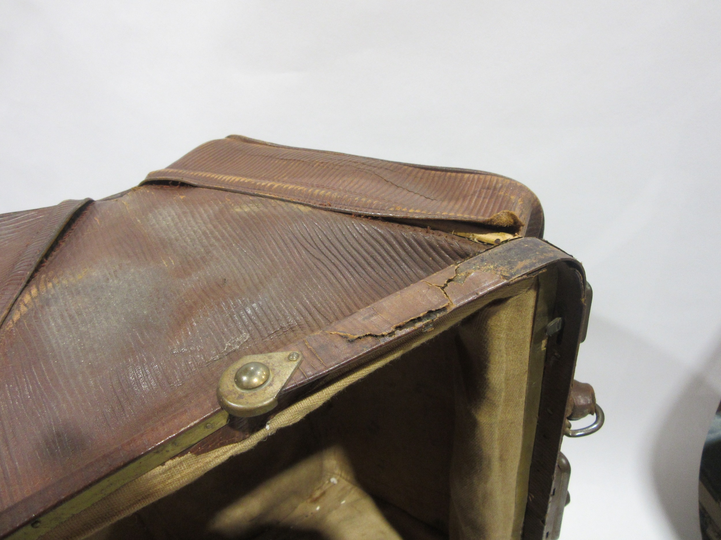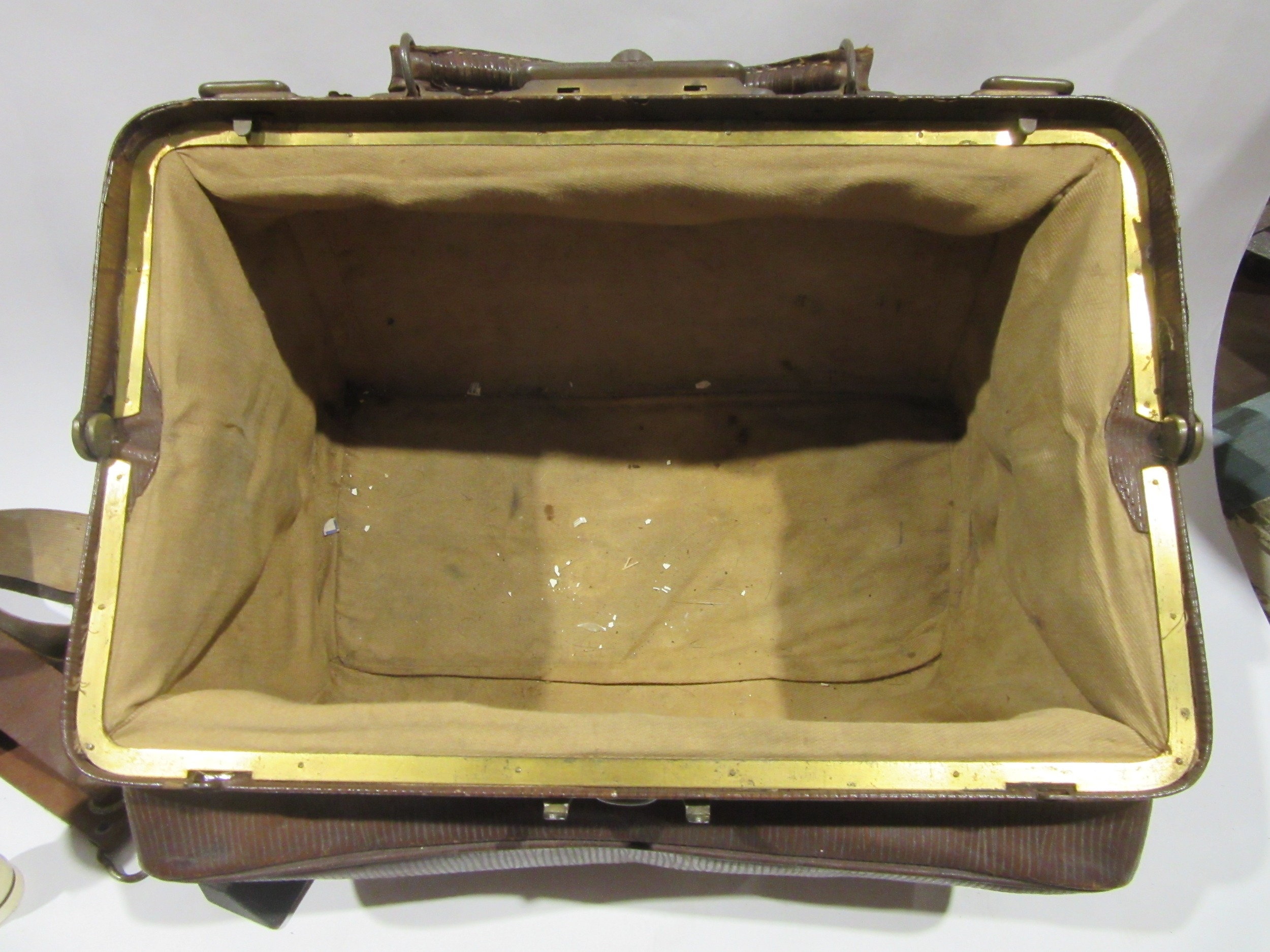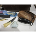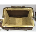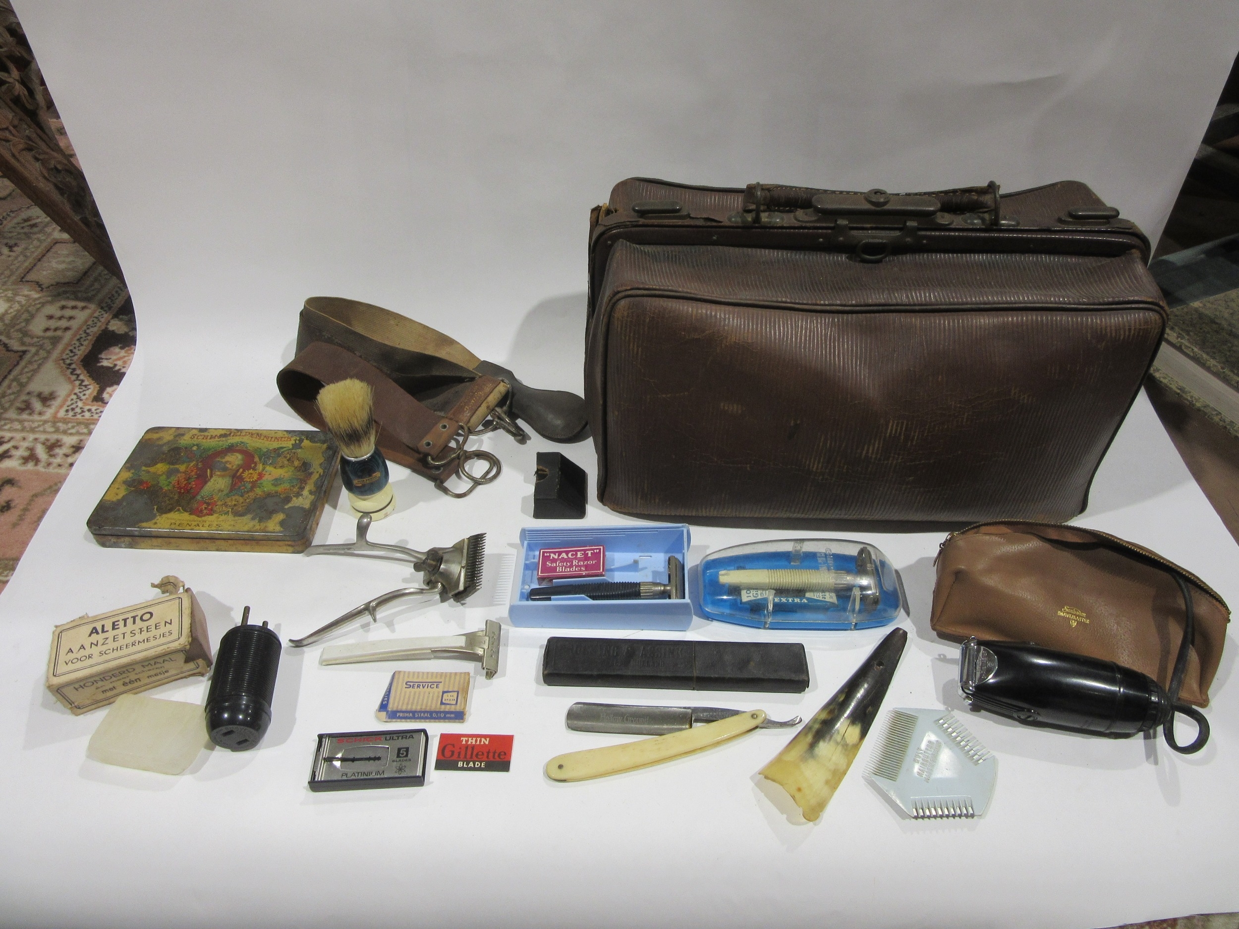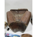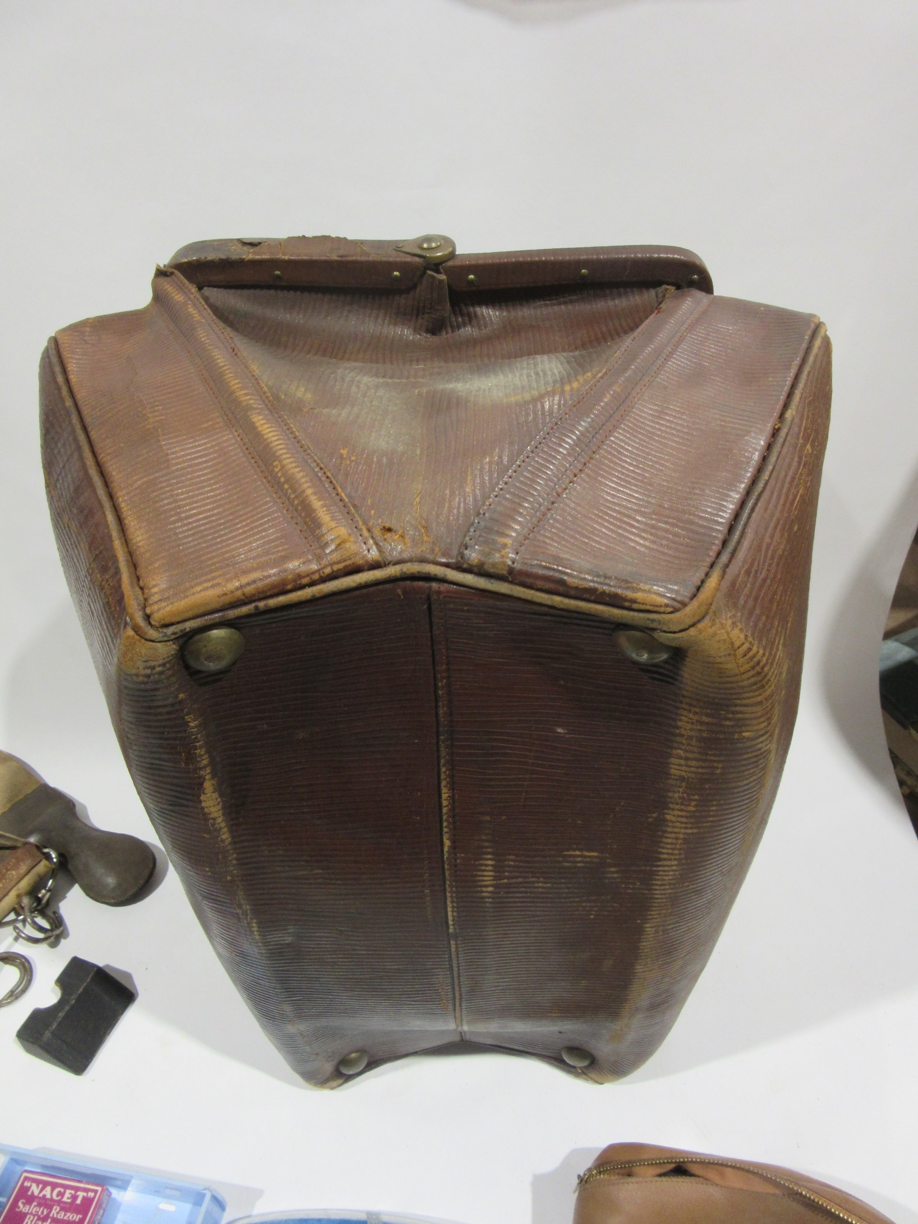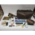 A leather doctor's bag containing assorted vintage shaving equipment