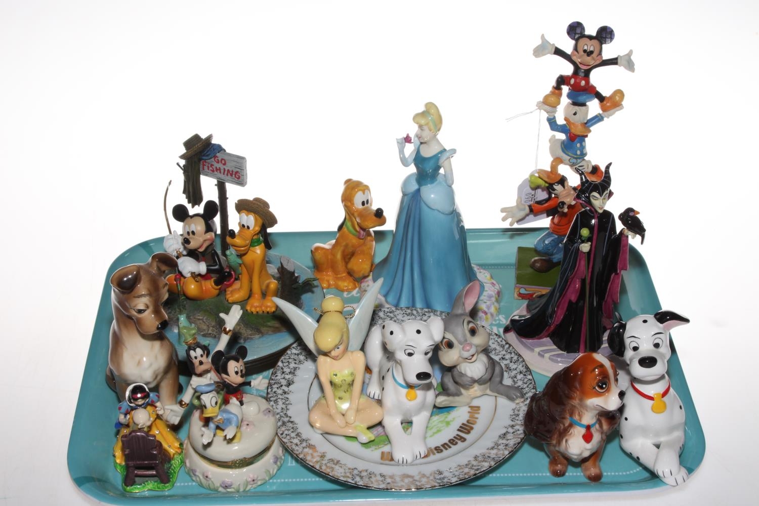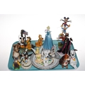 Collection of Disney character figures including Royal Doulton Cinderella and Maleficent, Disney Showcase Teetering Tower, Gone Fishing tableau, etc.