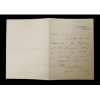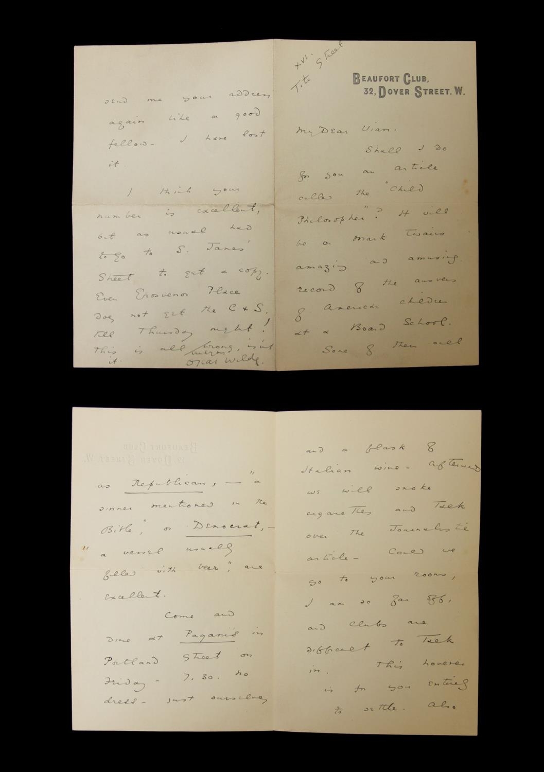 Oscar WILDE (Oscar Fingal O'Flahertie Wills Wilde (1854-1900), als to Alsager VIAN (Alsager Richard Vian 1863-1924, Editor Court & Society Review), undated but September 9th 1887 by postmark, folded octavo, on headed notepaper, four pages of text, Beaufort Club, 32 Dover Street. W., and hand addressed XVI, Tite Street; with 16 Tite Street, Chelsea S.W. Printed envelope, addressed Alsager Vian, 3 Craven Street, Strand, WC, pm London SW, Sept 9, 87 My Dear Vian Shall I do for you an article called the ''Child Philosopher''? It will be on Mark Twains amazing and amusing record of the answers of American children at a Board School. Some of them such as Republicans - ''a sinner mentioned in the Bible'', or Democrat - ''a vessel usually filled with beer'', are excellent. Come and dine at Pagani's in Portland Street on Friday - 7.30. No dress - just ourselves and a flask of Italian wine - afterwards we will smoke cigarettes and Talk over the Journalistic article - could we go to your rooms, I am so far off, and clubs are difficult to Talk in. This however is for you entirely to settle. Also send me your address again like a good fellow - I have lost it. I think your number is excellent, but as usual had to go to S. James' Street to get a copy. Even Grosvenor Place does not get the C&S. Till Thursday night! This is all/wrong, isn't it, Truly yours, Oscar Wilde The article Child Philosopher mentioned appeared in the Court & Society Review Pagani's Italian Swiss restaurant in Great Portland Street