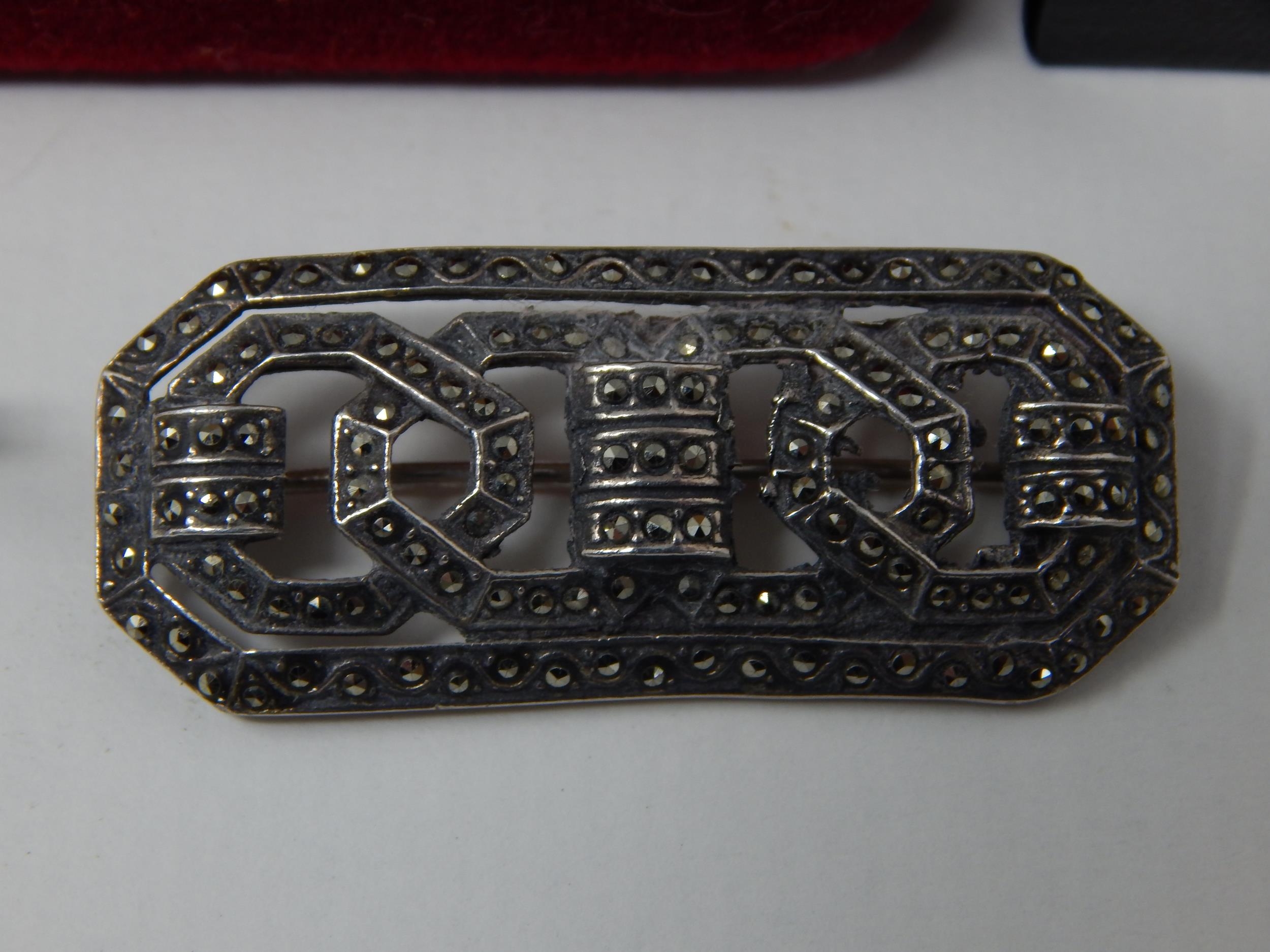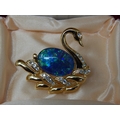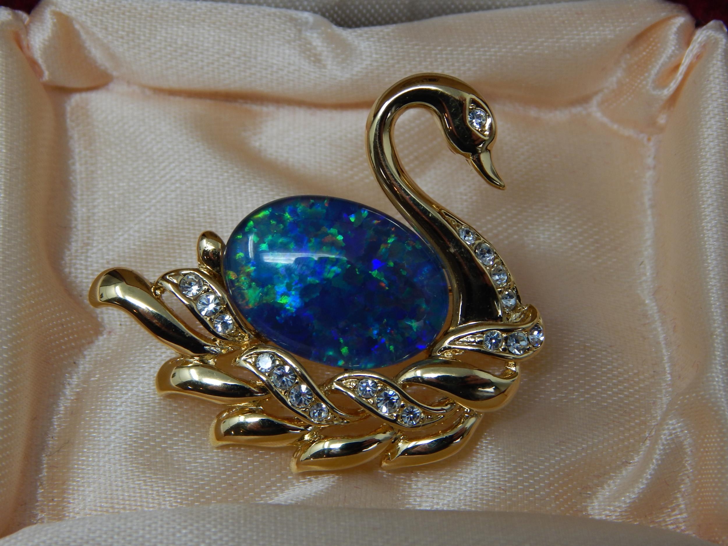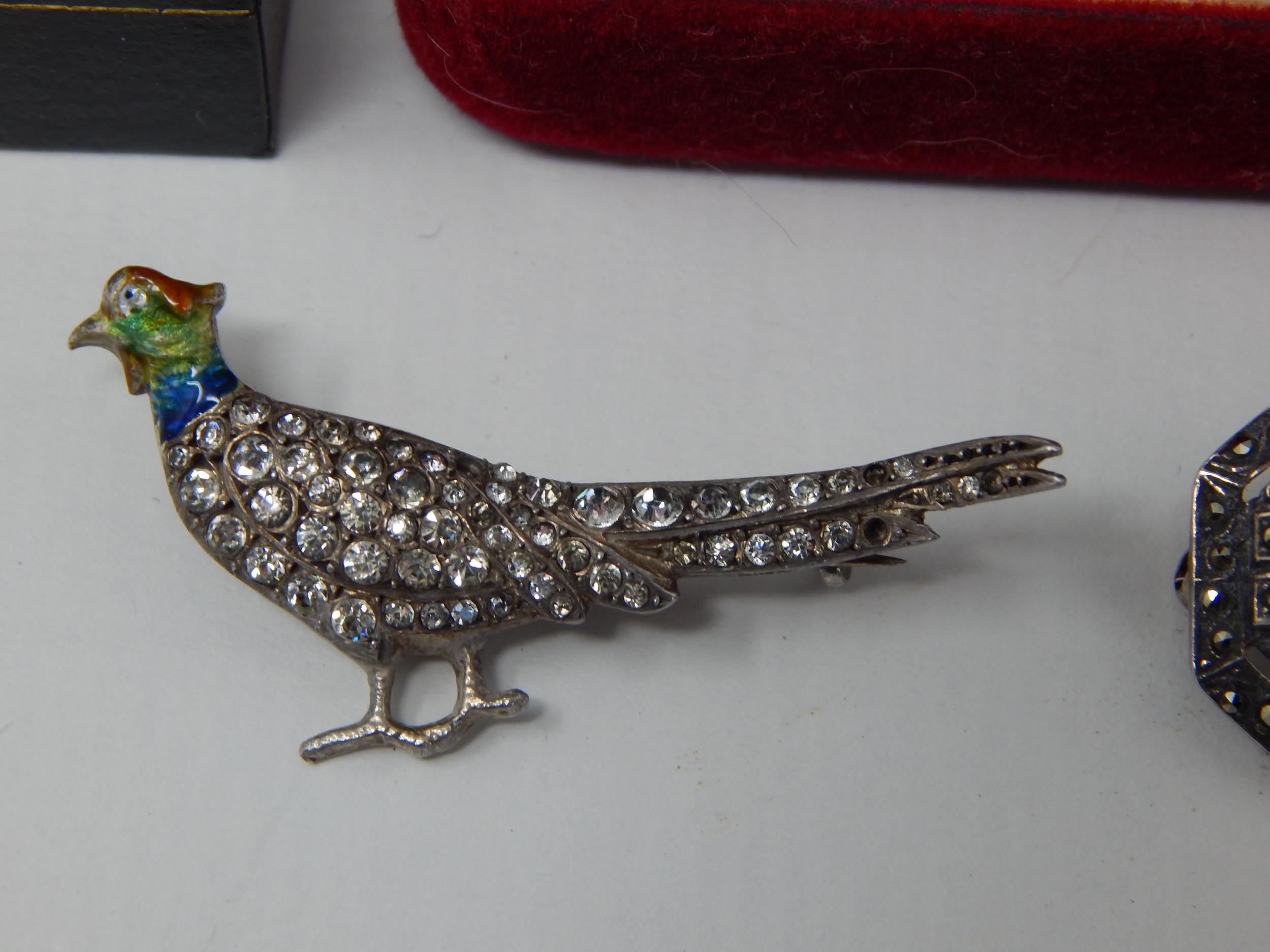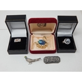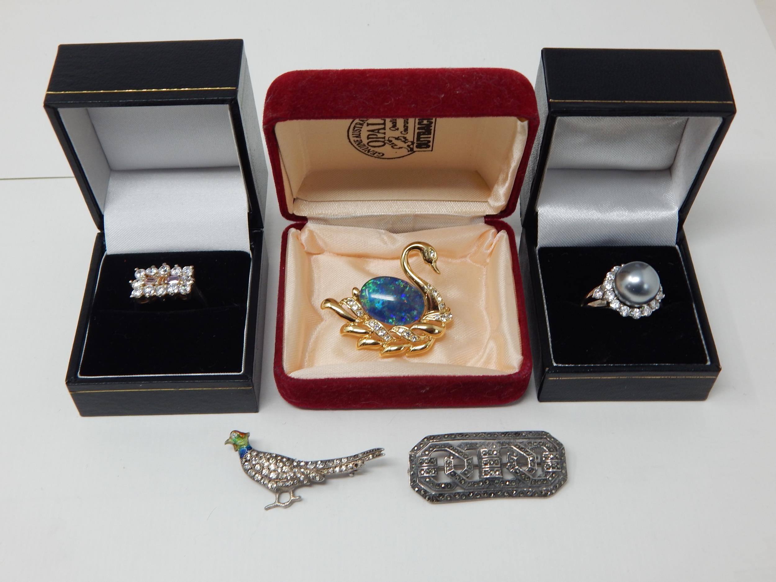 Two Silver Gem Set Rings in Fitted Case together with an Australian Opal Set Brooch Formed as a Swan, Art Deco Silver/Marcasite Brooch & a Silver & Enamel Pheasant Brooch.