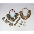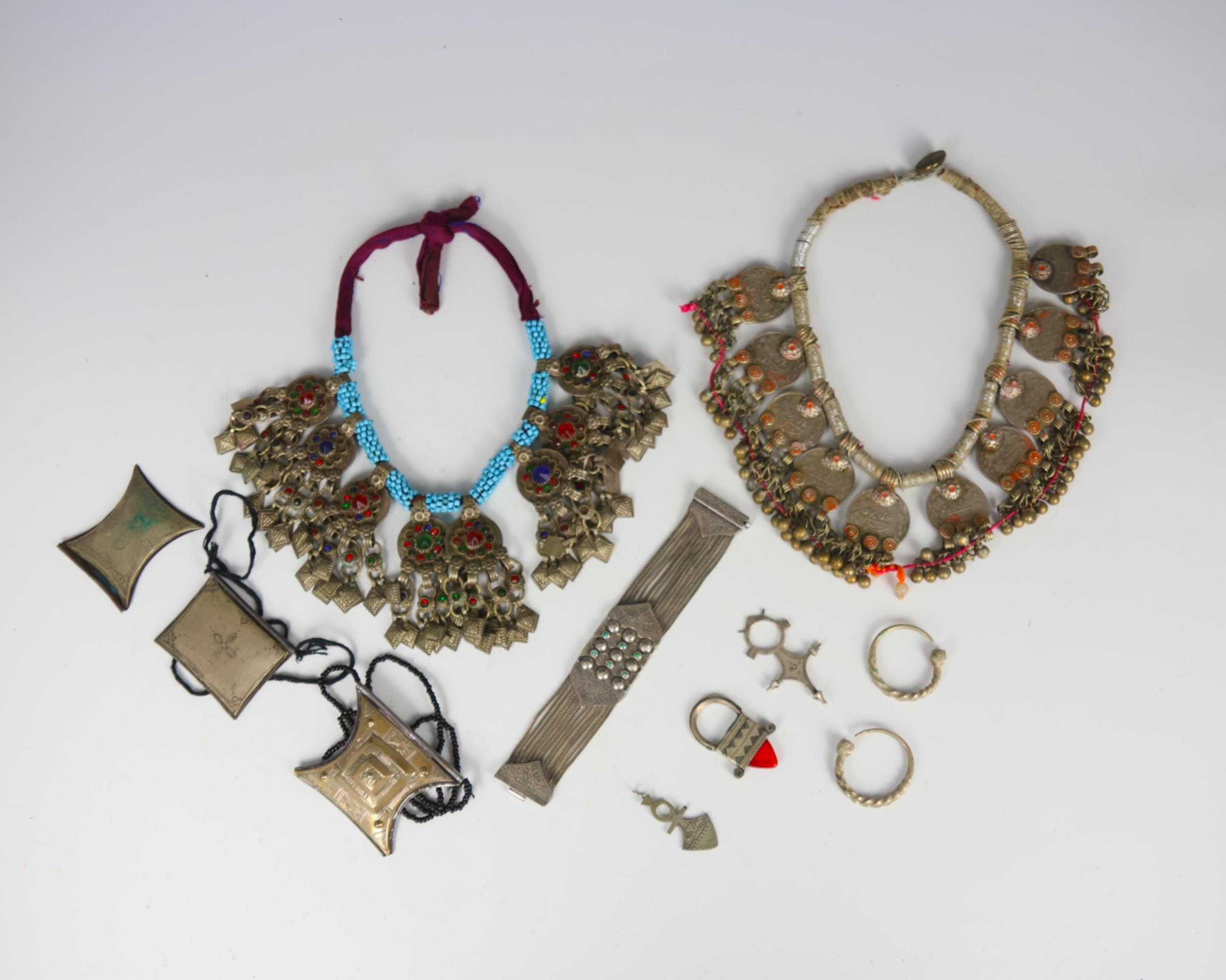 A selection of jewellery, majority tribal, including a Turkish bracelet, set with turquoise coloured stones, 17cm long, three various Niger In-gall pendants, a tribal pendant, possibly Afghan, and further jewellery (qty) (at fault)