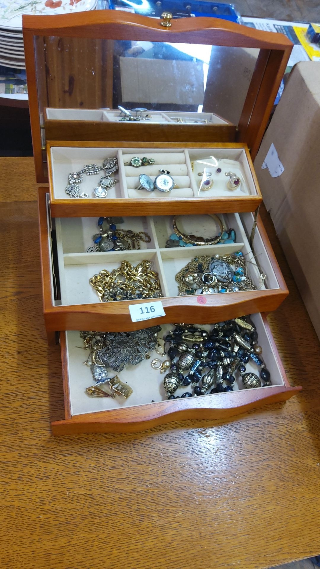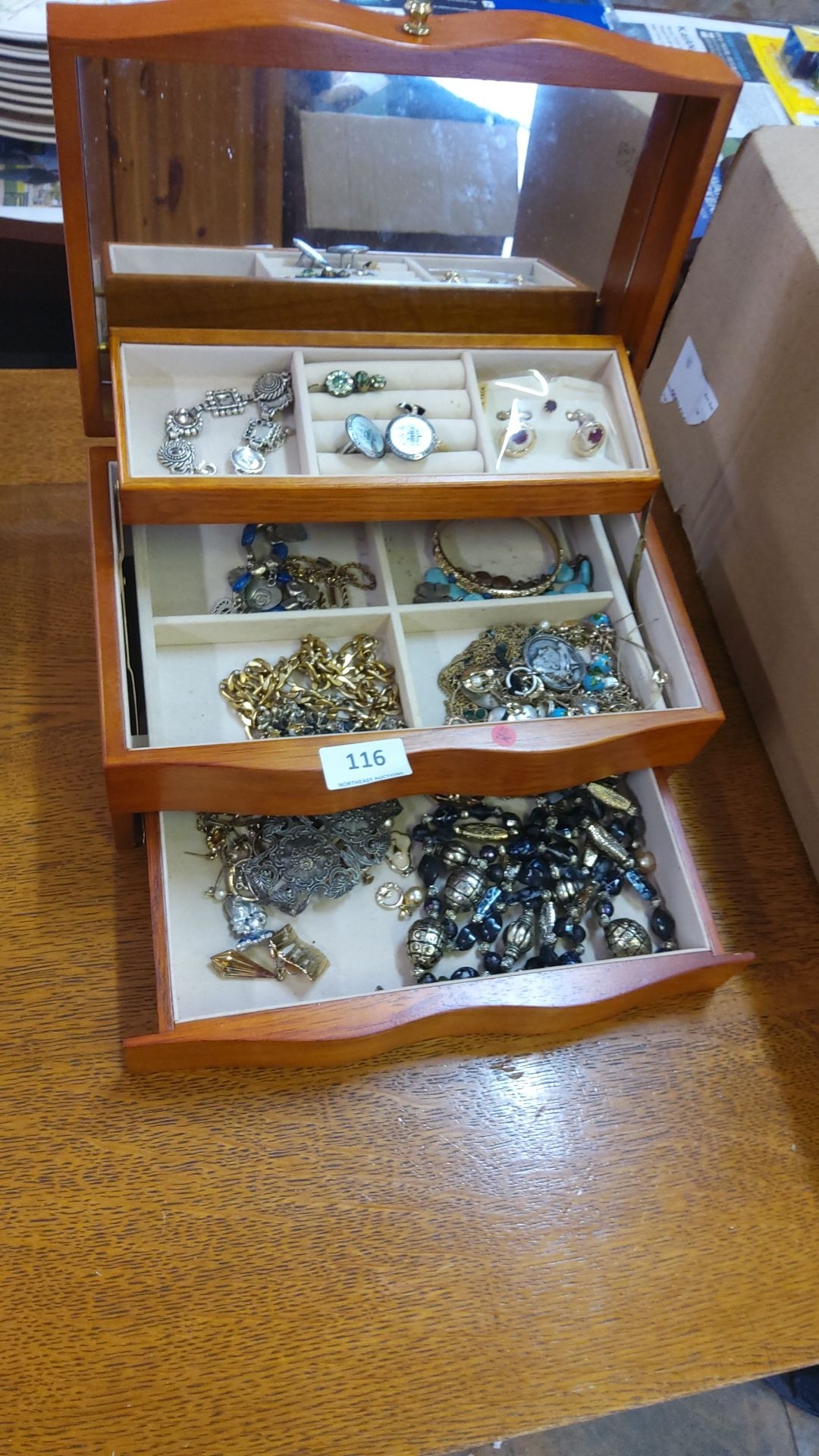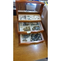 Wooden box containing assorted jewelry items such as rings, bracelets, and necklaces. Features mixed materials with gold tones and decorative elements.