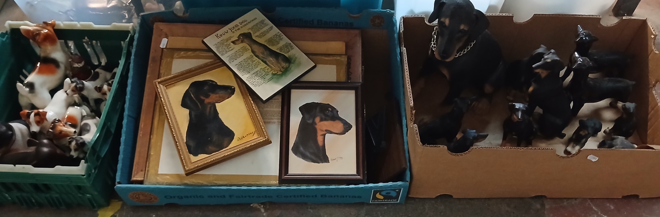 2 boxes of mainly dog figures, including 4 Beswick, together with a box of dog pictures