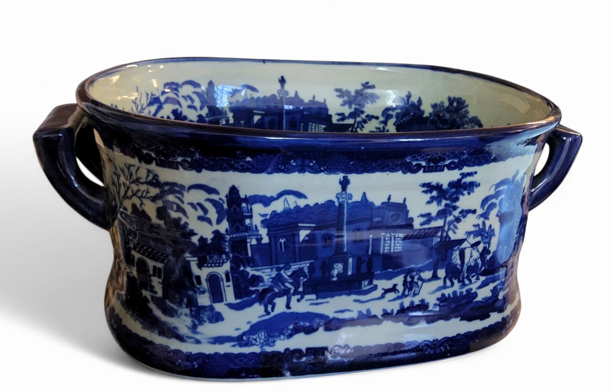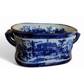 A large reproduction Ironstone foot bath, transfer printed with Continental city square scenes in underglaze blue, twin handles, 20cm high, 49cm wide