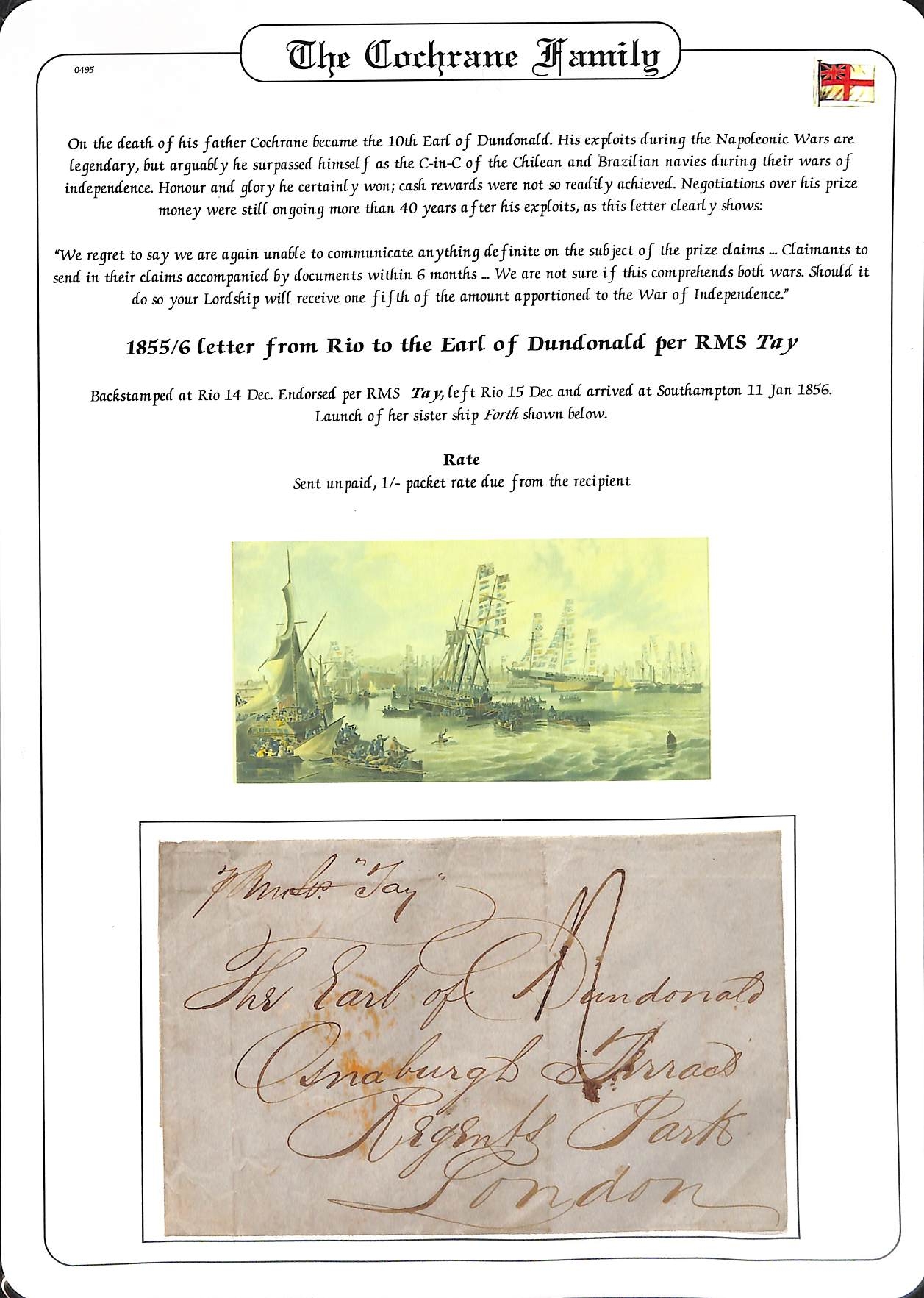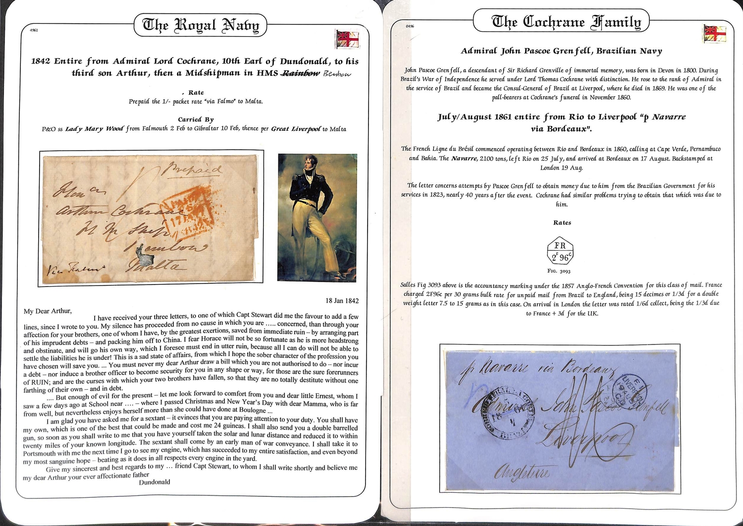 Admiral Lord Cochrane. 1842 (Jan 17) Letter from Lord Cochrane, 10th Earl of Dundonald prepaid 1/- from London to "Hon Arthur Cochrane, H.M Ship Benbow, Malta, via Falmouth", concerning sending his sextant to Arthur on a man of war from Portsmouth and warning against getting into debt as his other sons have; and 1856 letter from Rio de Janeiro to Cochrane concerning his ongoing efforts to claim prize money from his time as C-in-C of the Brazilian and Chilean navies during their wars of independence in 1817-25. Also an 1861 letter from Rio de Janeiro to his friend Admiral John Pascoe Grenfell who served alongside Cochrane in the Brazilian navy, with "FR / 2F96c"Anglo-French accountancy mark, also concerning efforts to get paid for his service in Brazil. Cochrane served with distinction in the British, Chilean, Brazilian and Greek navies rising to Admiral in all services, helping to secure the independence of Chile, Peru and Brazil. (3).