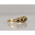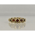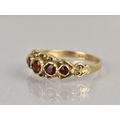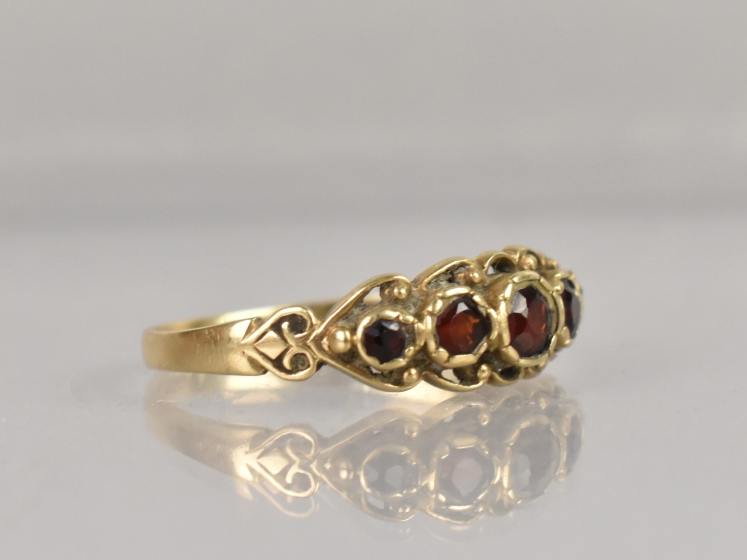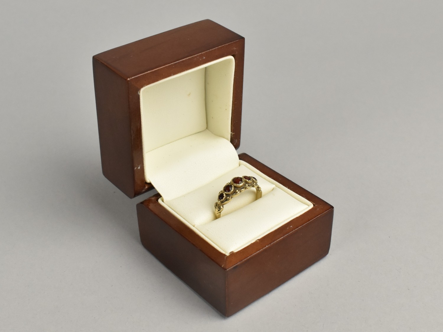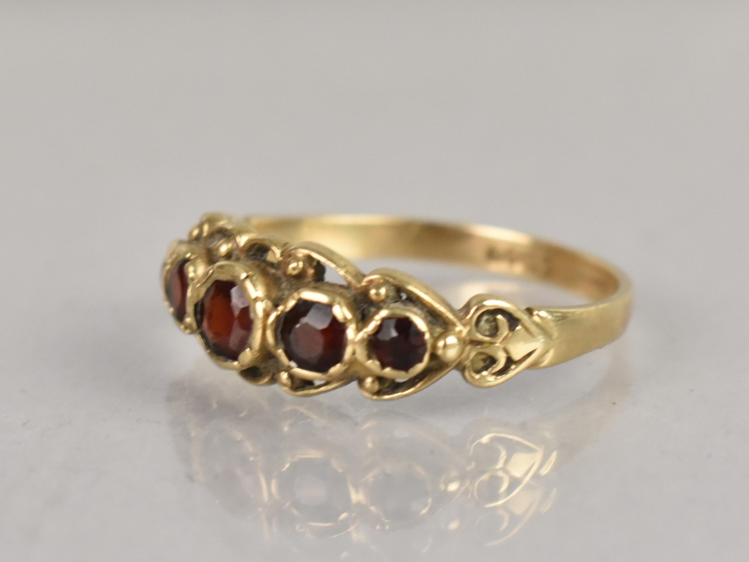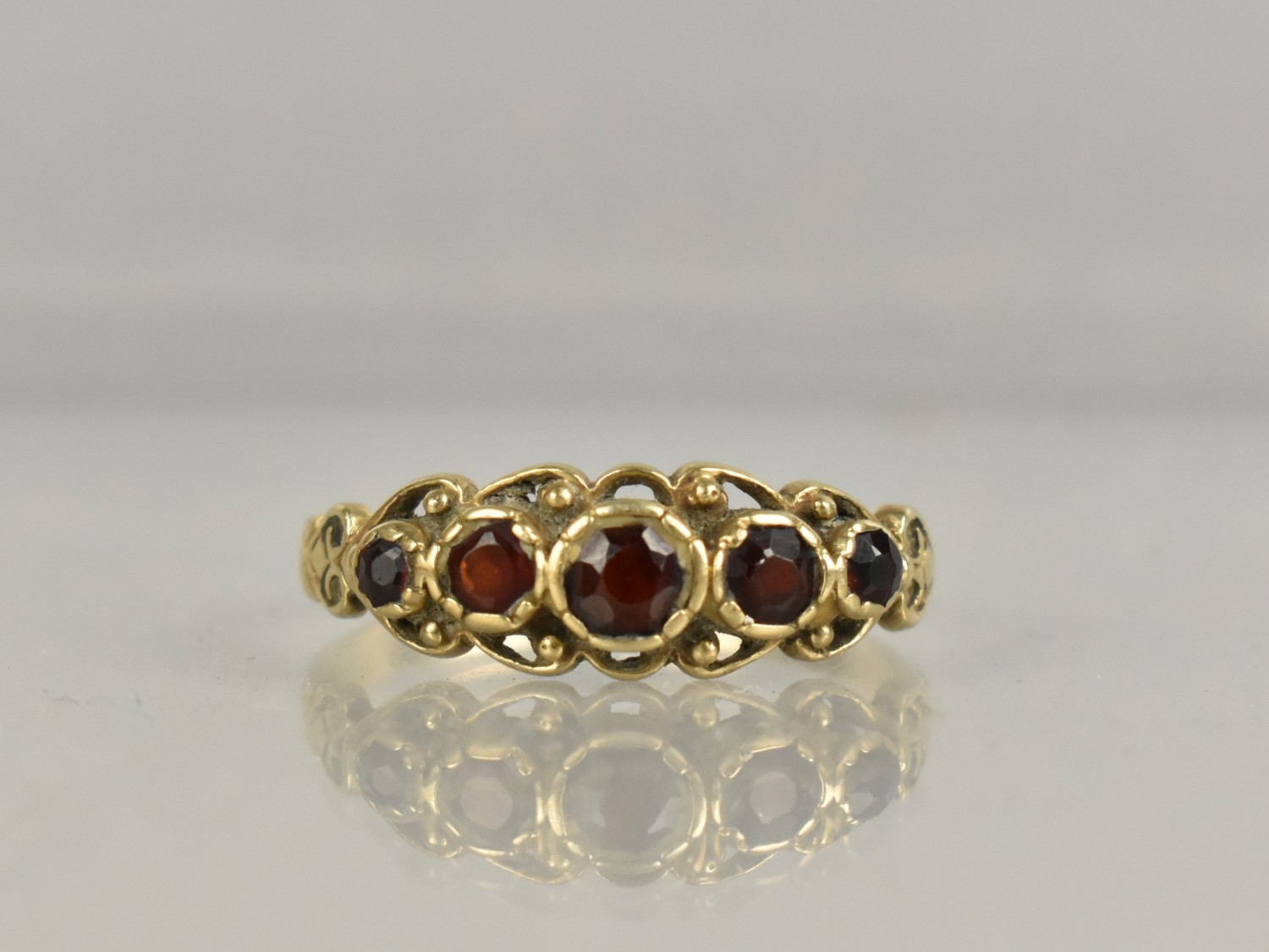 A 19th Century Style 9ct Gold and Garnet Five Stone Ring, Primary Round Cut Stone Approx 3.4mm Diameter, Collet Set and Having a Scrolling Wirework Frame to a Polished Flattened Band, British Hallmarks to the Interior for 9ct but Additional Marks Illegible, Size P, 2.1gms