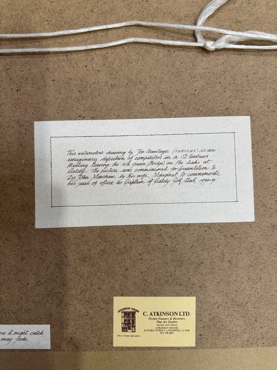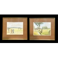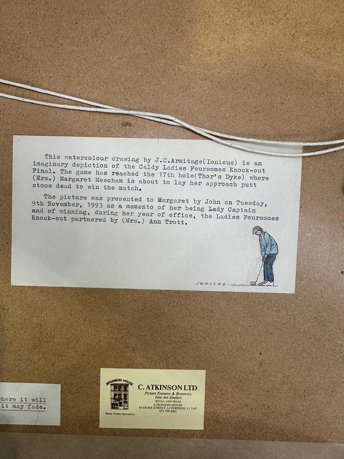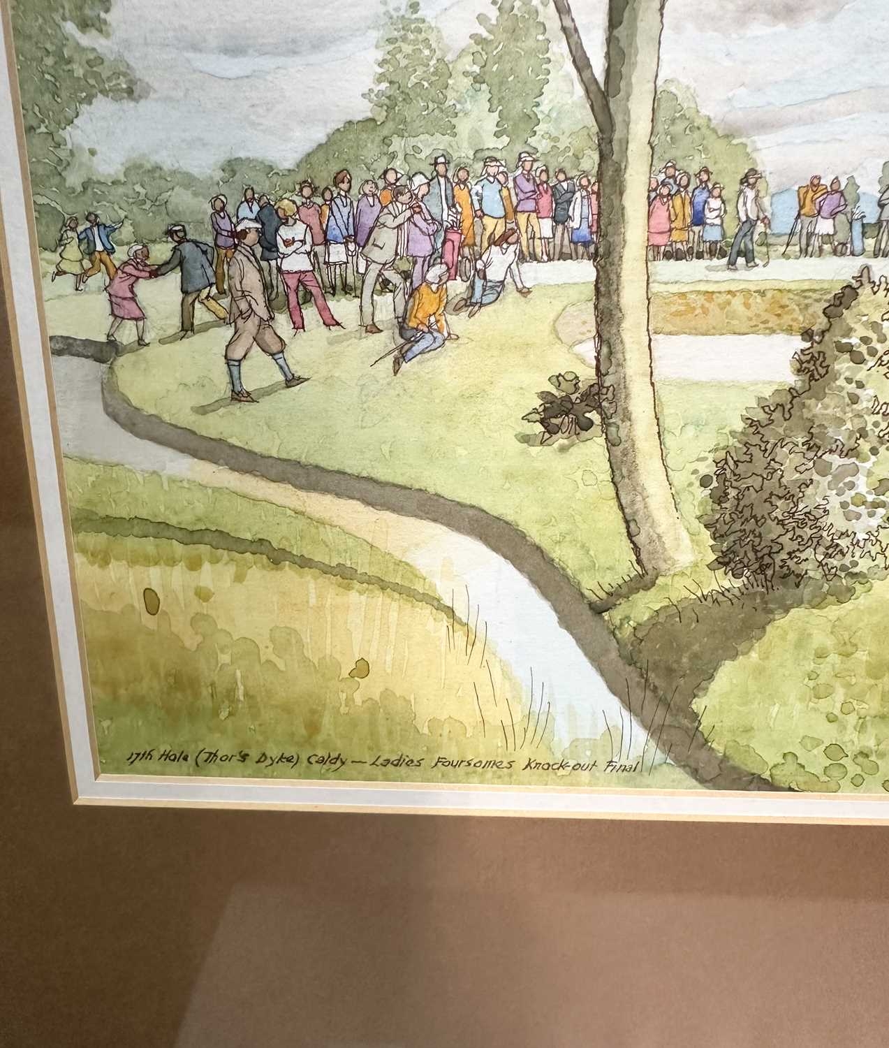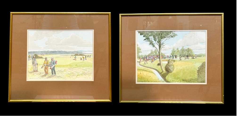Joshua Charles Armitage (Ionicus) (British, 1913-1998), A Medal Round: the 10th Hole (Bridge), Caldy Golf Club, signed and dated 1991 l.r., titled l.l., watercolour, 23 by 30cm; and another, 17th Hole (Thors Dyke) Caldy - Ladies Foursomes Knock-Out Final, signed and dated 1993 l.r., titled l.l., watercolour, 22 by 29cm, both framed (2). Note: Artist Resale Rights apply (2)