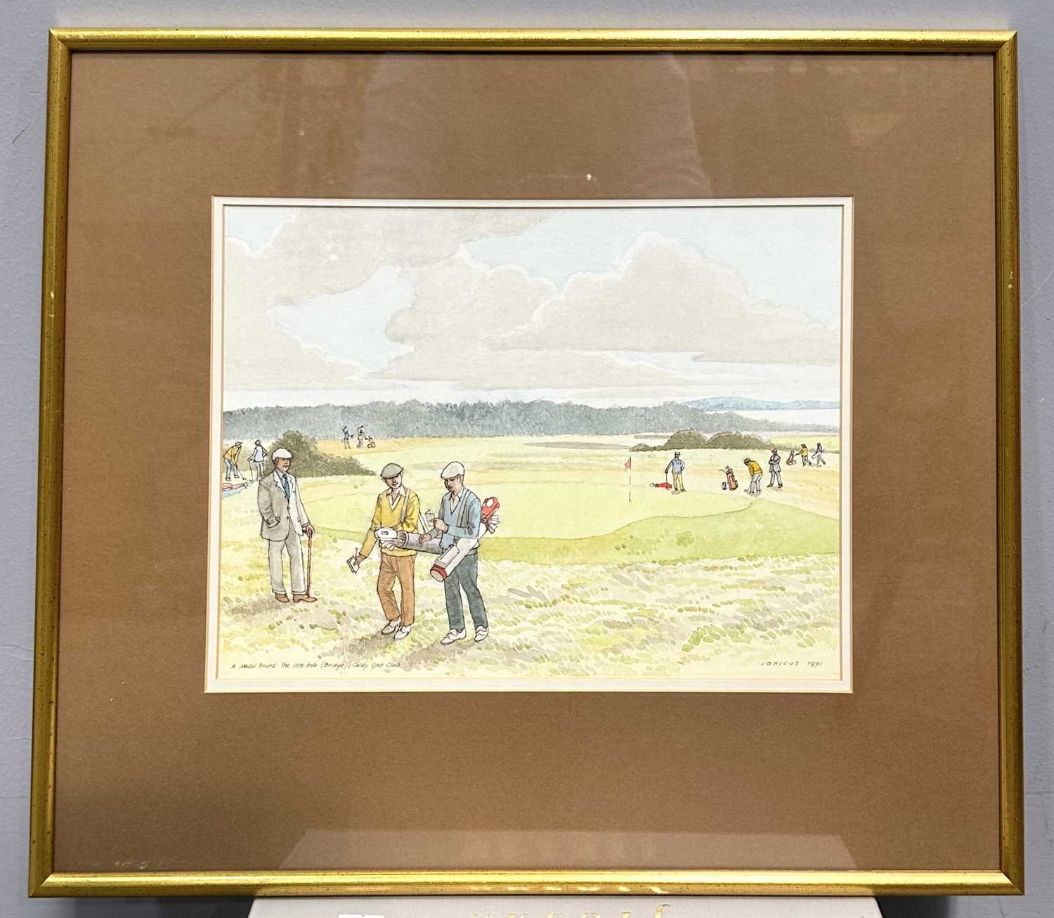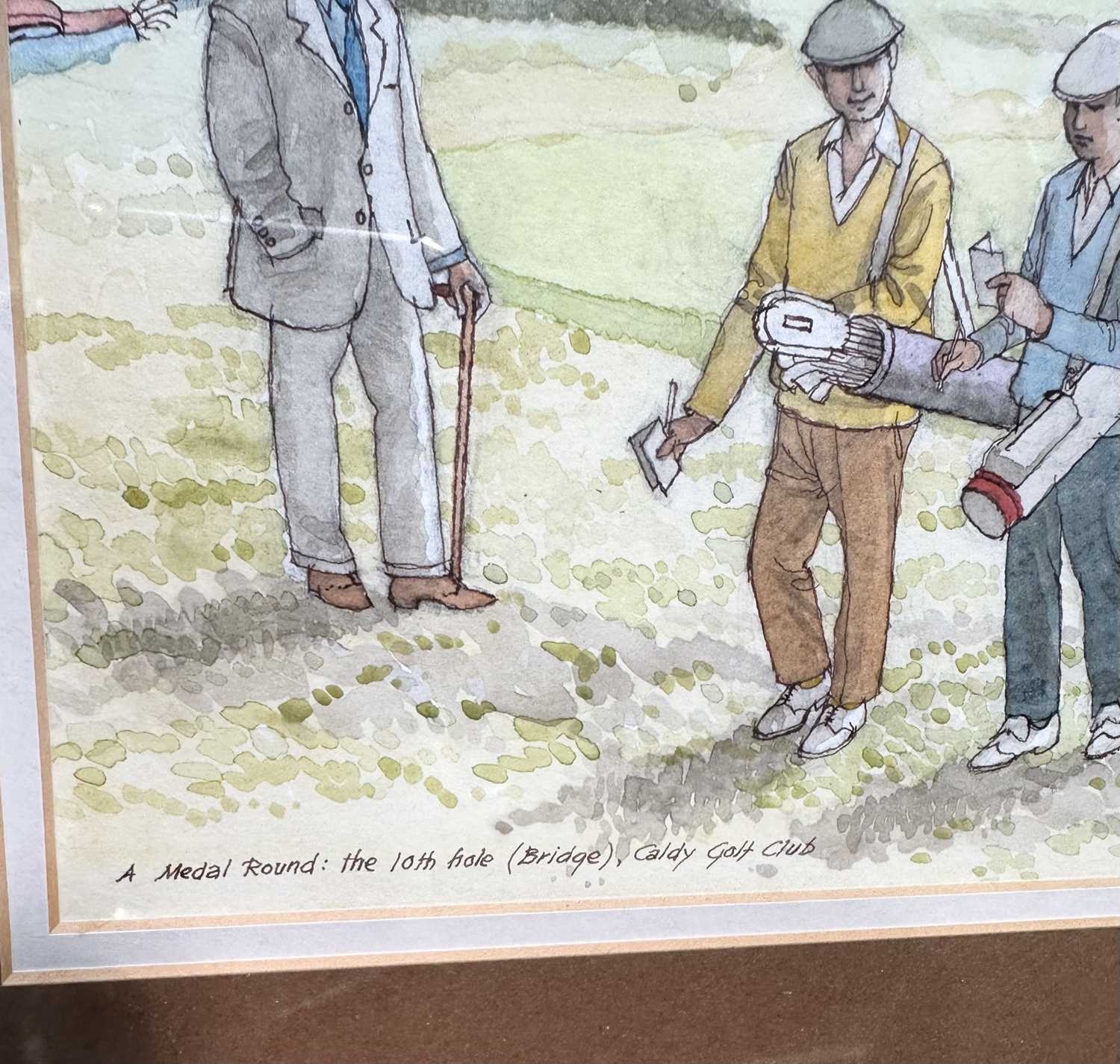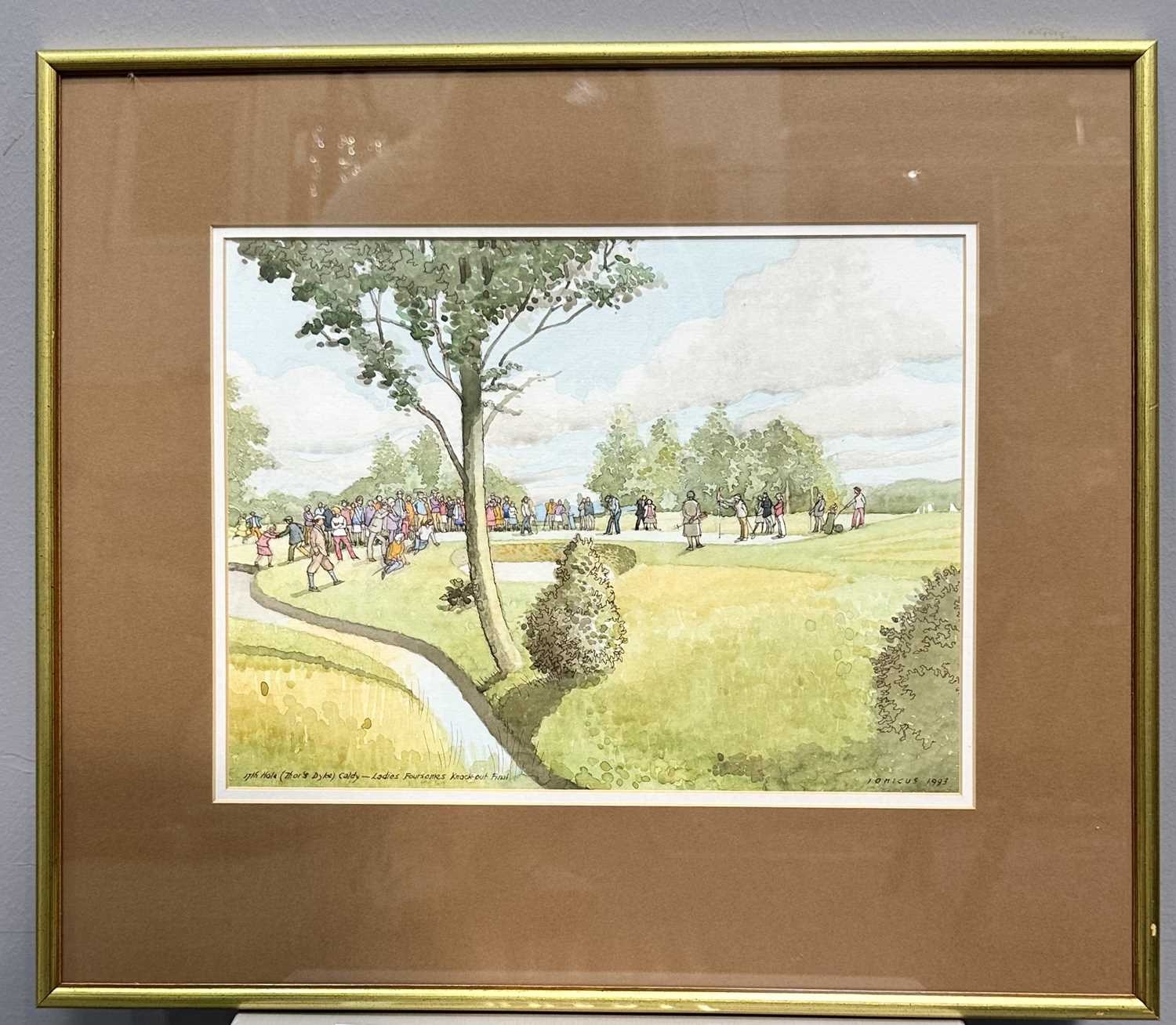 Joshua Charles Armitage (Ionicus) (British, 1913-1998), A Medal Round: the 10th Hole (Bridge), Caldy Golf Club, signed and dated 1991 l.r., titled l.l., watercolour, 23 by 30cm; and another, 17th Hole (Thors Dyke) Caldy - Ladies Foursomes Knock-Out Final, signed and dated 1993 l.r., titled l.l., watercolour, 22 by 29cm, both framed (2). Note: Artist Resale Rights apply (2)
