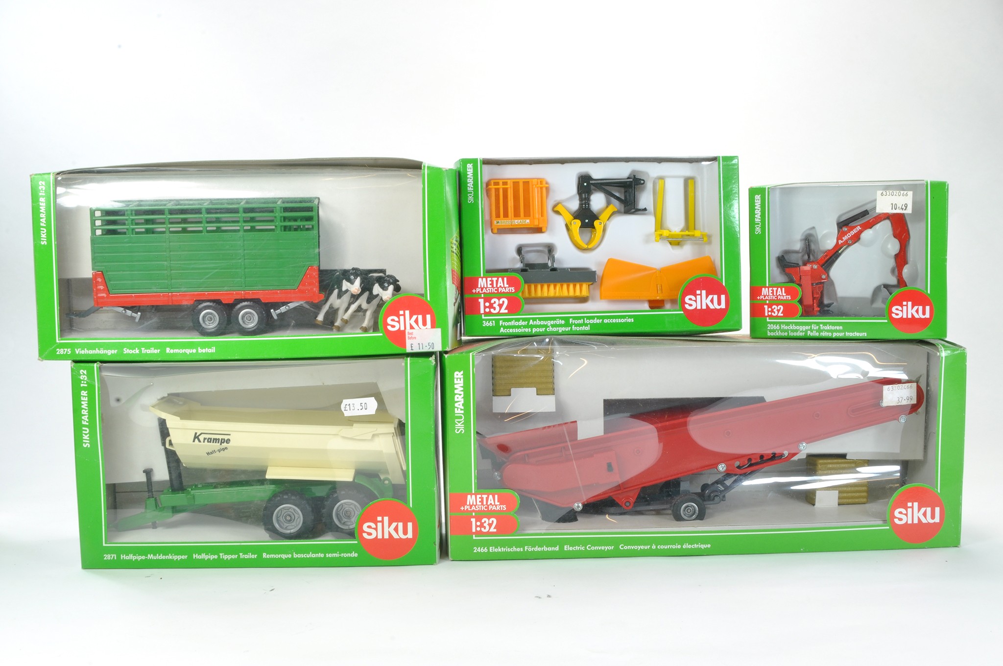 Siku 1/32 Model Farm Issues comprising five boxed implements. All look to have not been removed from boxes, hence excellent, some boxes with minor storage wear.