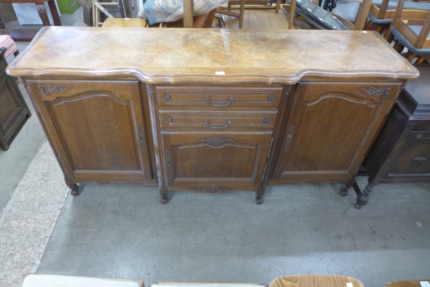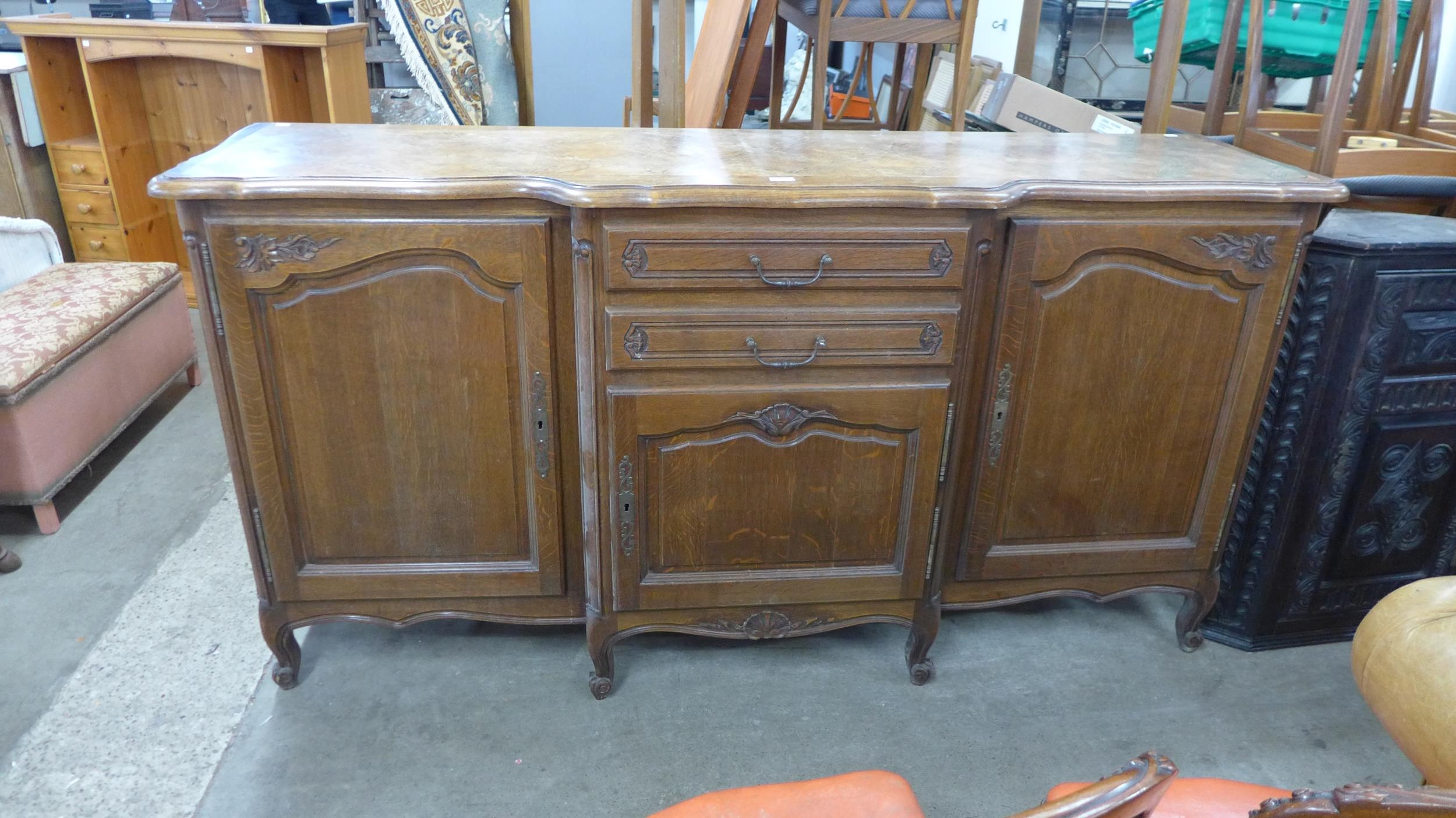 A large French carved oak breakfront sideboard