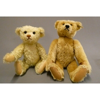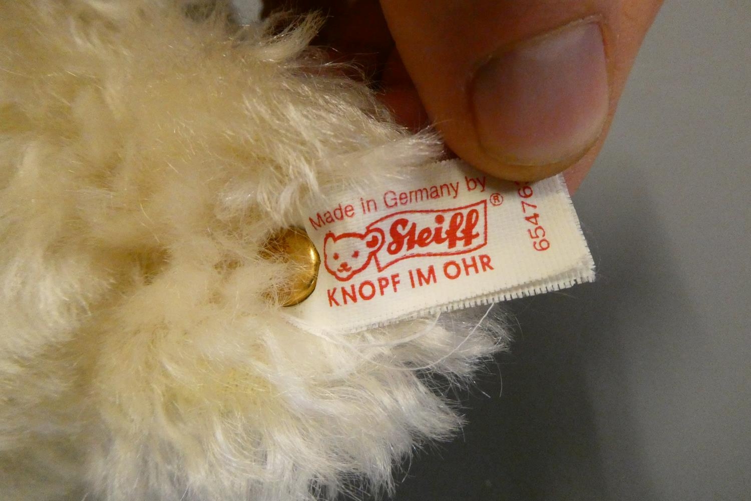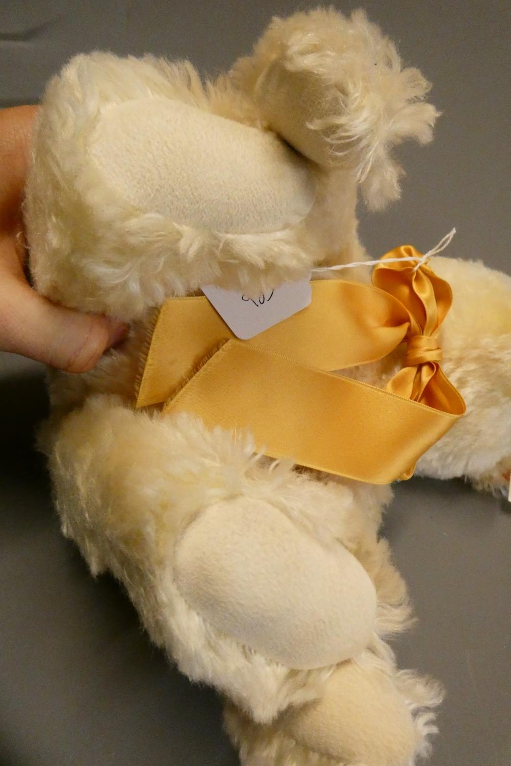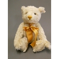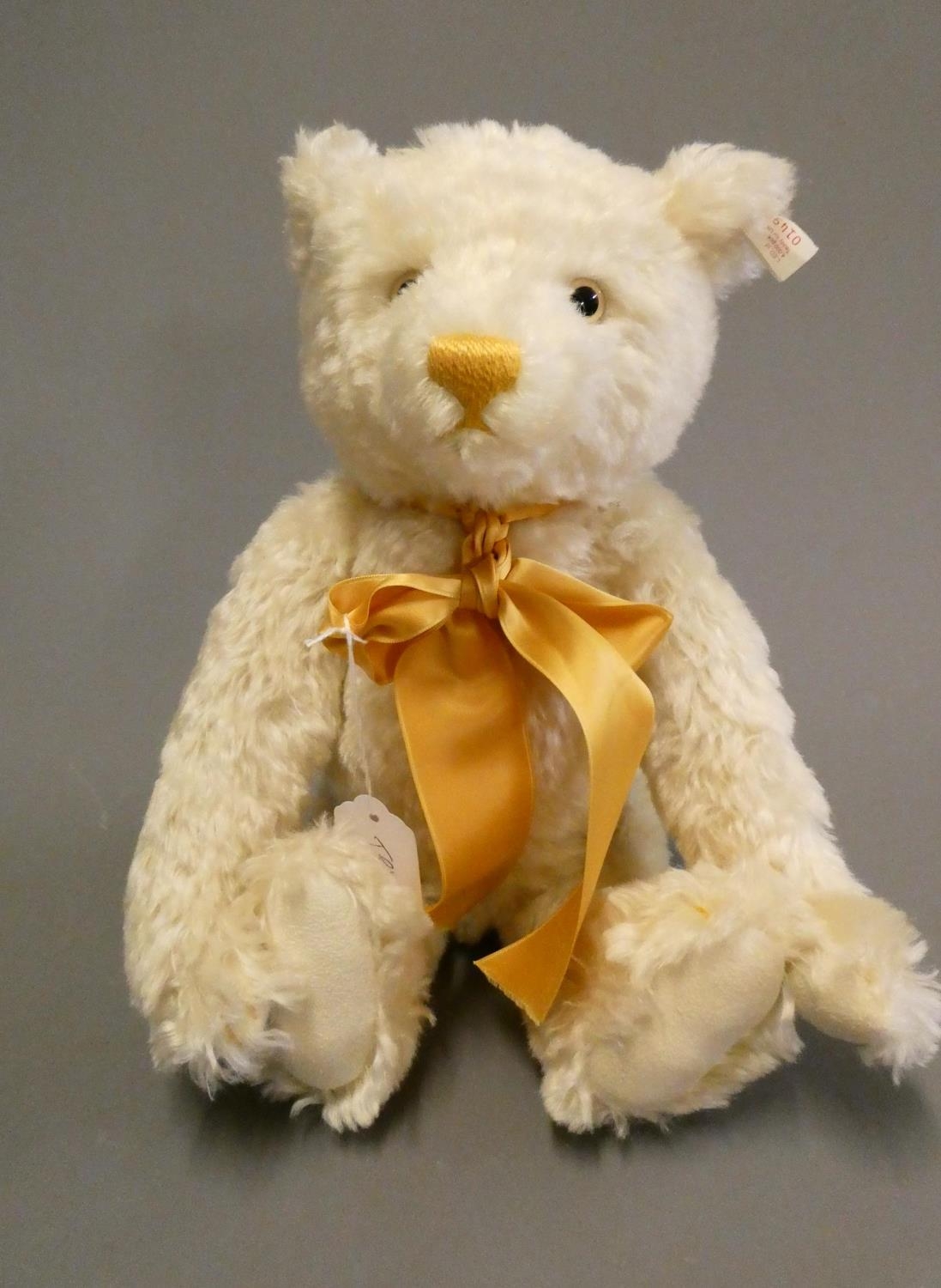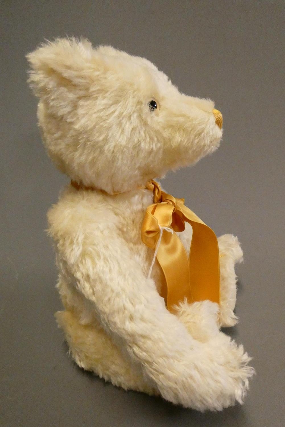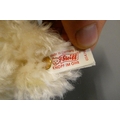 A white Steiff growling teddy bear, with gold sewn nose, matching bow, felt pads, ear stud and label, 15 3/4" long