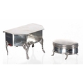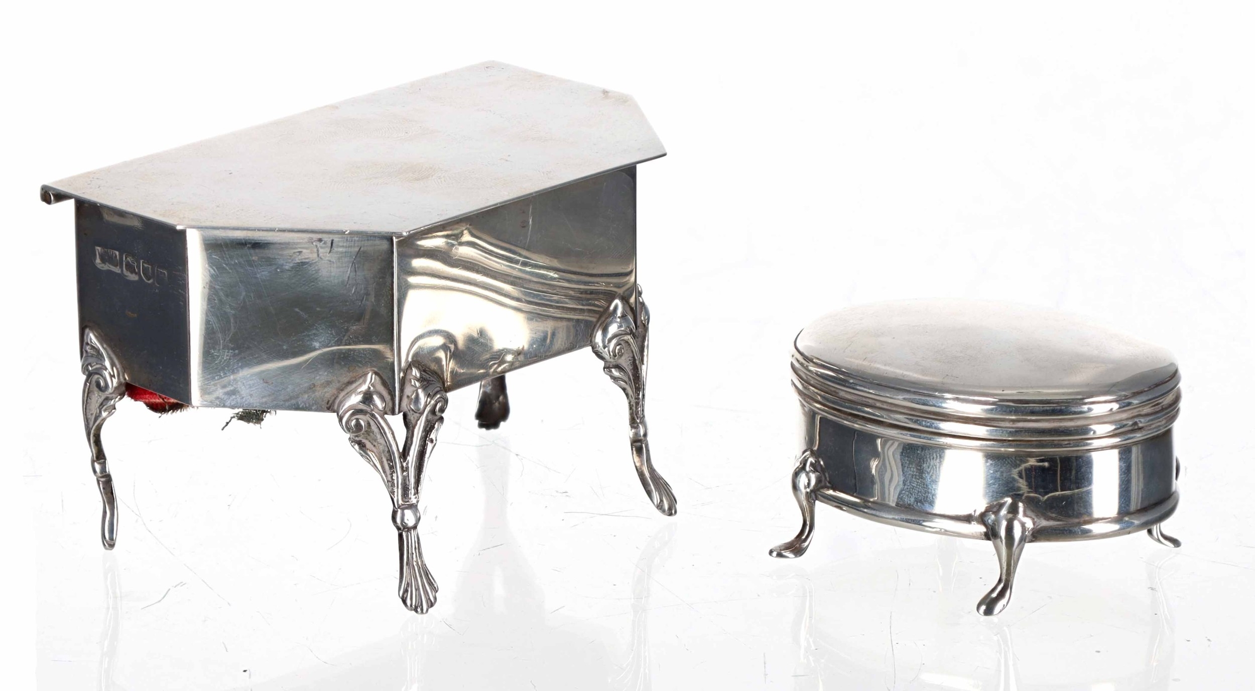 Mappin & Webb silver trinket/jewellery box, the hinged cover enclosing an open interior with baize cushion base, raised on scroll legs, 4" wide, 2.5" high, London 1907; together with a small oval trinket box with hinged cover, maker Deakin & Francis, Birmingham 1905, 2.75" wide (hinge at fault), 4.6oz t total (2)