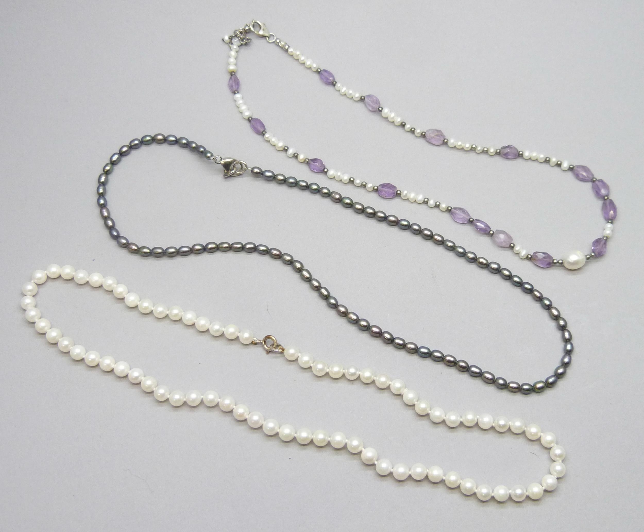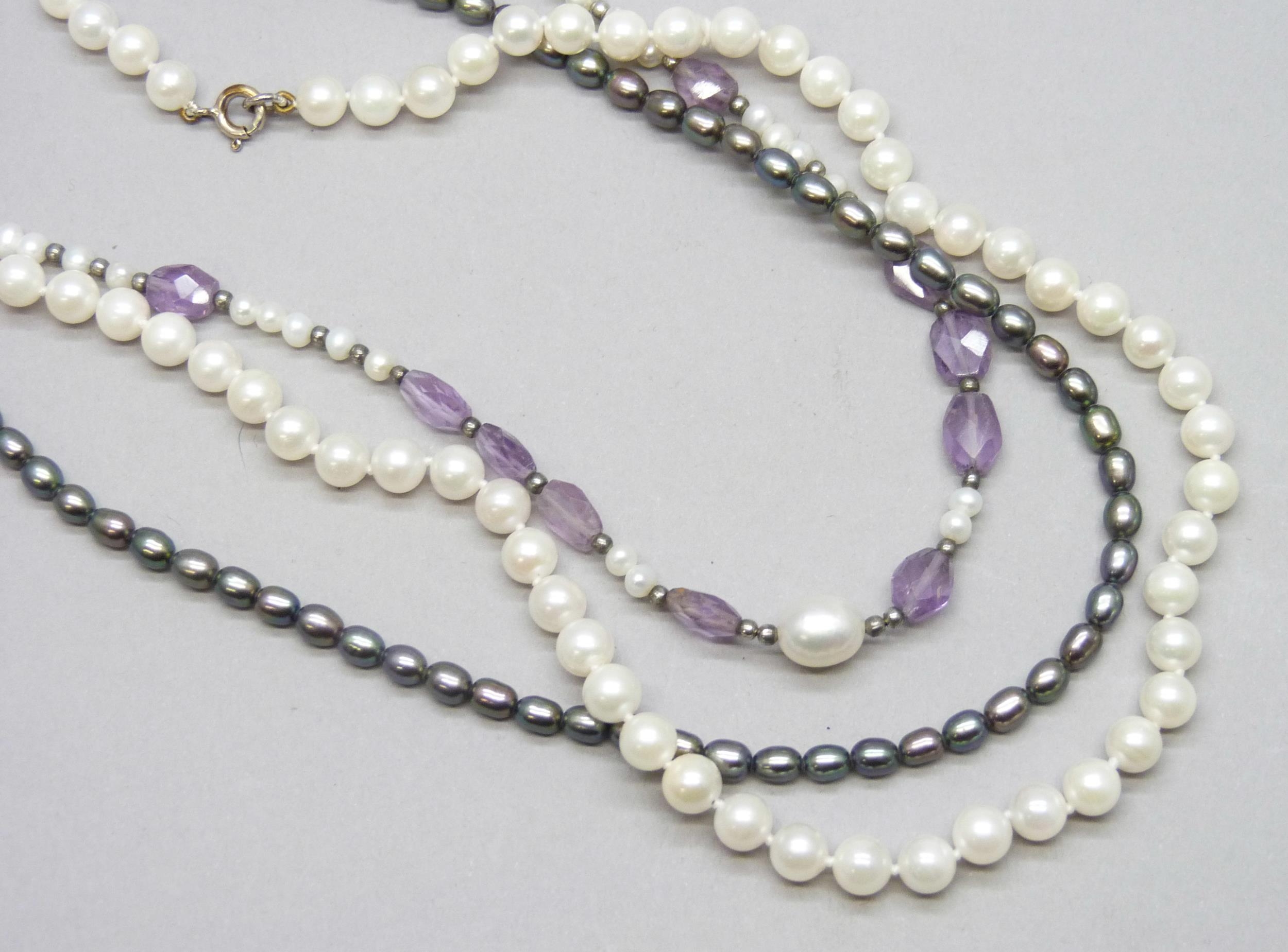Three pearl necklaces including a Honora example, and one with amethyst beads, 40g total weight