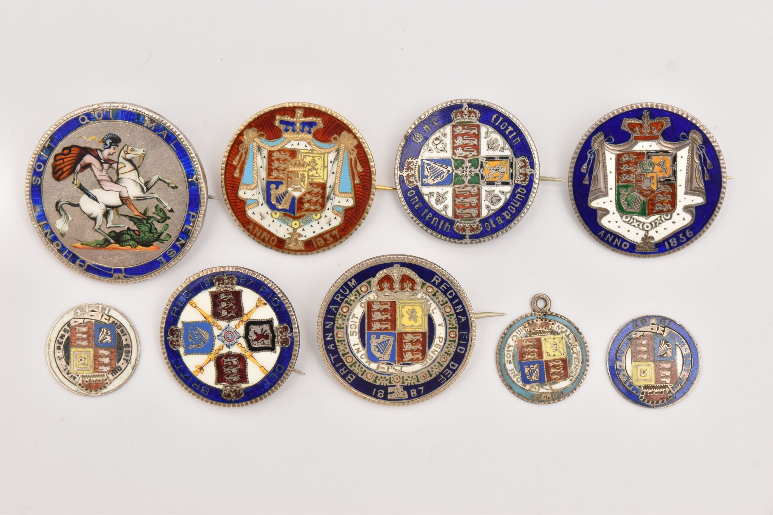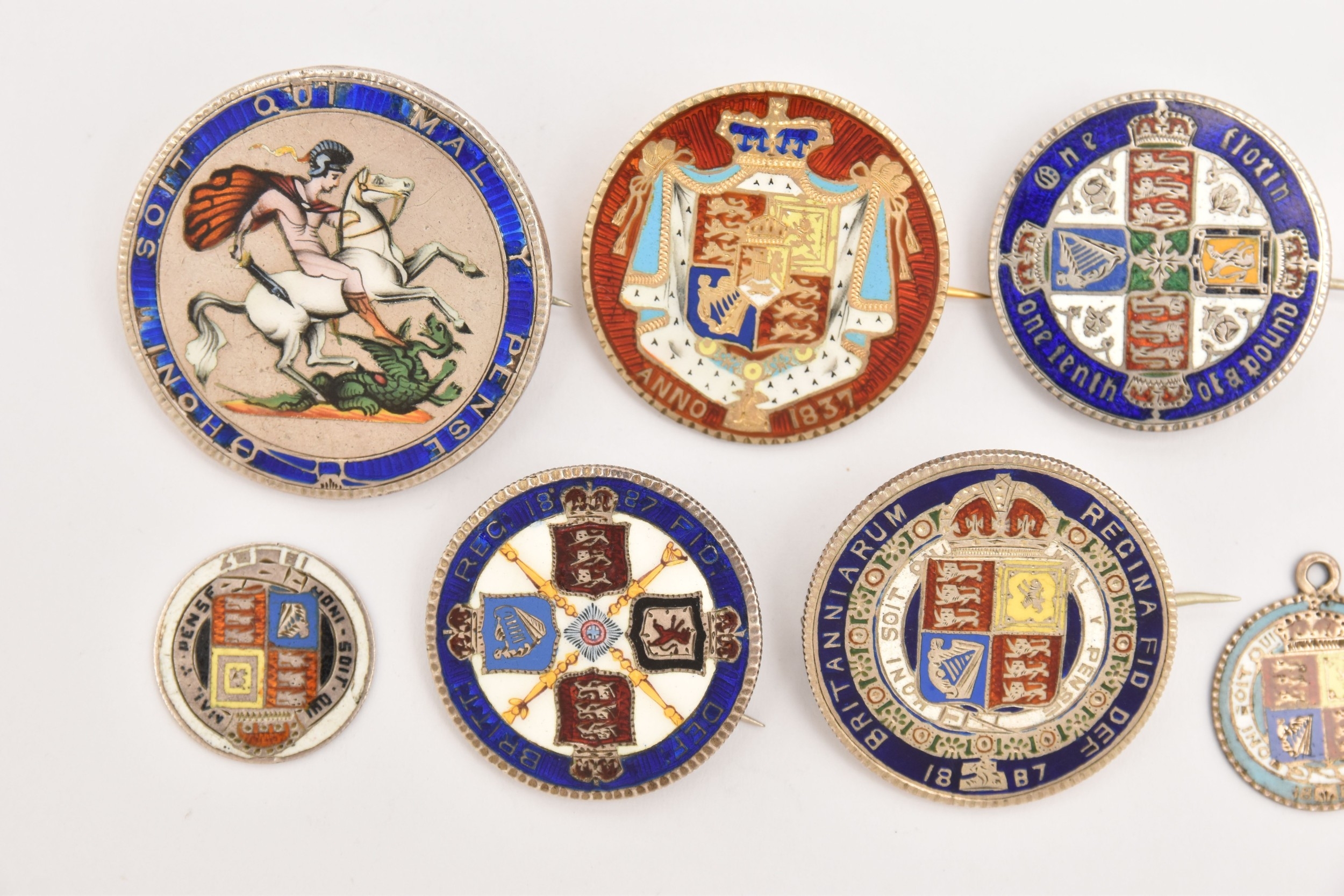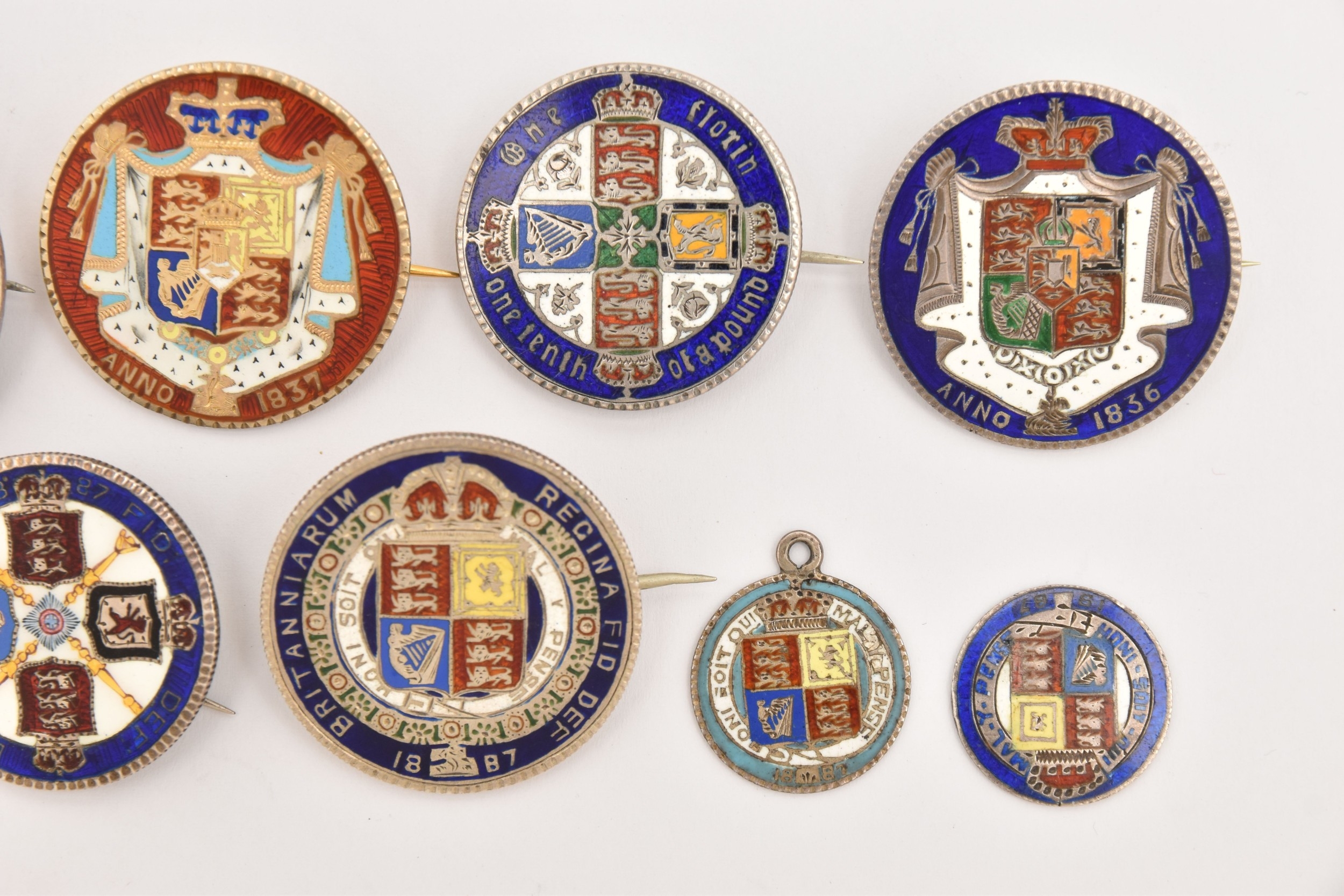 FIVE COINS consisting of three 1887 enameled sixpence (slight hairline cracks), an 1887 enameled florin brooch and an 1859 enameled florin brooch (5), Two enamelled Half Crown brooches 1936 and 1887 (2), Two enamelled coin brooches, 1837 gilt Half Crown and George III Crown (2)