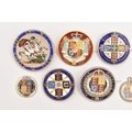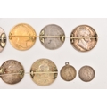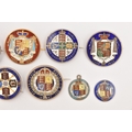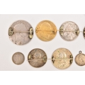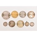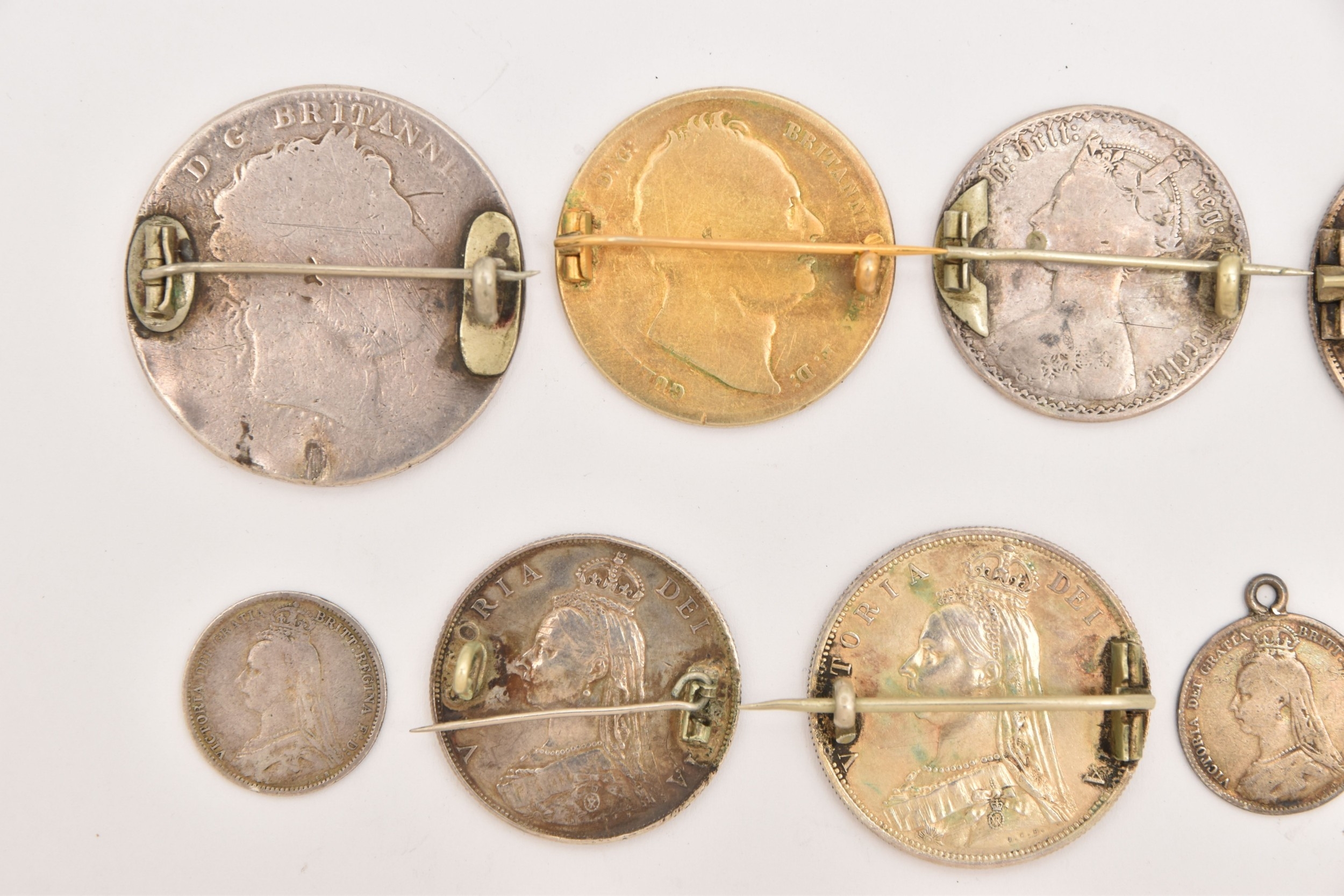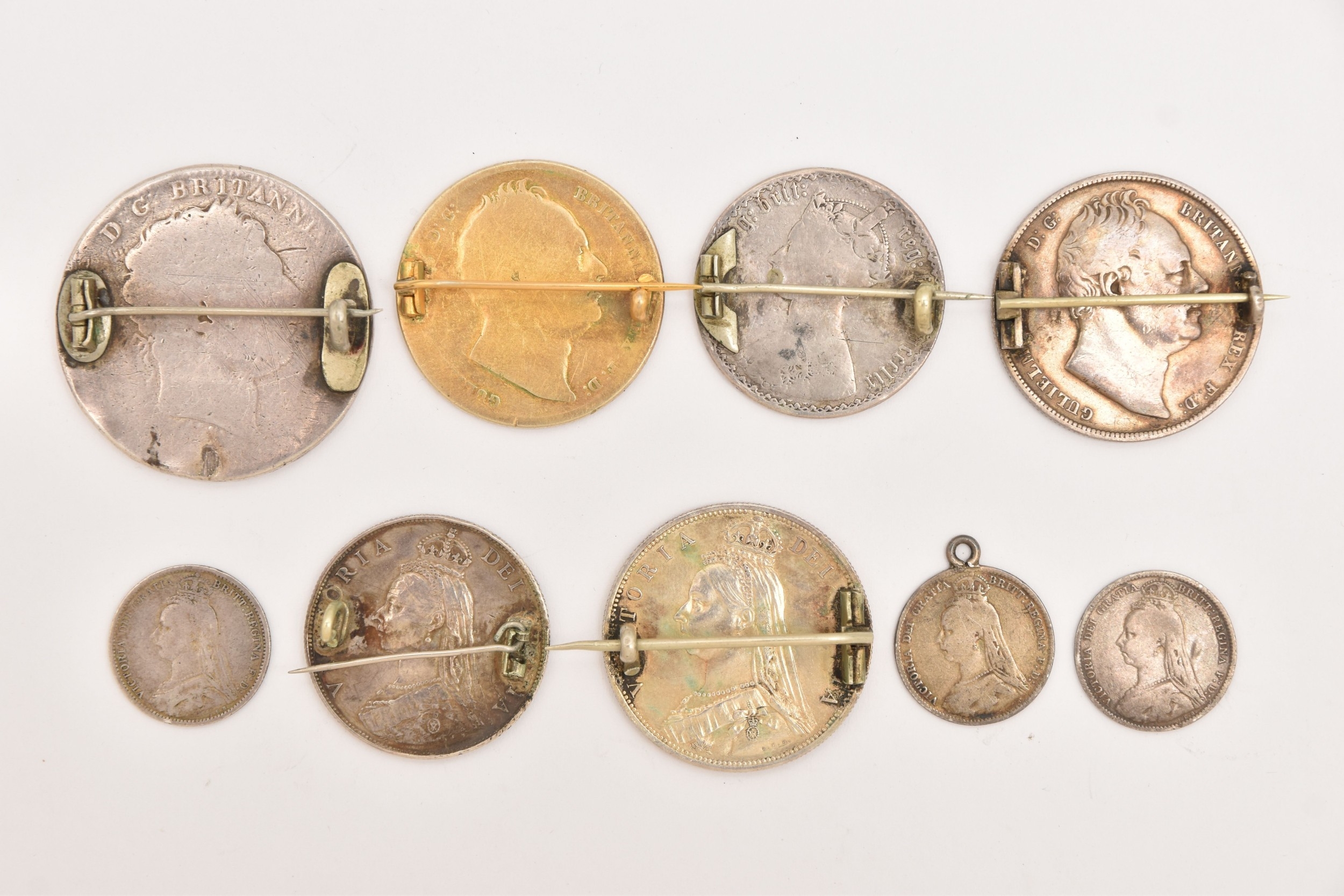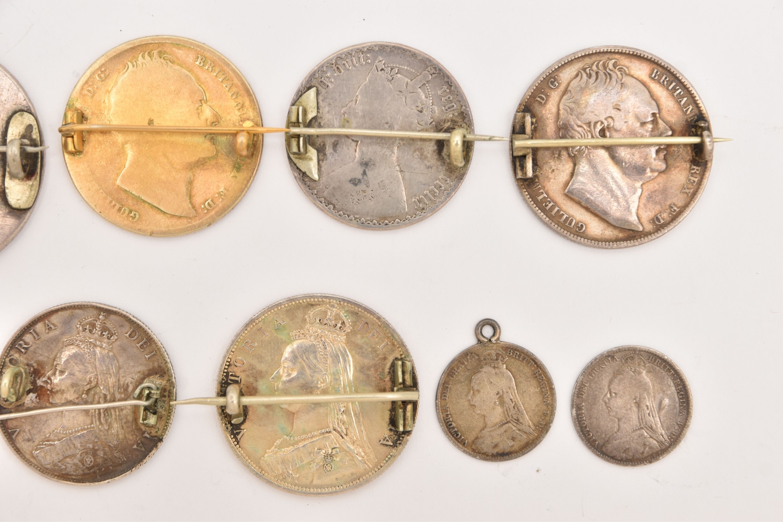 FIVE COINS consisting of three 1887 enameled sixpence (slight hairline cracks), an 1887 enameled florin brooch and an 1859 enameled florin brooch (5), Two enamelled Half Crown brooches 1936 and 1887 (2), Two enamelled coin brooches, 1837 gilt Half Crown and George III Crown (2)
