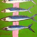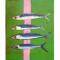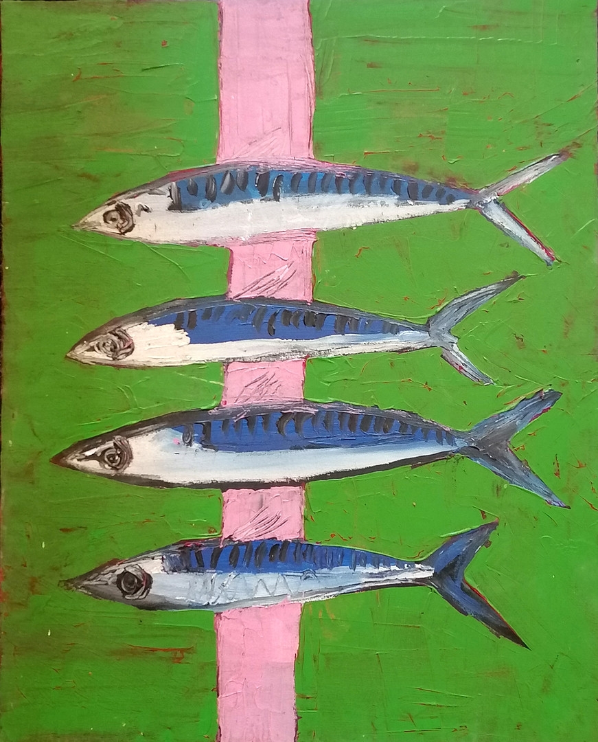 Contemporary oil painting on canvas of 4 mackerel on a green & pink background - 77cm x 61cm