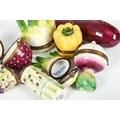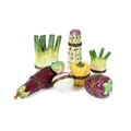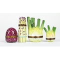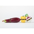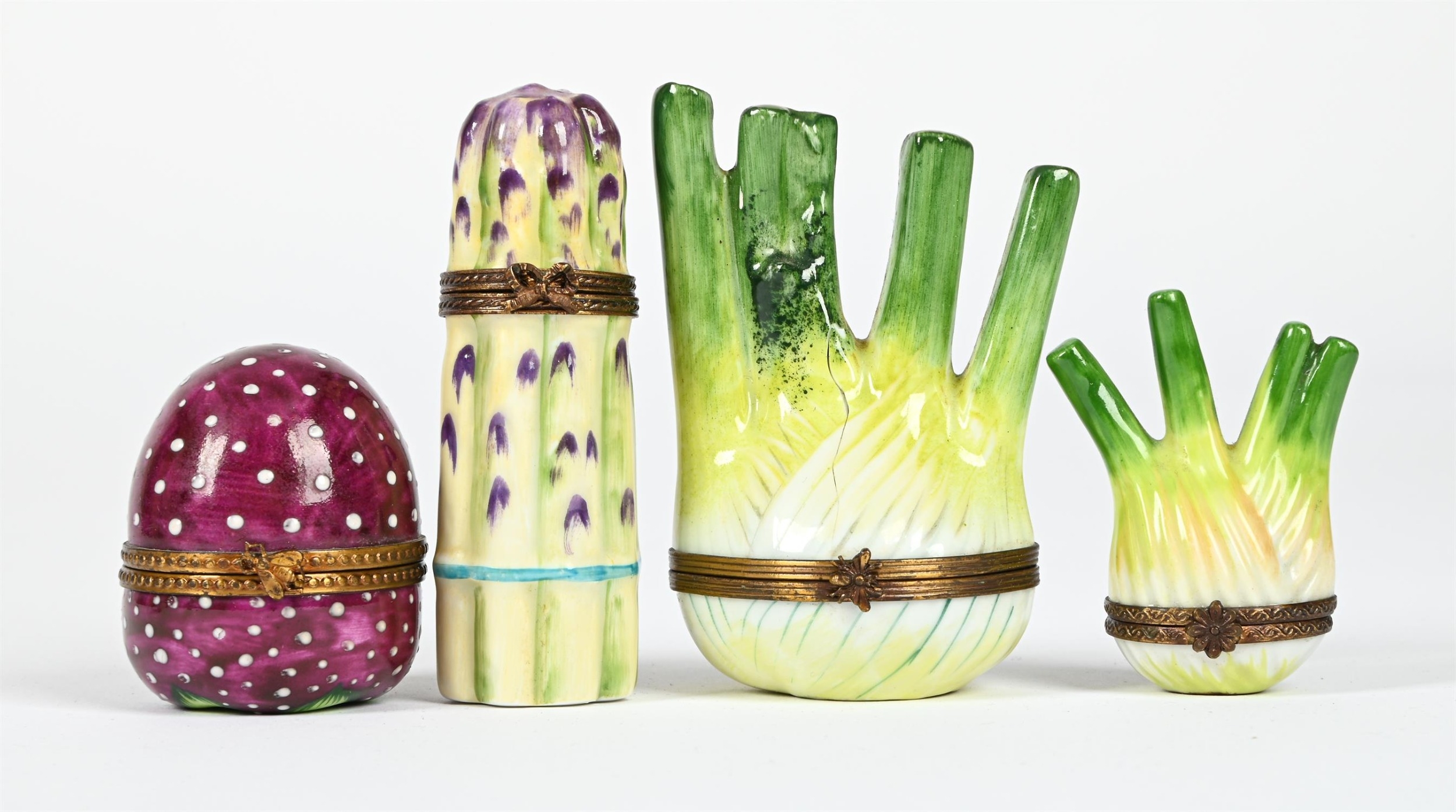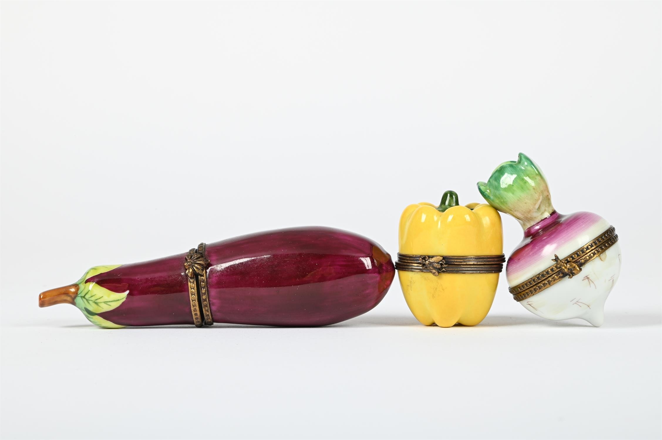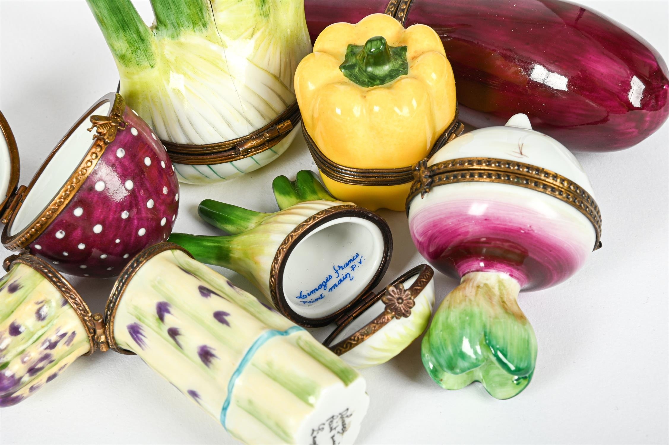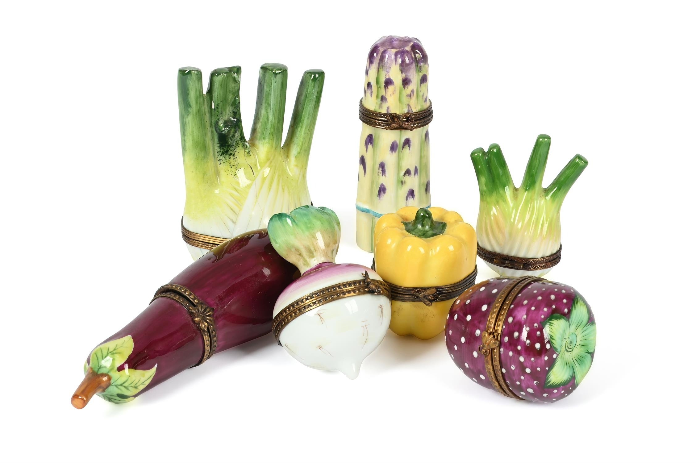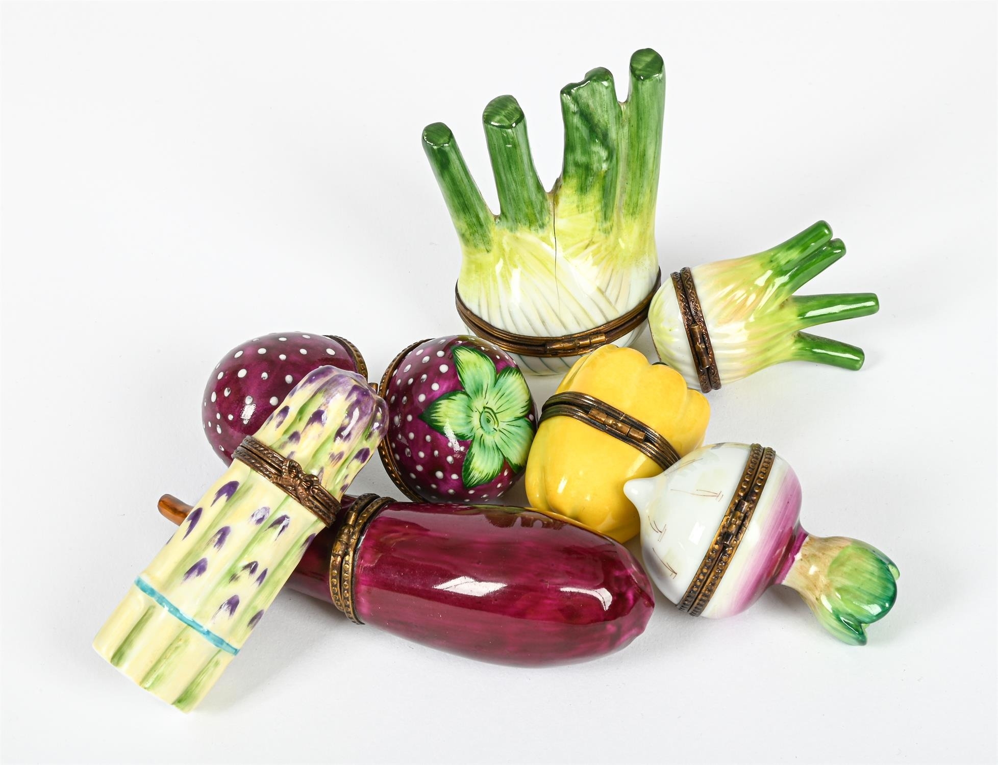 A COLLECTION OF SEVEN HAND PAINTED LIMOGES HINGED BOXES IN THE FORM OF FRUIT AND VEGTABLESMODERN'Limoges France, Petit Mains, P. V' including an aubergine, asparagus, two fennel, a strawberry, a bell pepper, and a turnipthe largest 13cm x 4cm, the smallest 5cm x 3cm