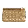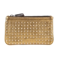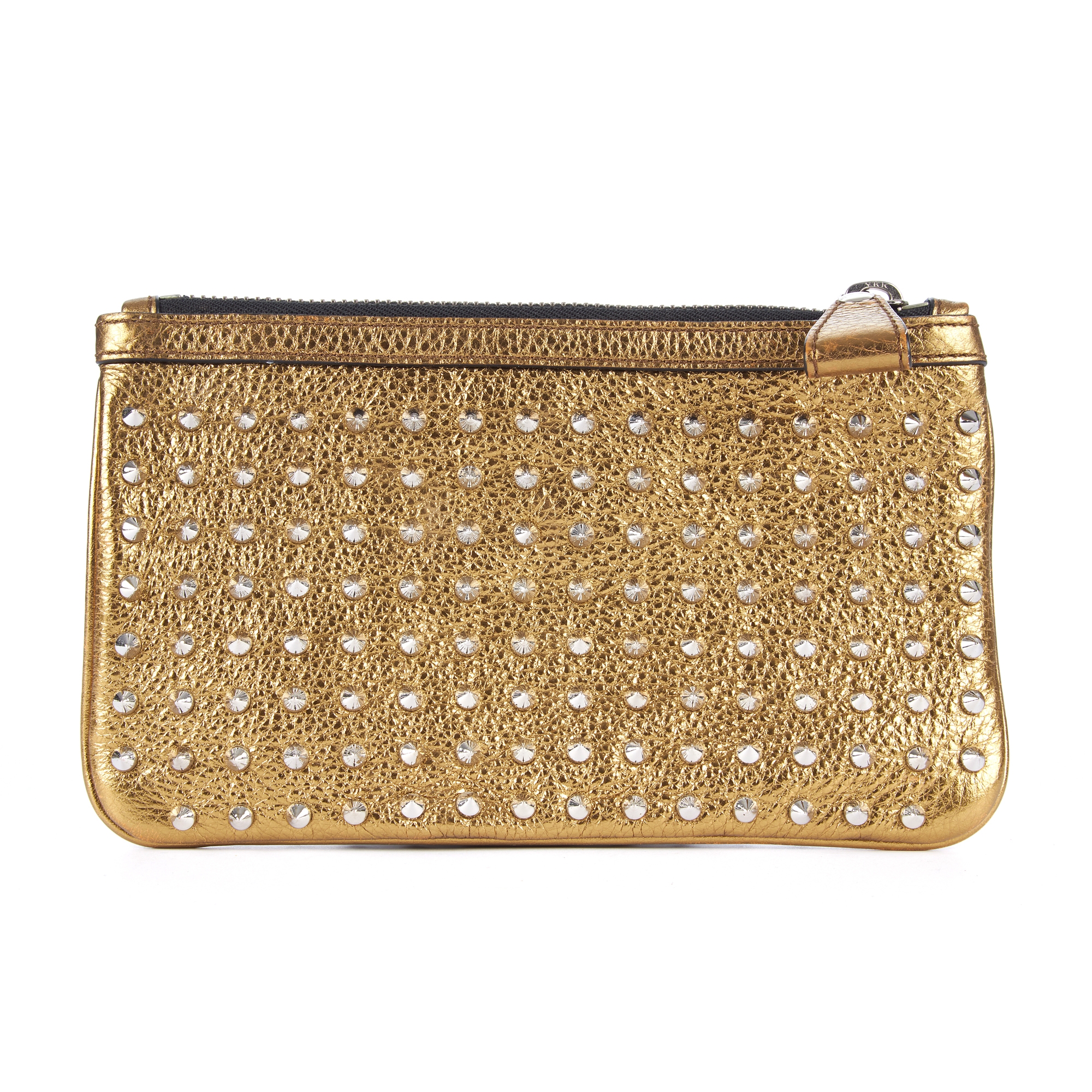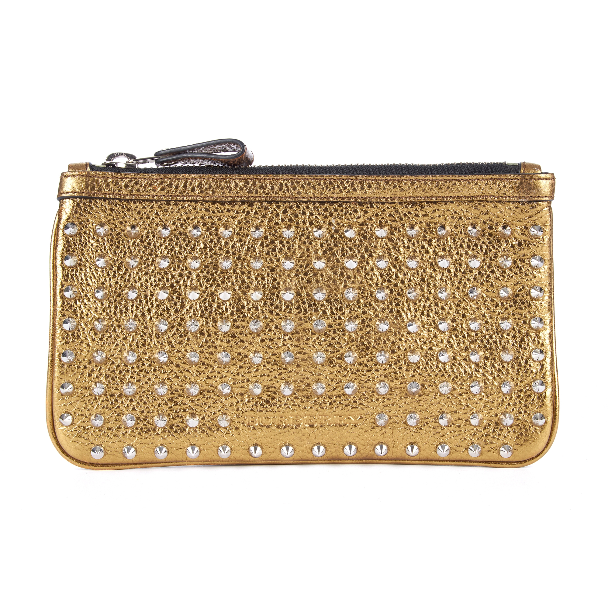 Burberry, a gold leather studded clutch, featuring silver-tone studded spike embellishments throughout and a top zip fastening, measuring 1 by 13.5 by 23cm