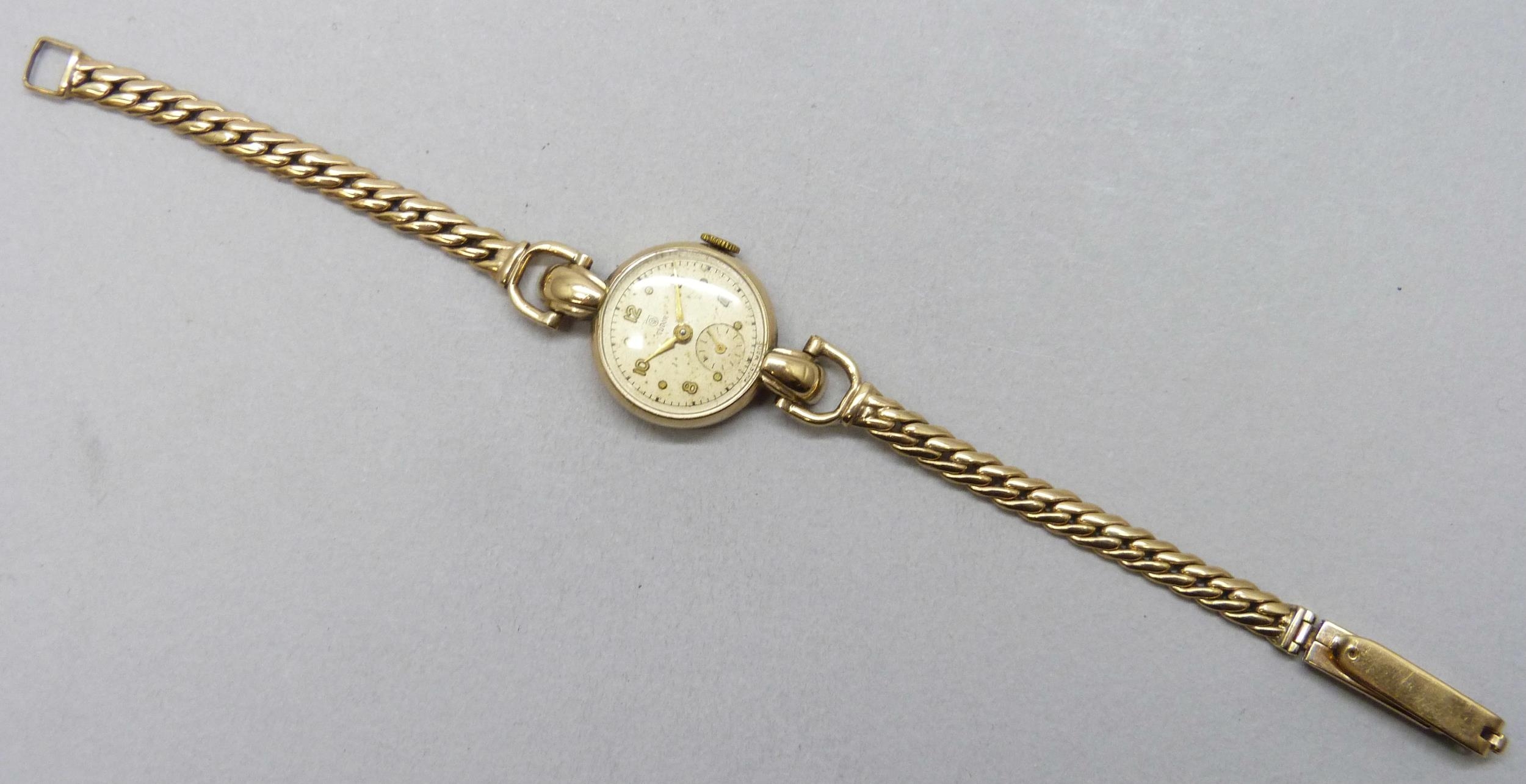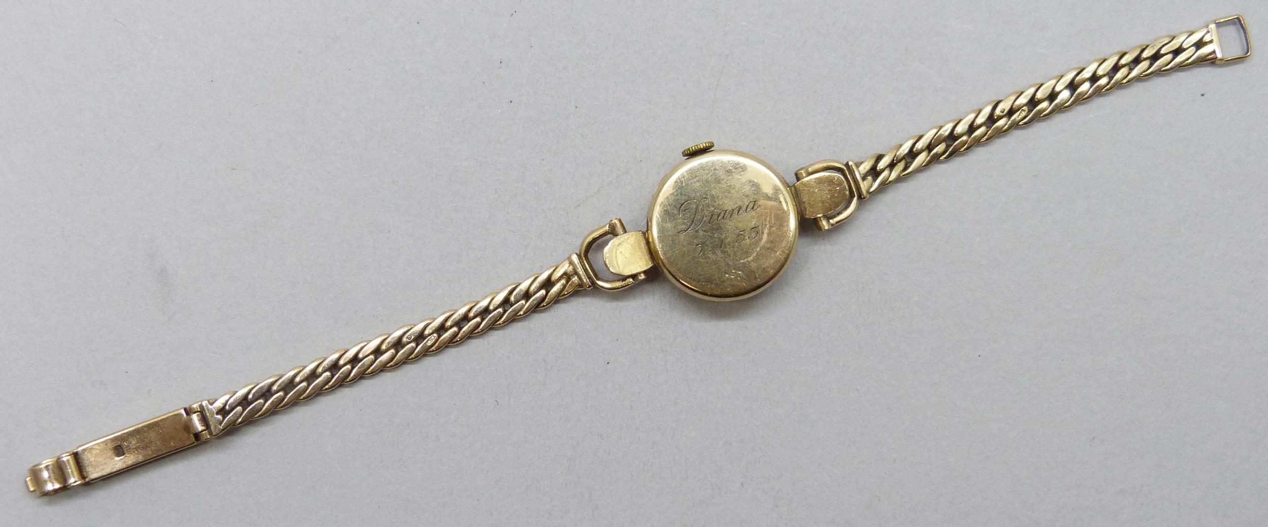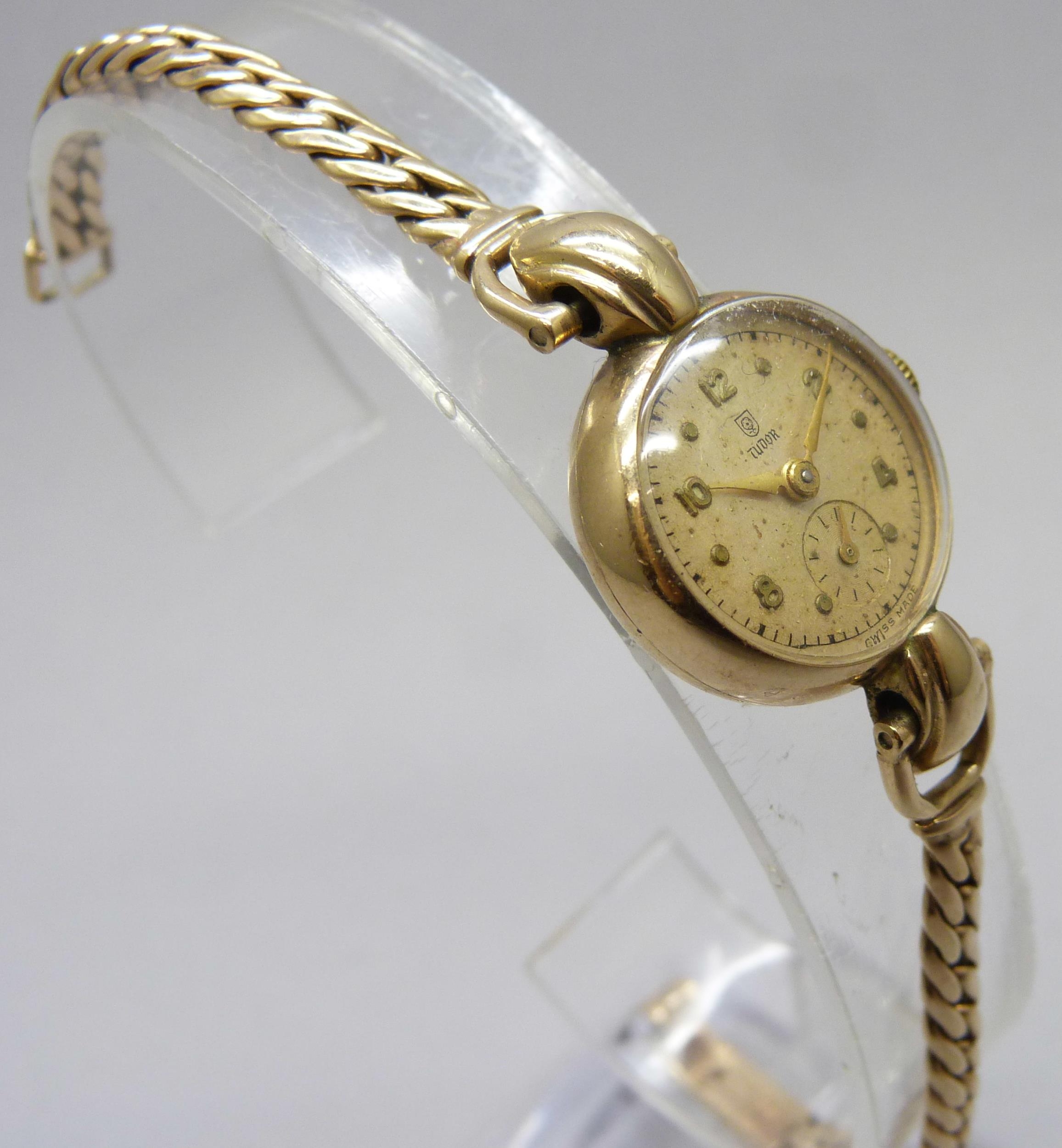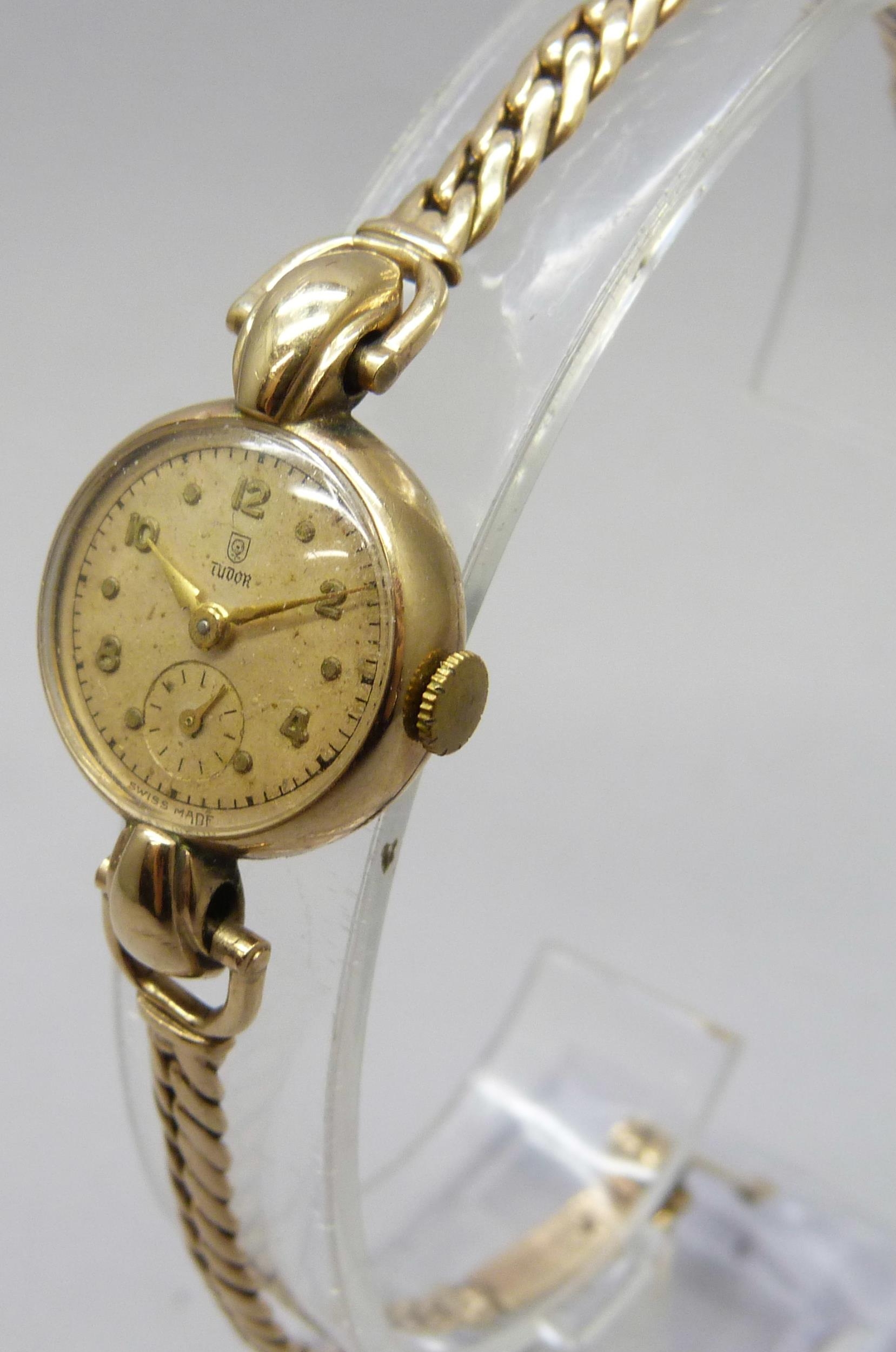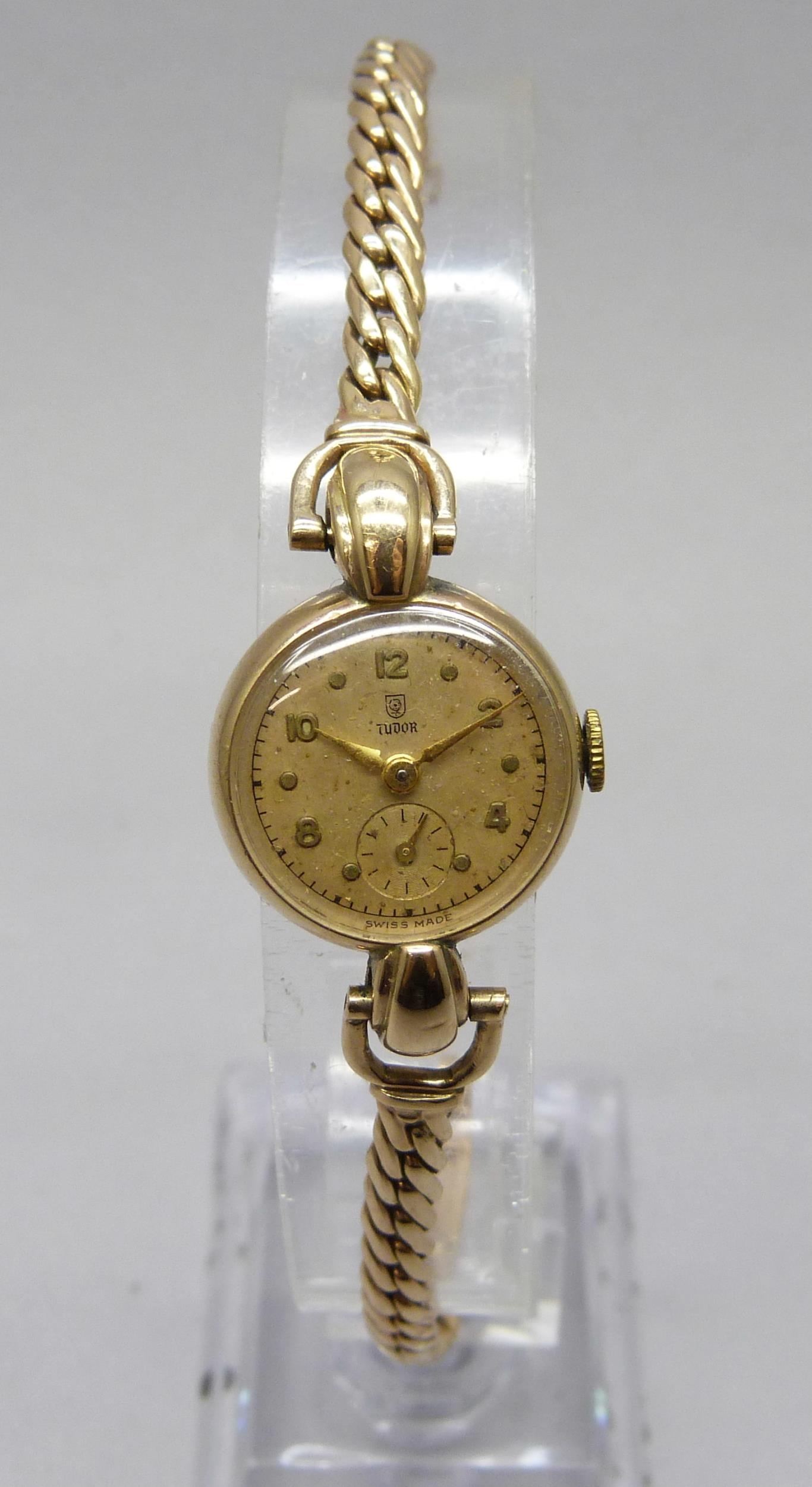 A lady's 9ct gold Tudor wristwatch on a 9ct gold bracelet strap, inner case marked Rolex Watch Company Ltd., 20mm including crown, 20.7g, 16.8cm bracelet, personalised inscription to case back