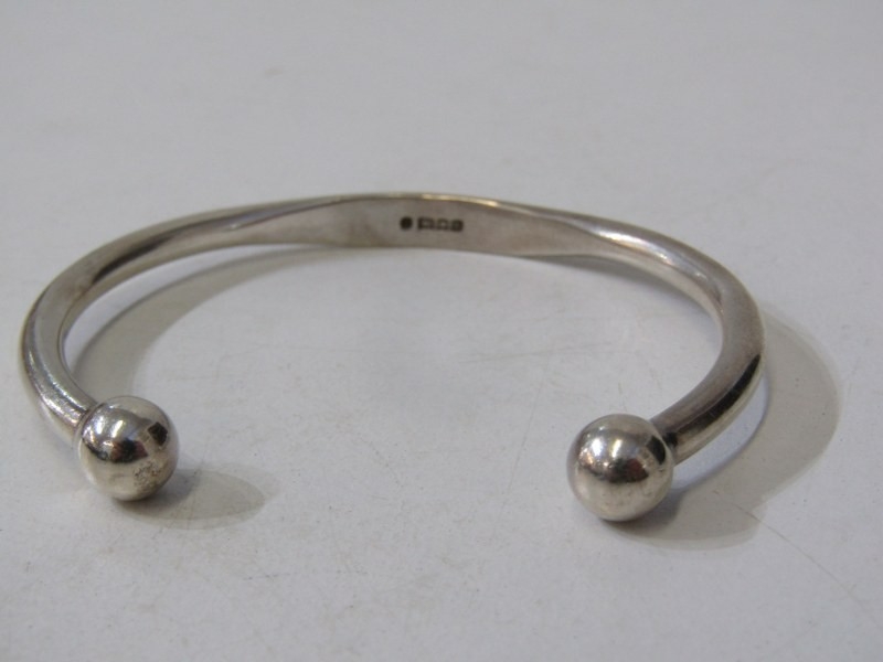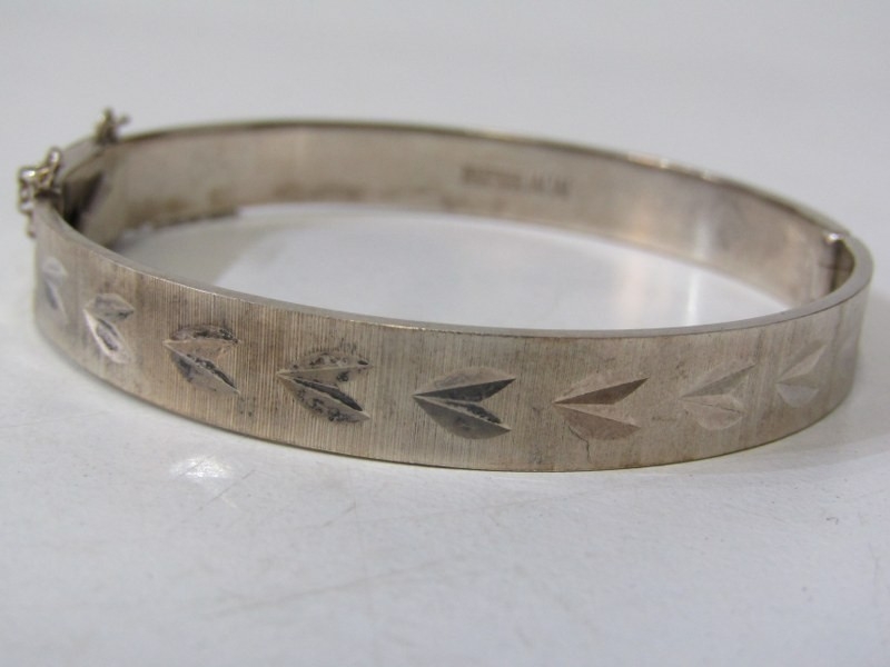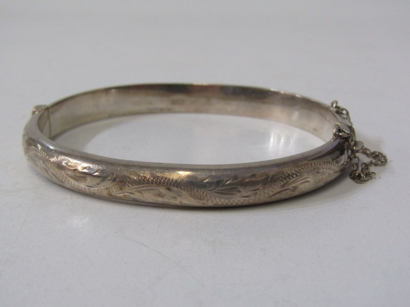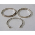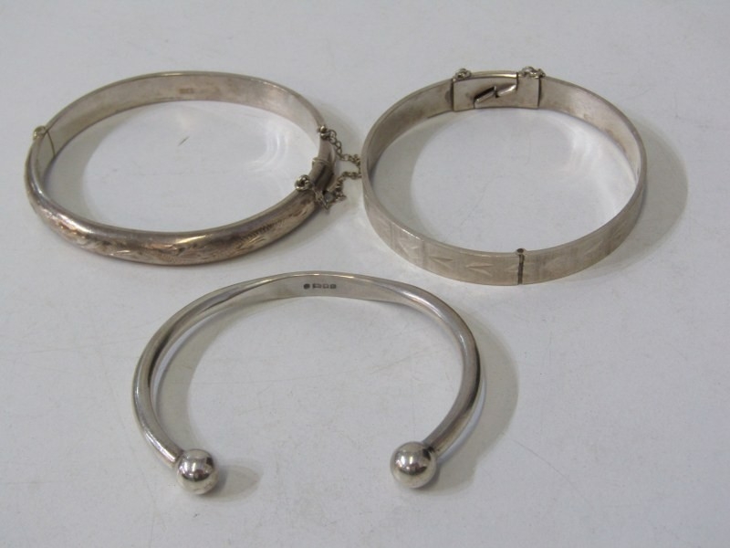 SILVER BANGLES, 2 silver hinged bangles, each with foliate engraved decoration, together with a silver torque bangle, 49.3 grams