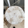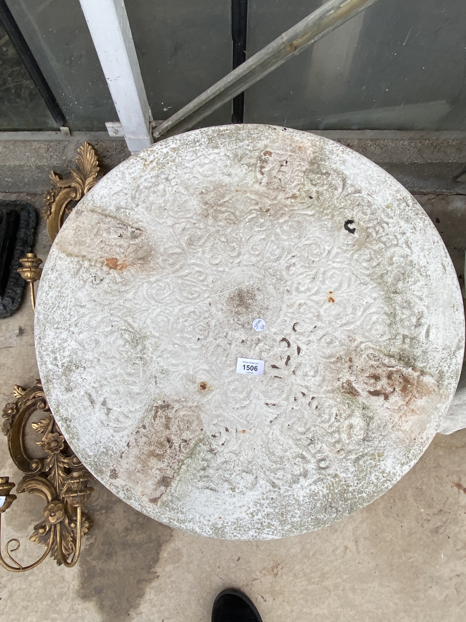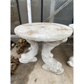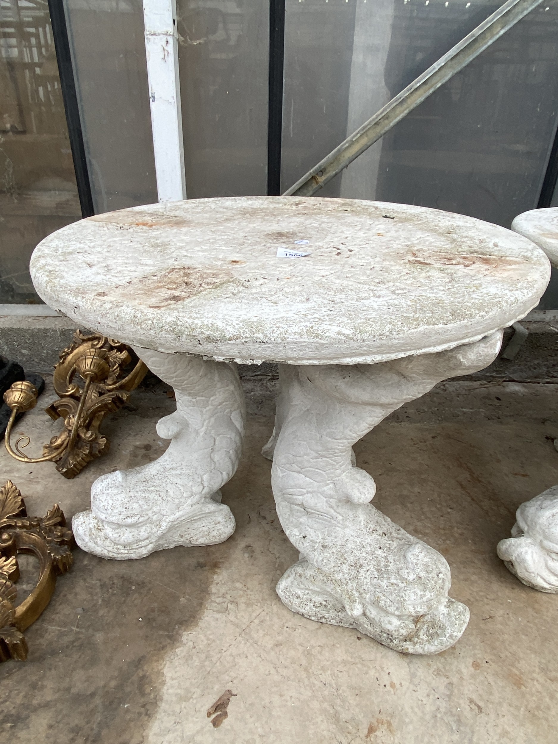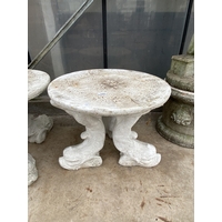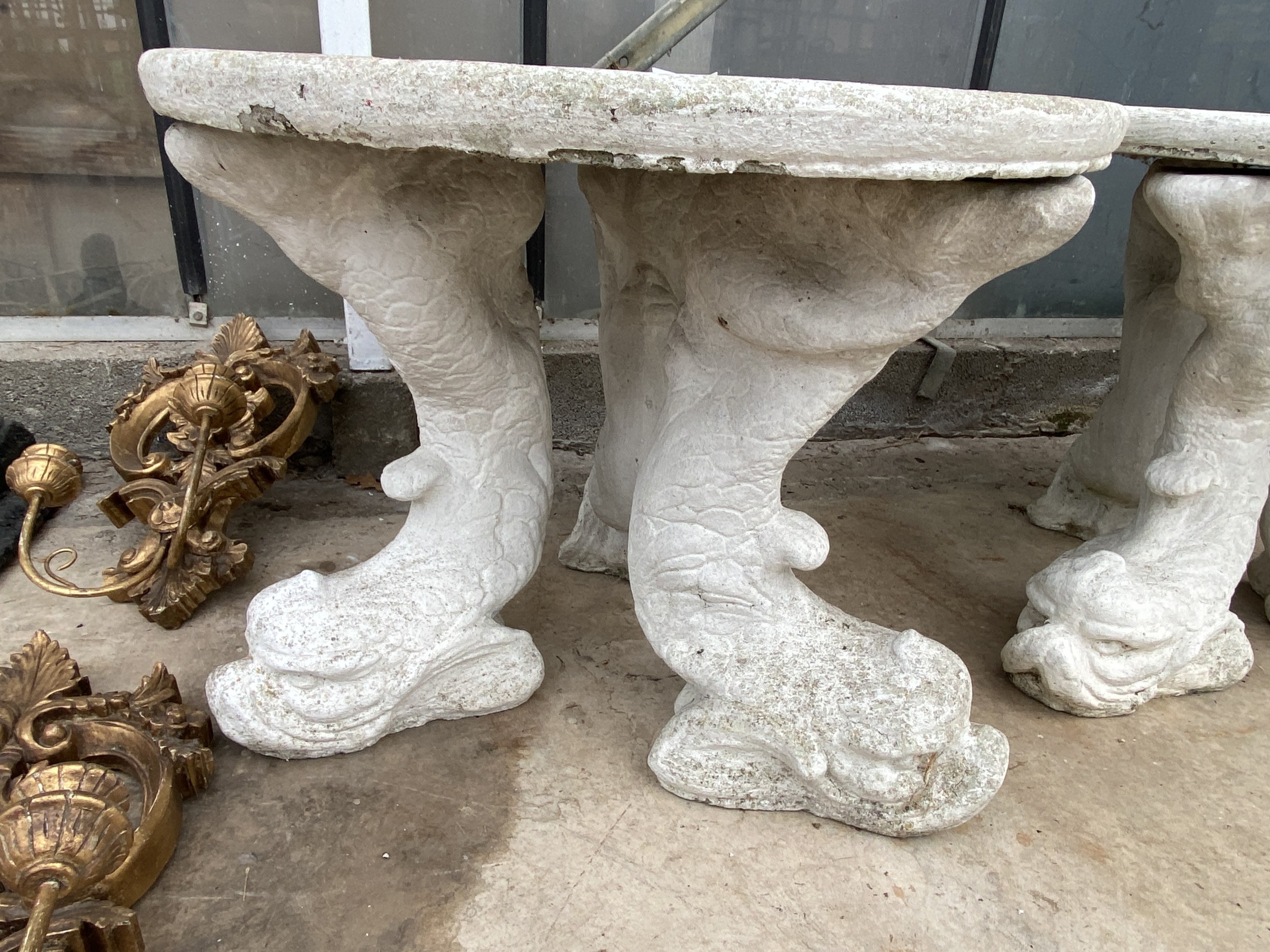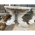 A PAINTED CONCRETE GARDEN TABLE WITH FISH PEDESTAL BASES
