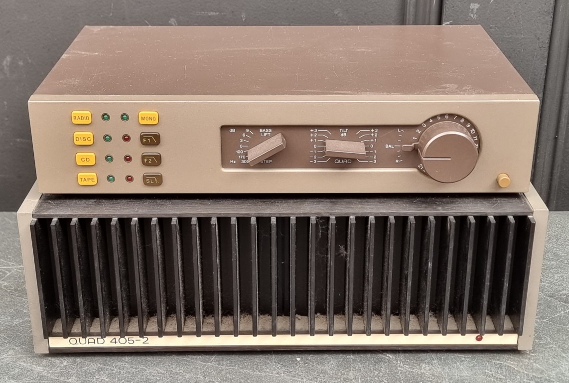 Hi-Fi: a Quad '34' pre-amplifier; together with a Quad '405-2' power amplifier, boxed; and associated cables.