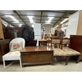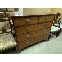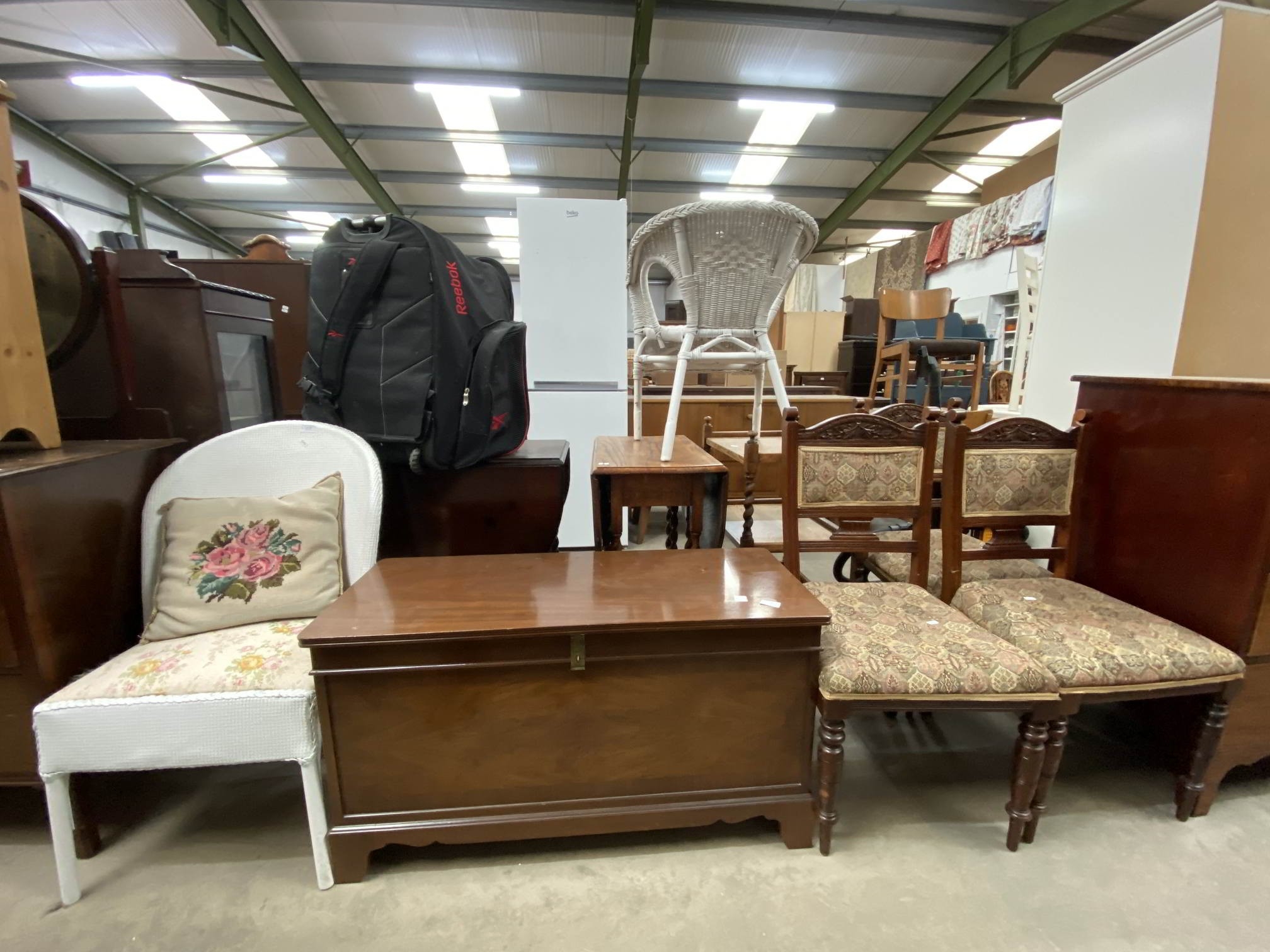 Victorian mahogany blanket box 54H 99W 41D, 3 mahogany framed Victorian side chairs 41W and a Lloyd Loom style bedroom chair