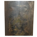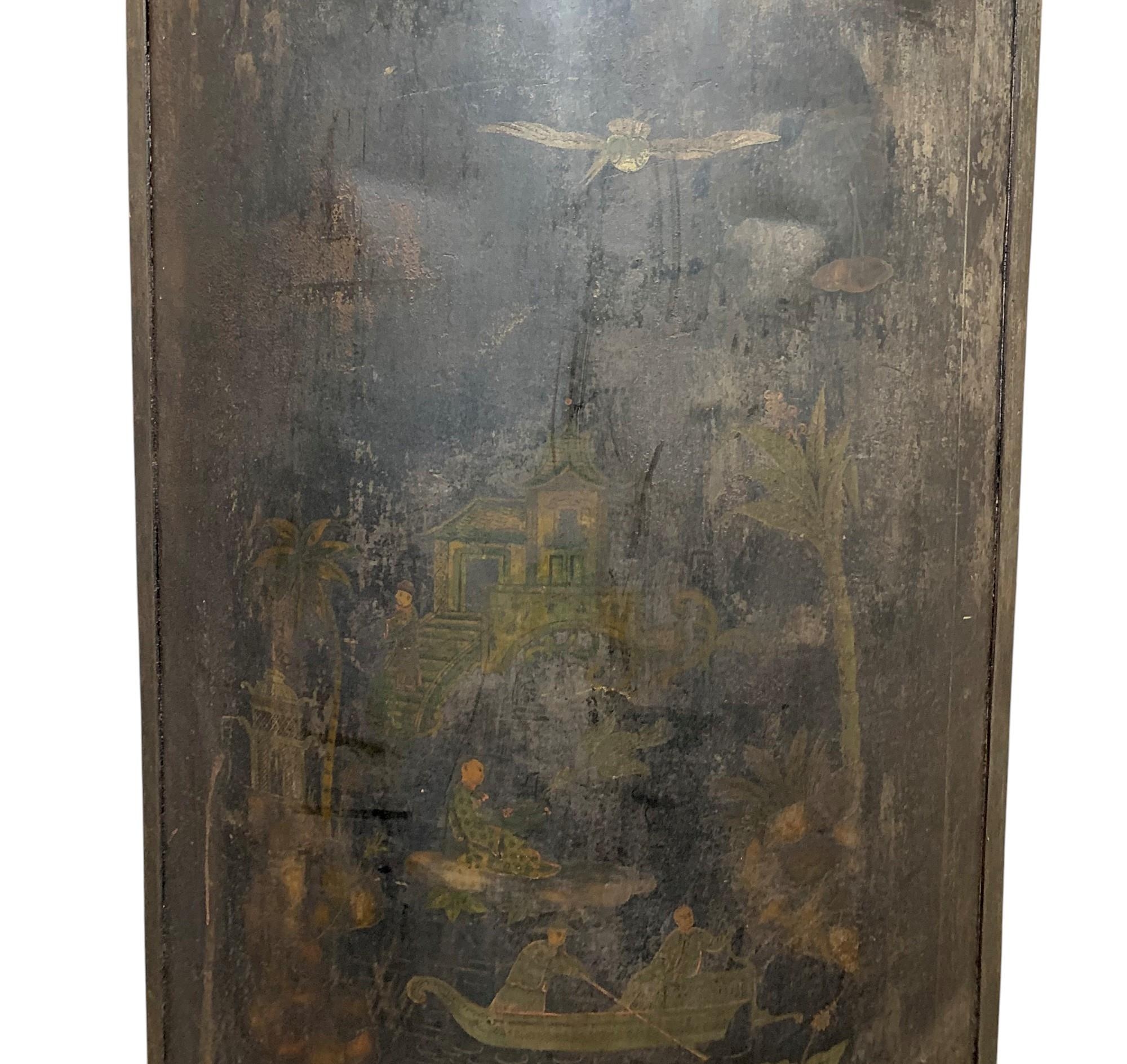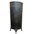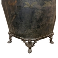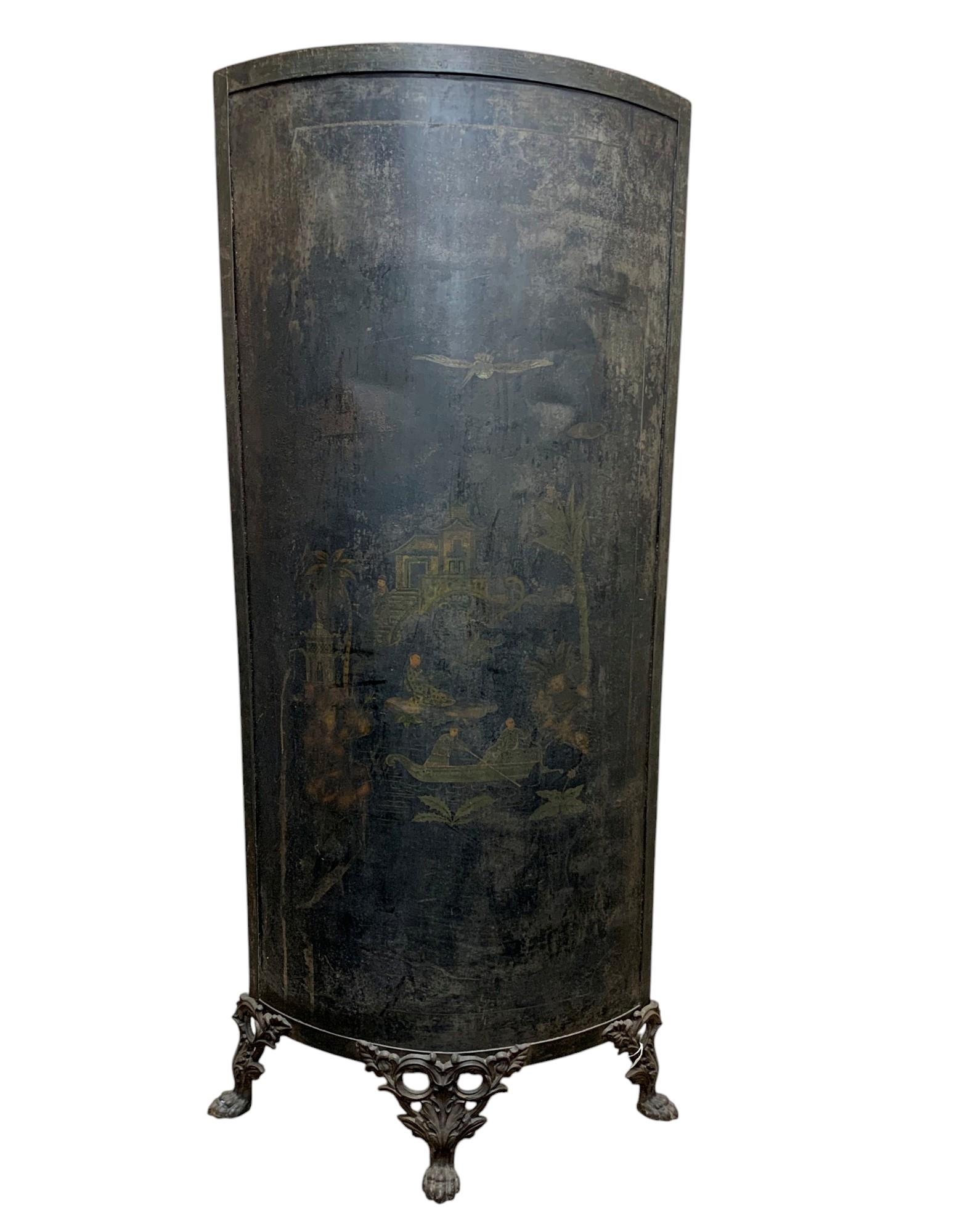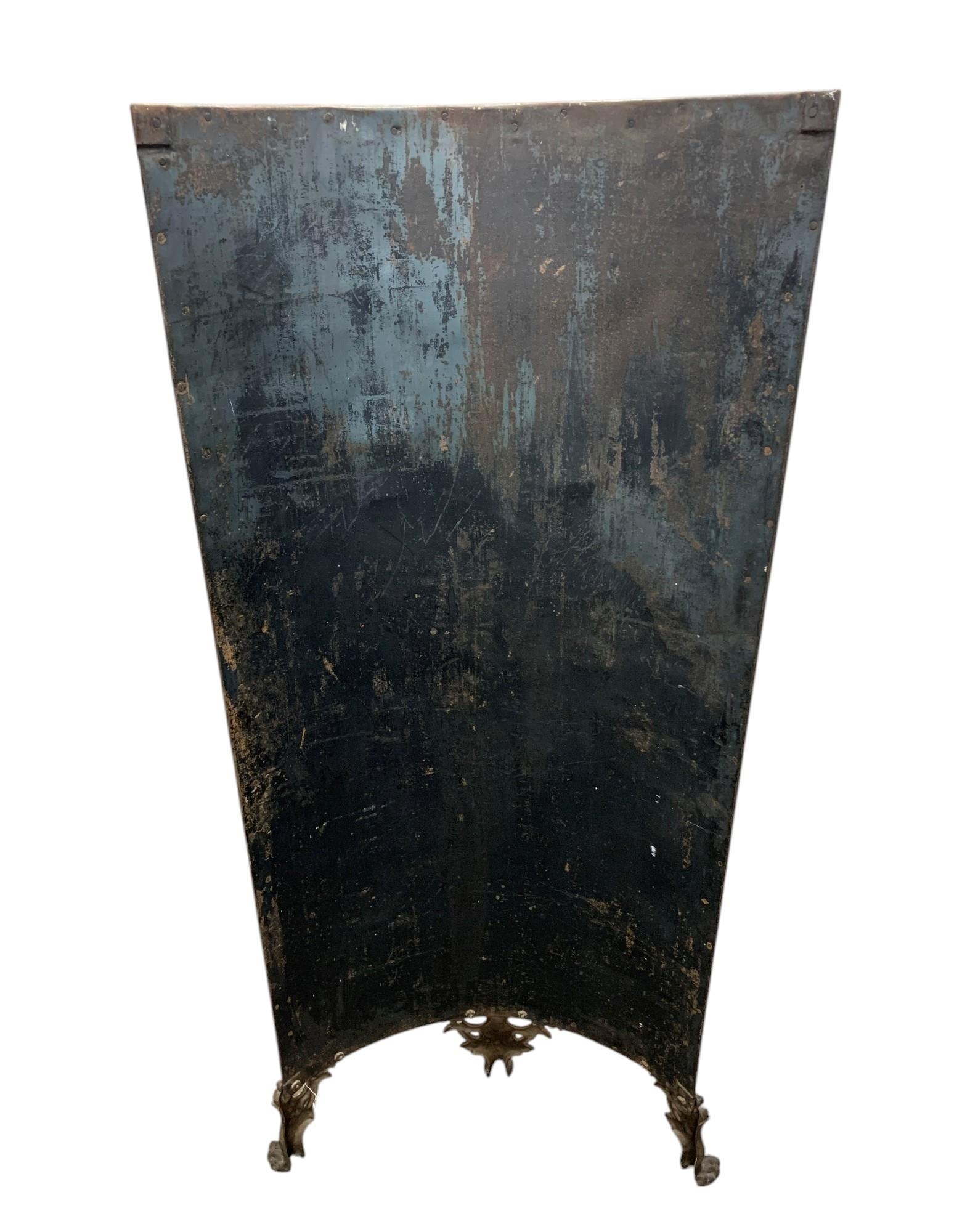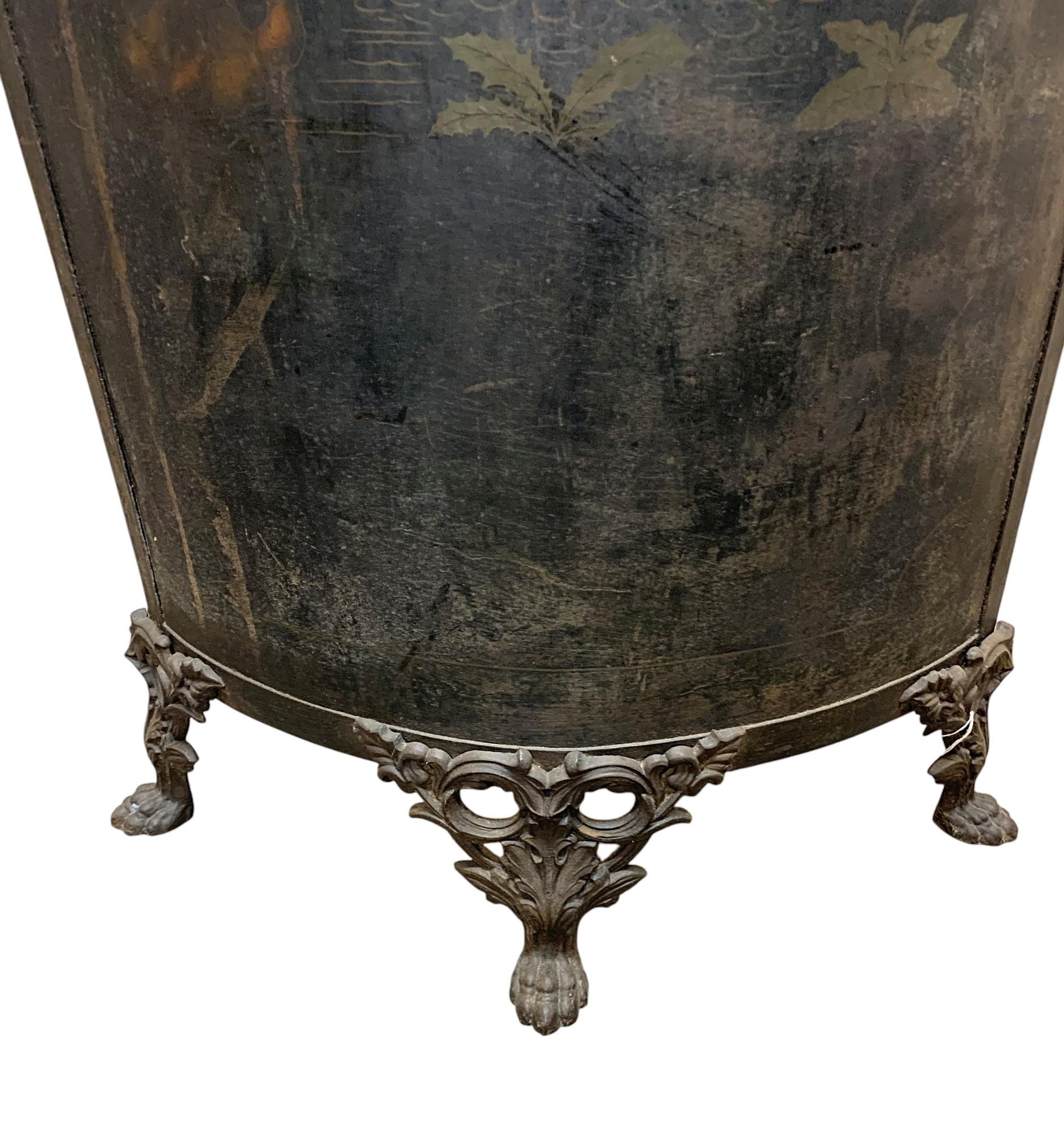 Unusual toleware bowed vanity screen, with Chinoiserie overlay, in three cast iron paw feet, 168 x 72cm