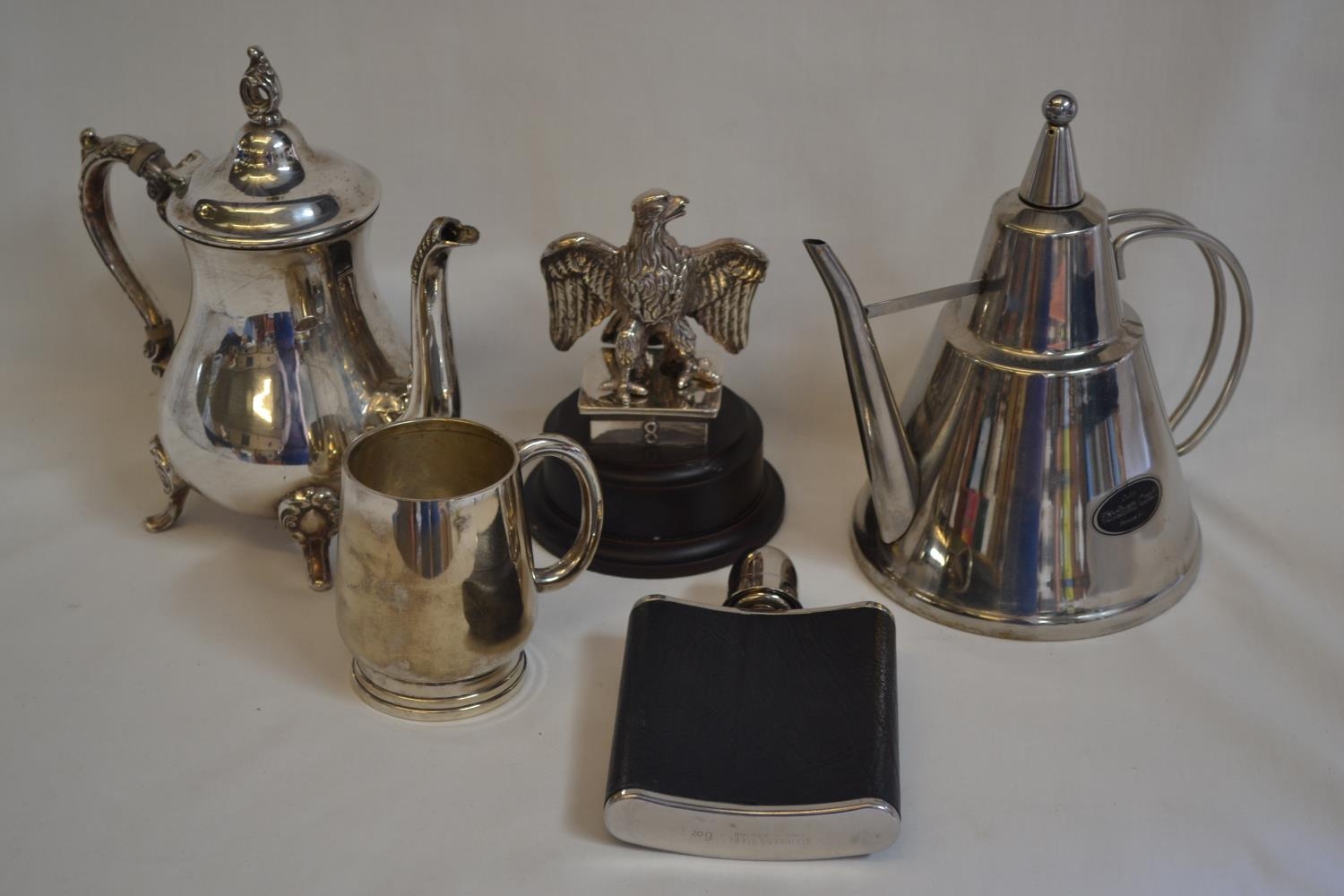 SILVER PLATED TEAPOT, HIP FLASK, ETC