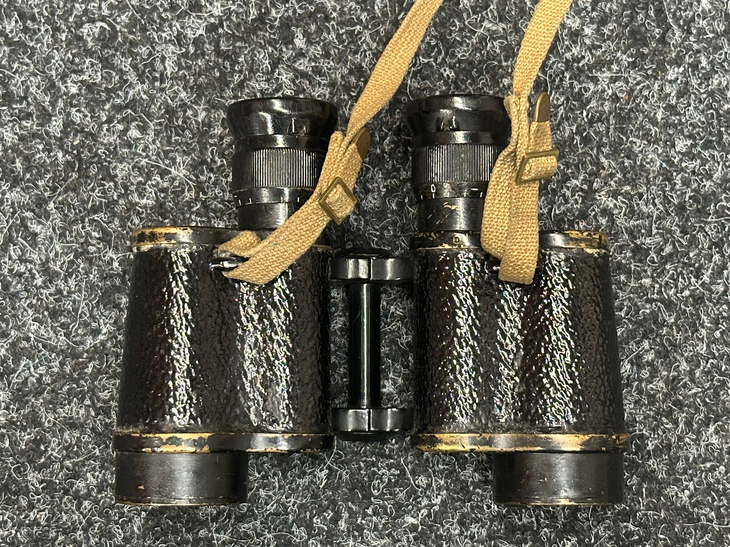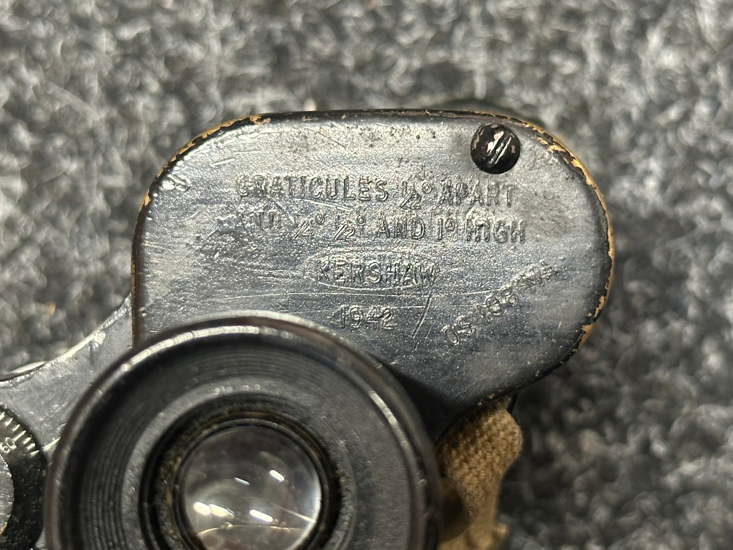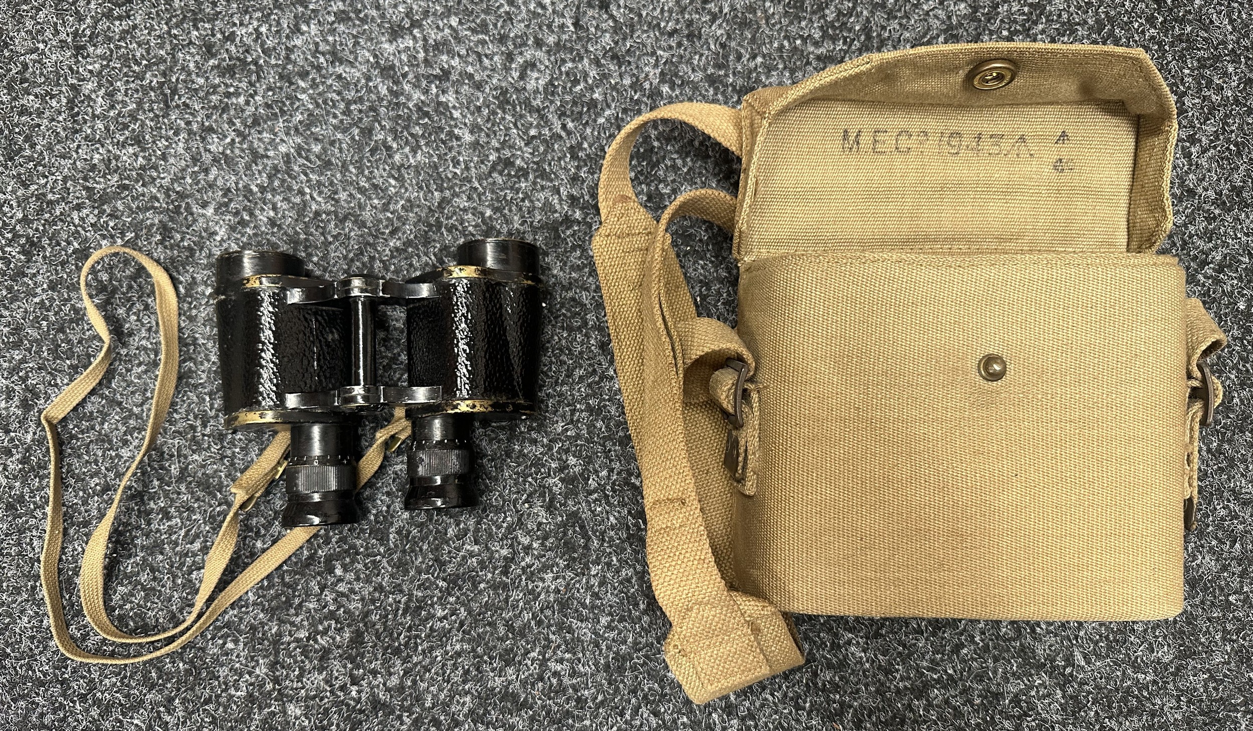 WW2 British Binoculars Prism No.2 MK2 x 6 serial number 139018. Maker marked and dated "Kershaw 1942". Complete with webbing neck strap and 1937 pattern webbing case maker marked and dated "MECo 1943" with sling.